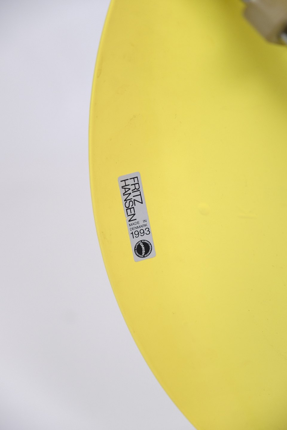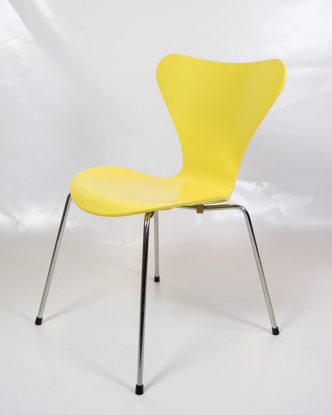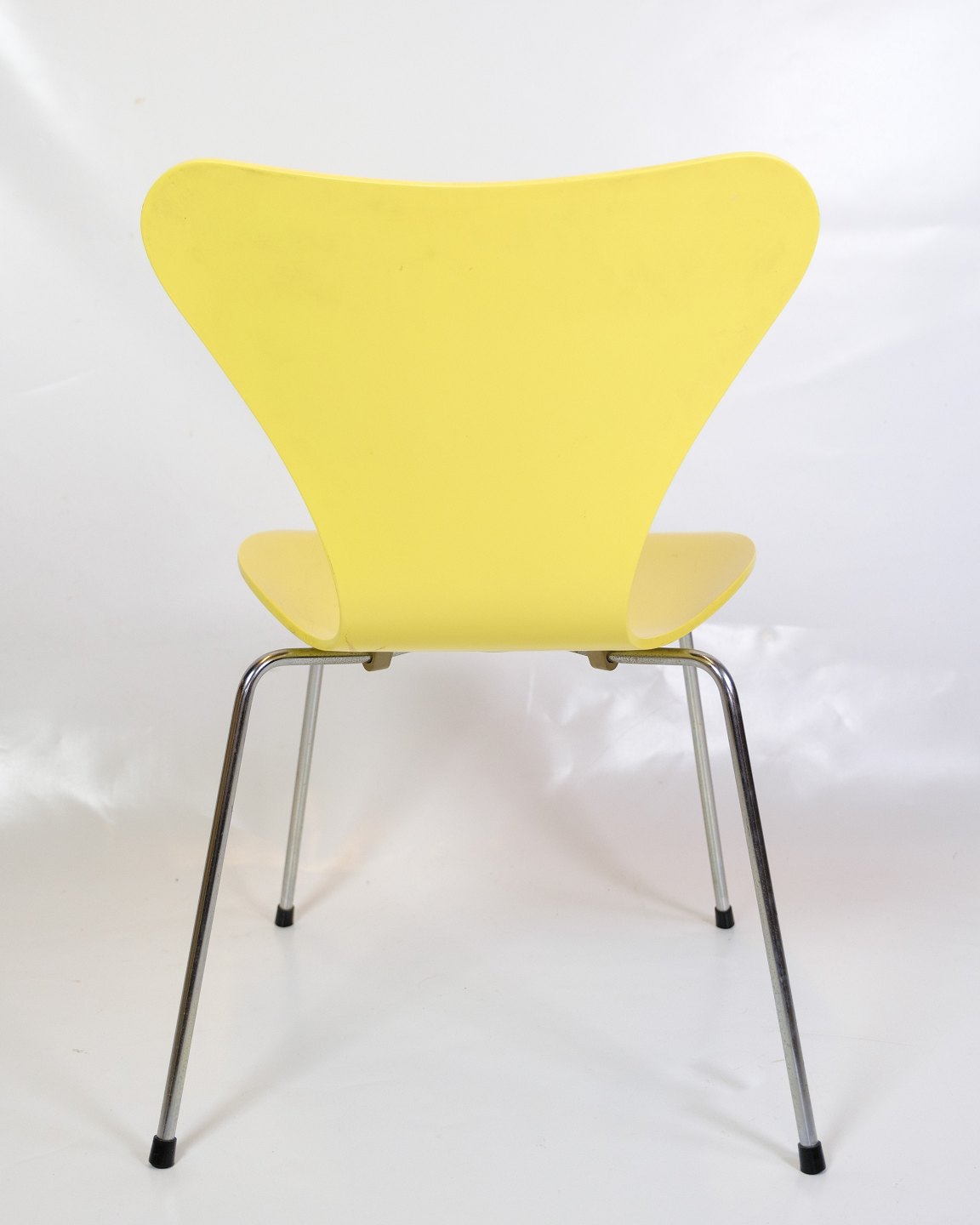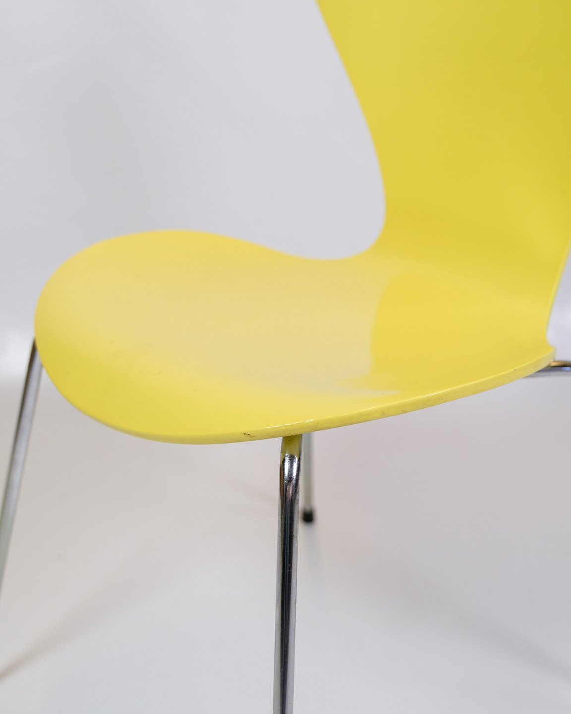 Set of 6 dining chairs, model 3107, also known as the "Seven chair", designed by Arne Jacobsen and produced by Fritz Hansen in the 1990s. The chairs are lacquered in a yellow colour, which gives them an elegant and timeless look. The Syver chair is known for its comfortable and iconic shape, which combines functionality with a stylish design.