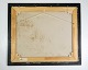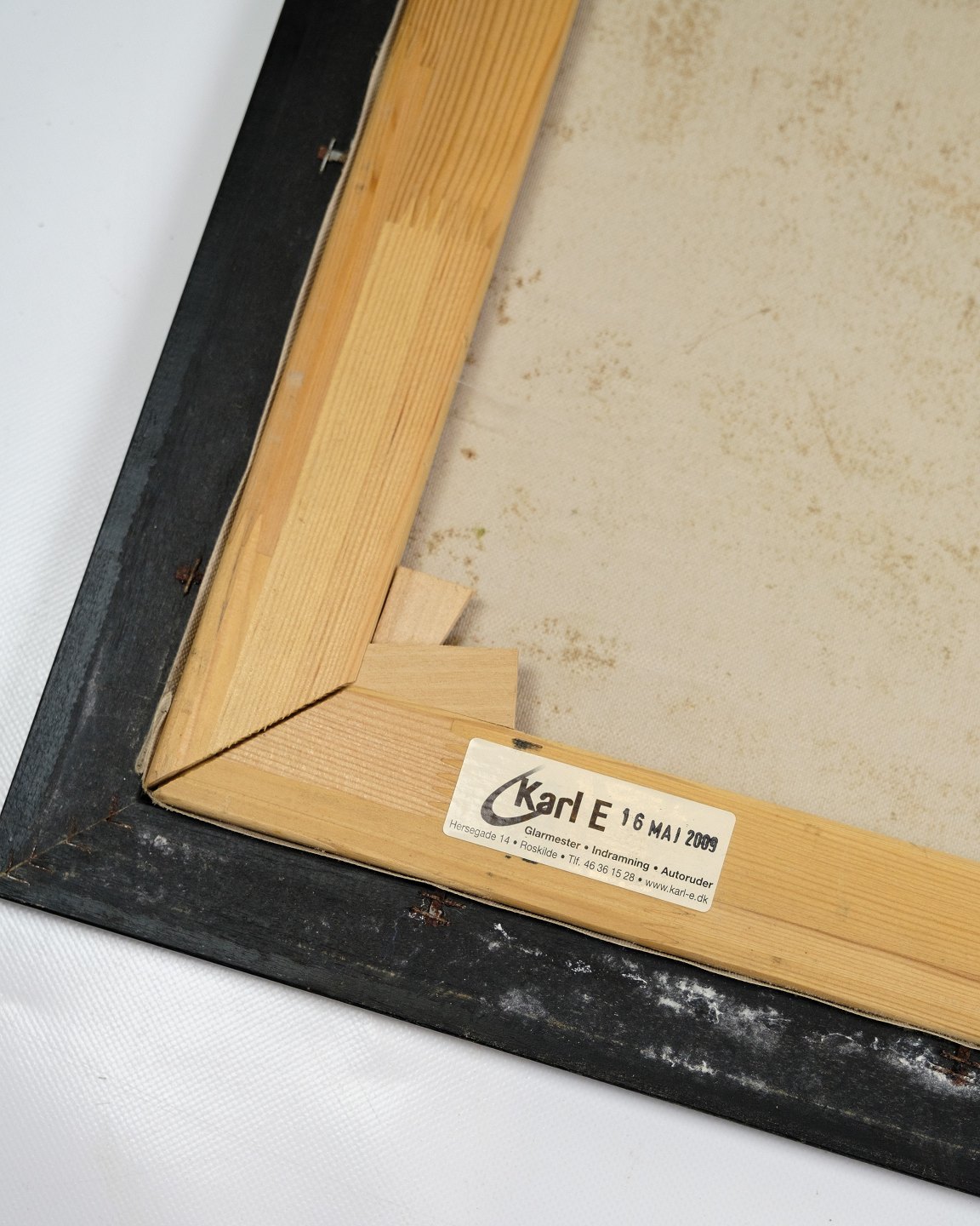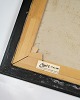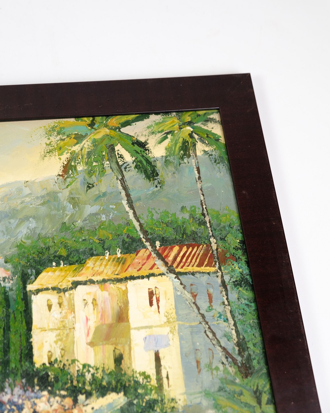 Oil painting framed in a black wooden frame with motif of a coastal town with warm colors. Signed by Mary L.