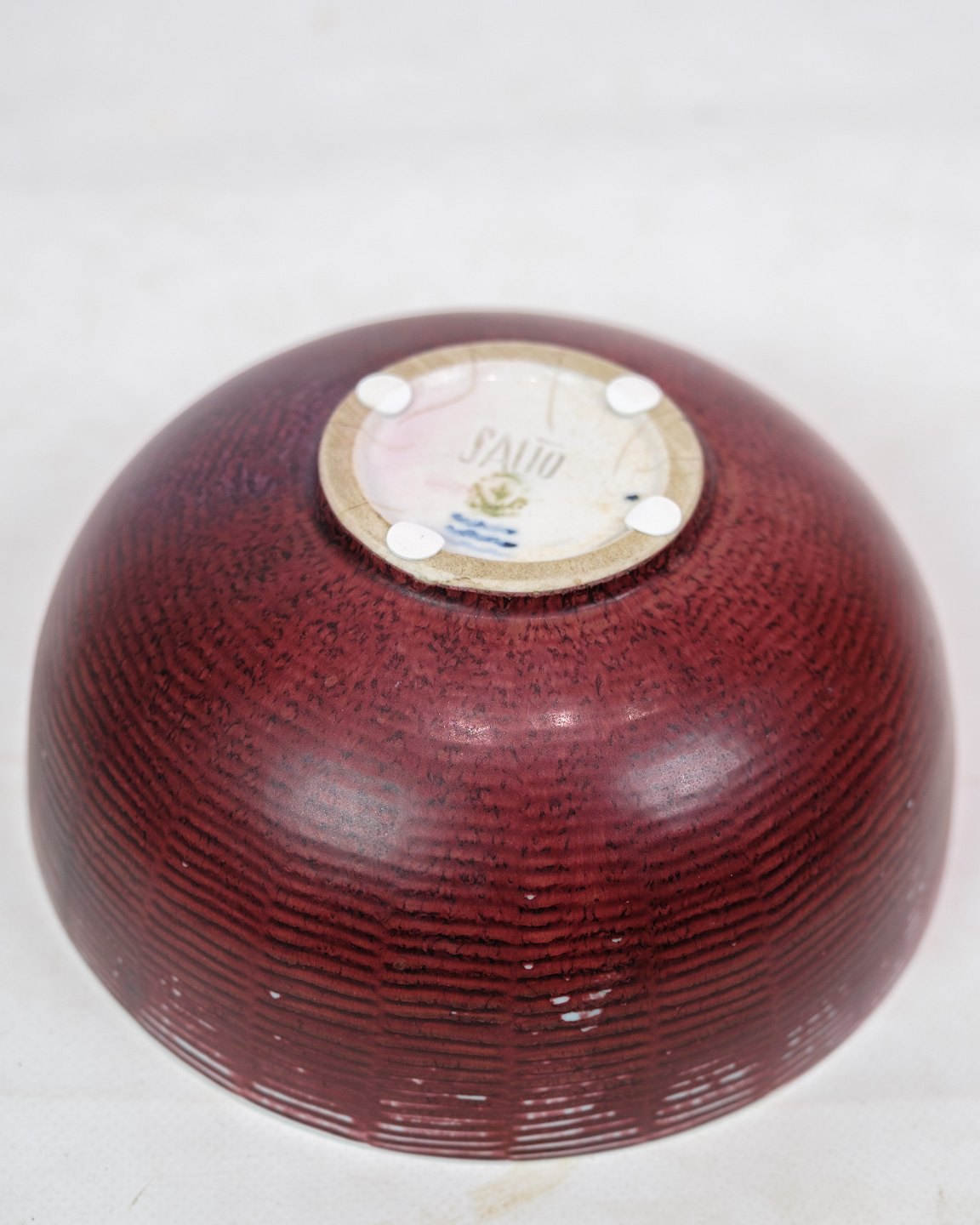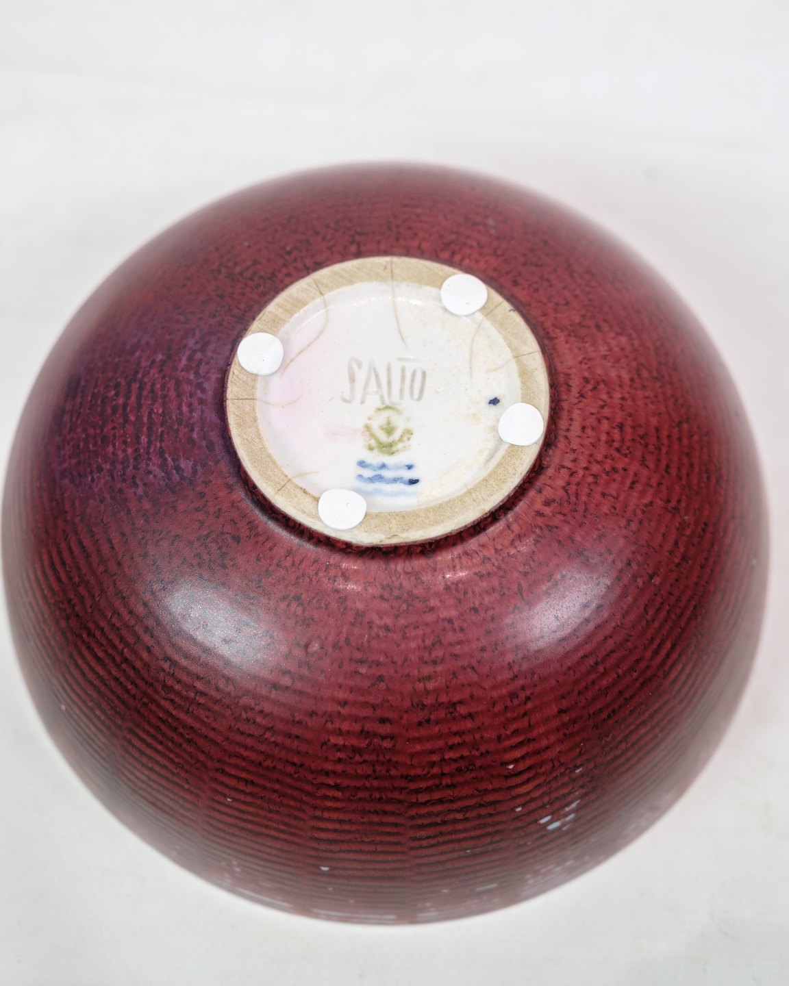 Axel Salto (1889-1961) is one of Denmark's most recognized ceramists and artists. He worked closely with Royal Copenhagen and created organic forms inspired by nature. His works are often characterized by his experiments with glazes and his use of nature-inspired forms such as spirals, knobs and ribs, making each piece unique. The oxblood colored glaze is part of his exploration of strong colors and surfaces, which have made his ceramics sought-after collectibles both in and outside of Denmark.
