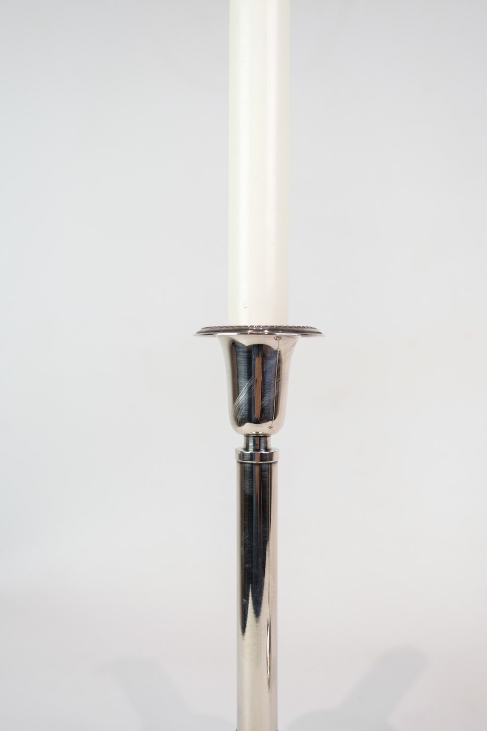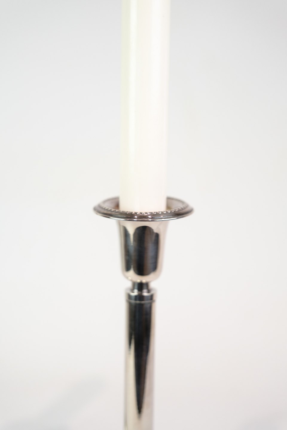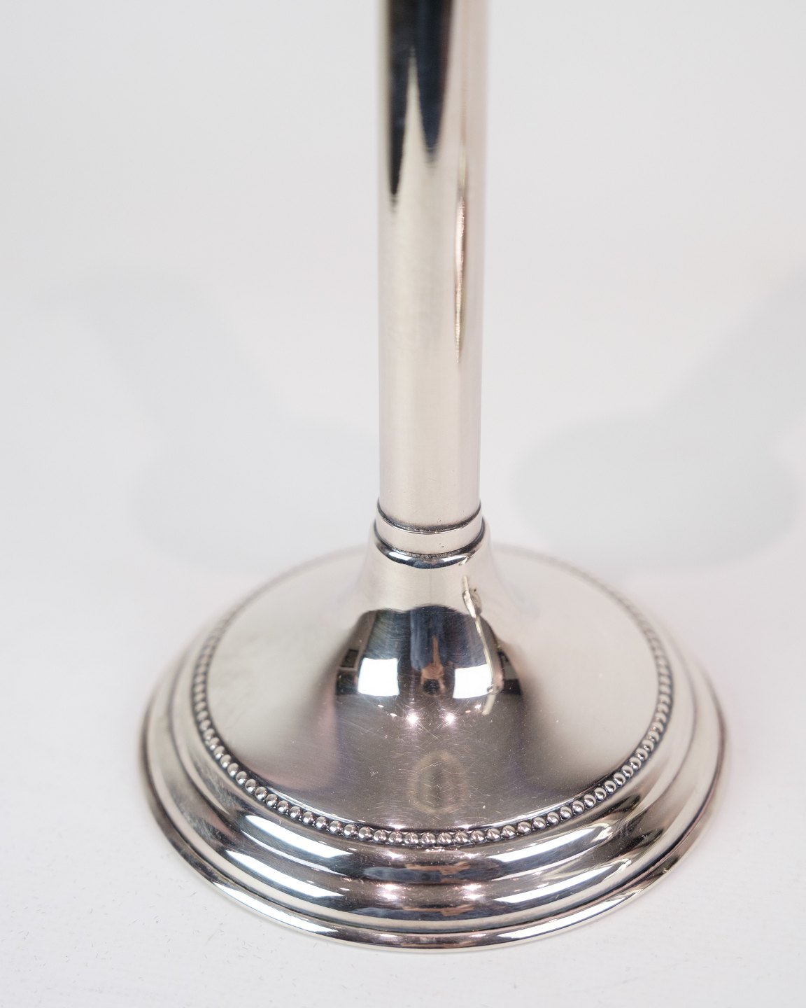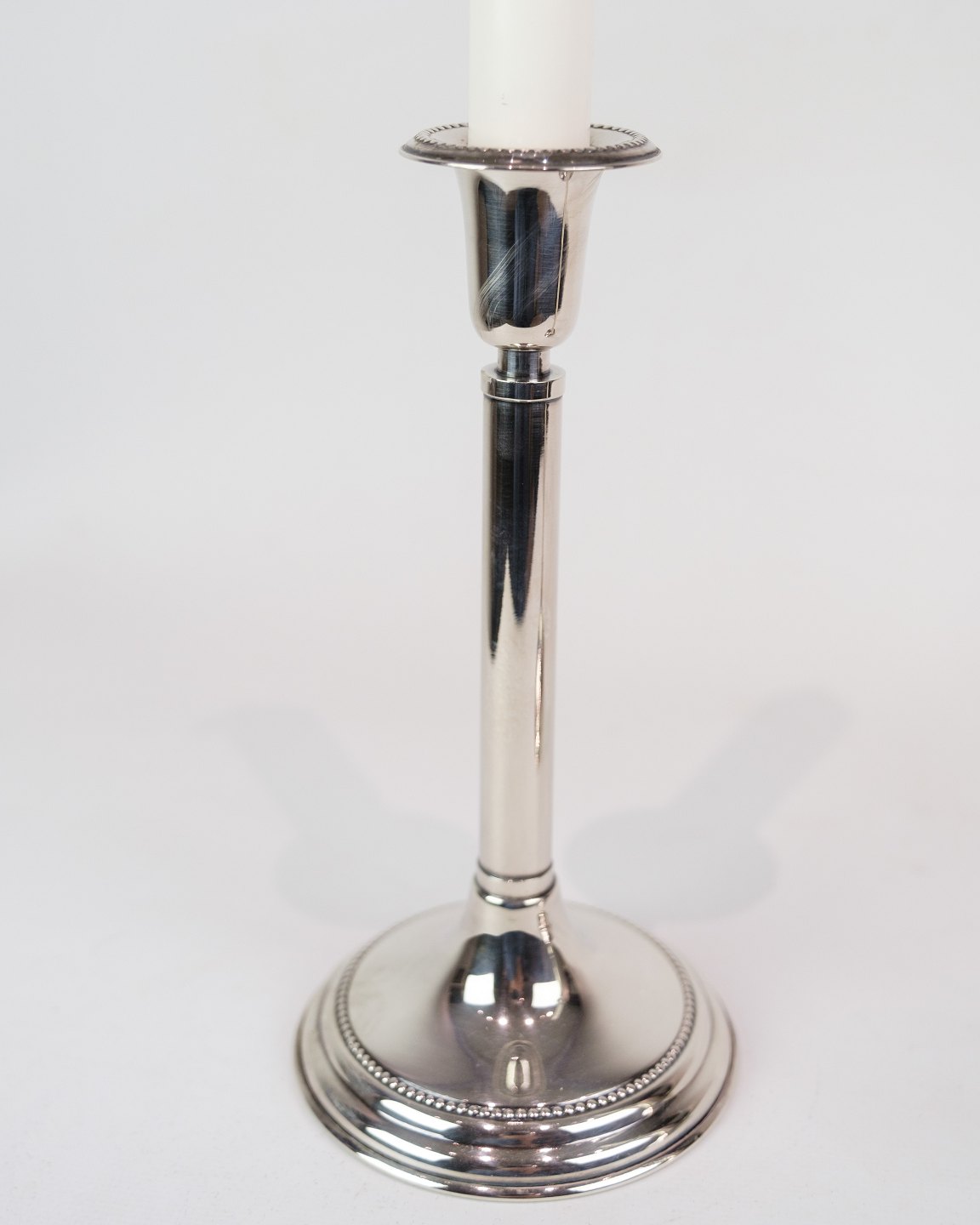 Sæt af 2 lysestager i forsølvet messing fra 1930'erne, dekoreret med en elegant perlekant ved foden. Lysestagerne kombinerer klassisk design med detaljerigdom, hvor den fine perlekant tilføjer et tidstypisk dekorativt element. Deres forsølvede overflade giver dem et tidløst udseende, og den solide messingstruktur sikrer både holdbarhed og stabilitet.