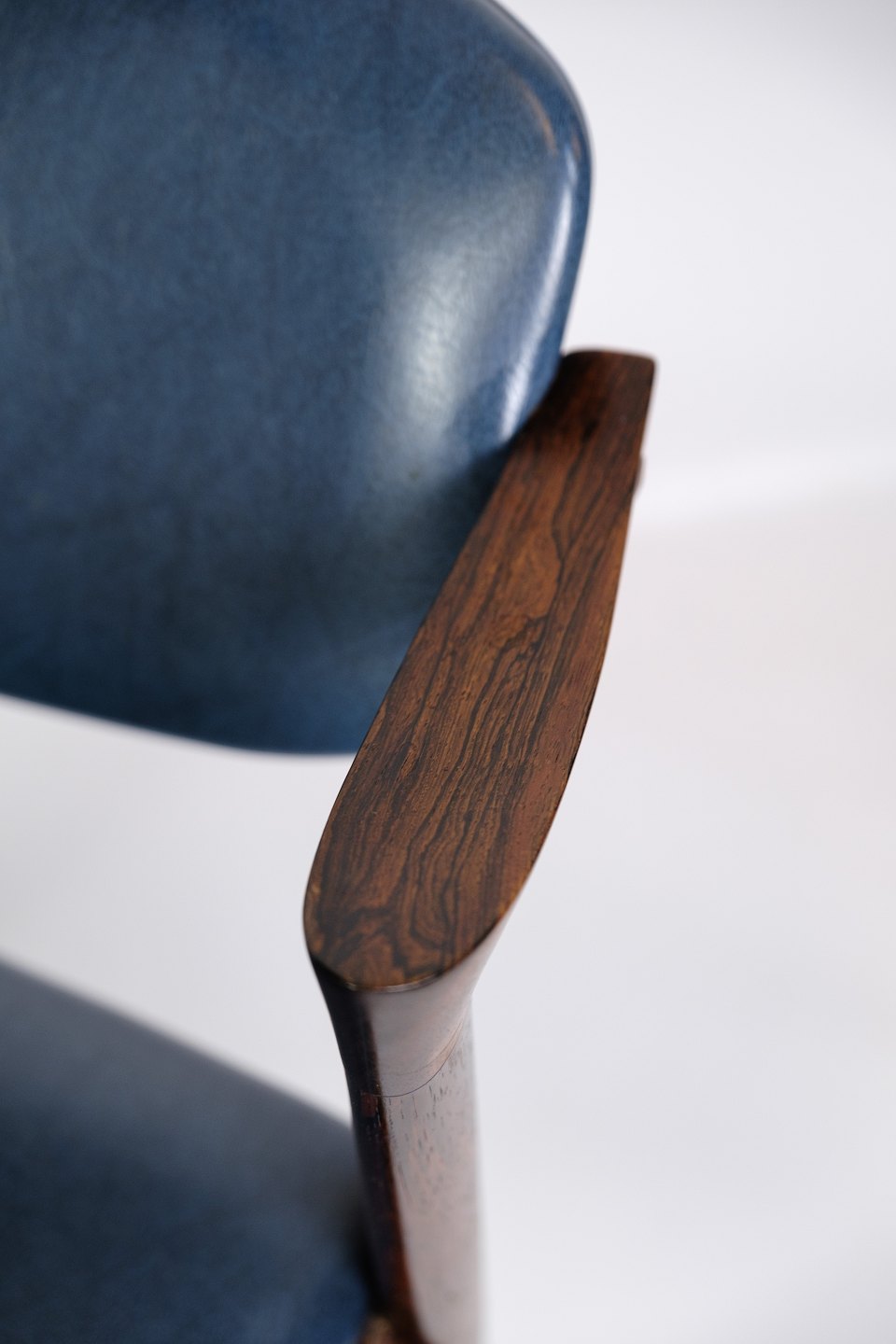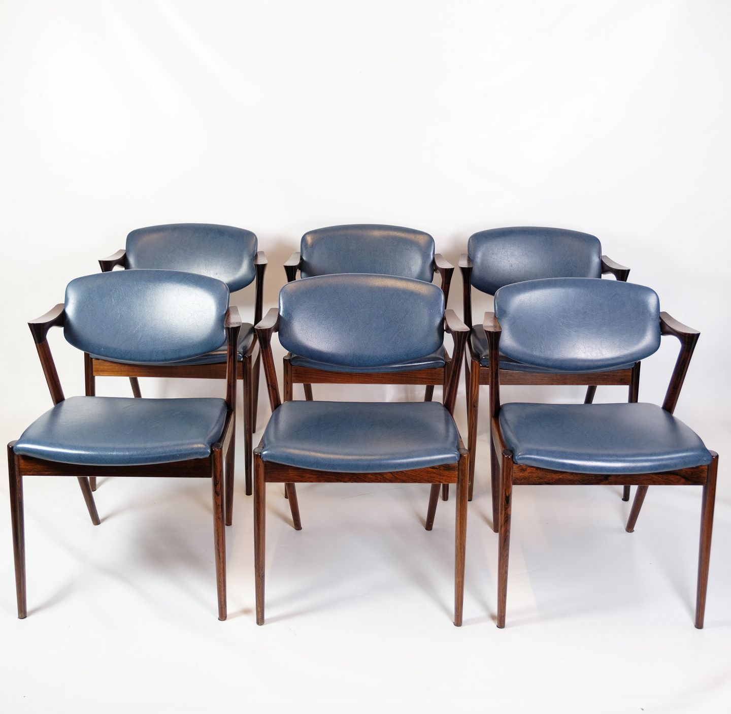Set of 6 dining table chairs in rosewood with blue leather upholstery, designed by Kai Kristiansen. The chairs have a frame in rosewood, which shows the beautiful grain patterns in the wood, and they are upholstered with blue leather, which is both comfortable and durable.