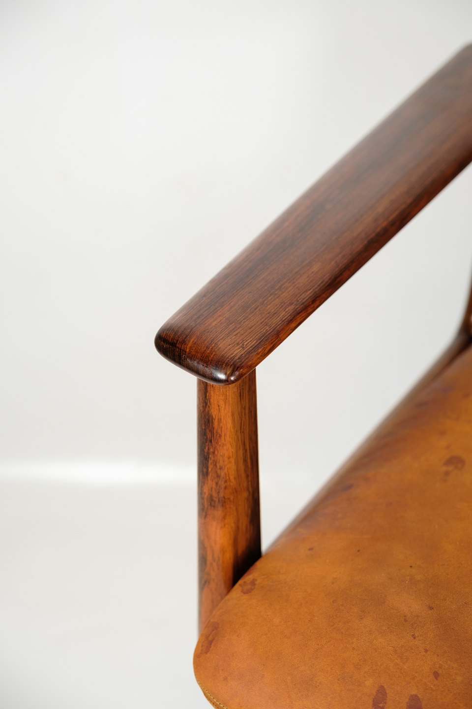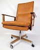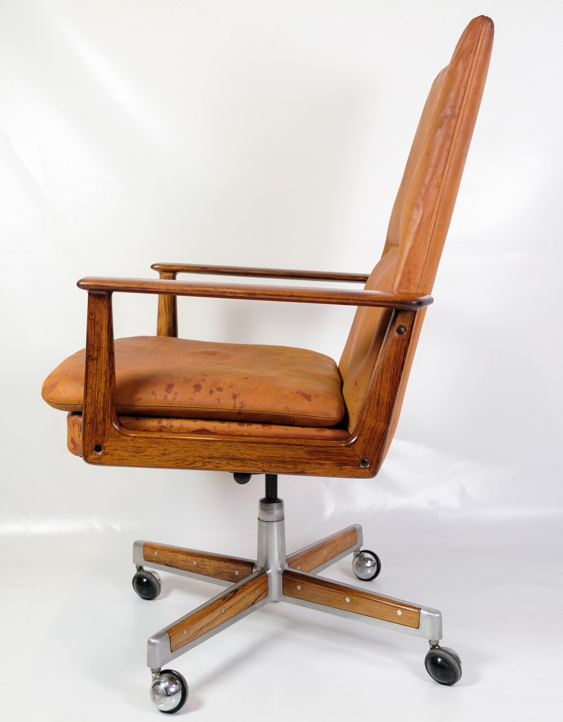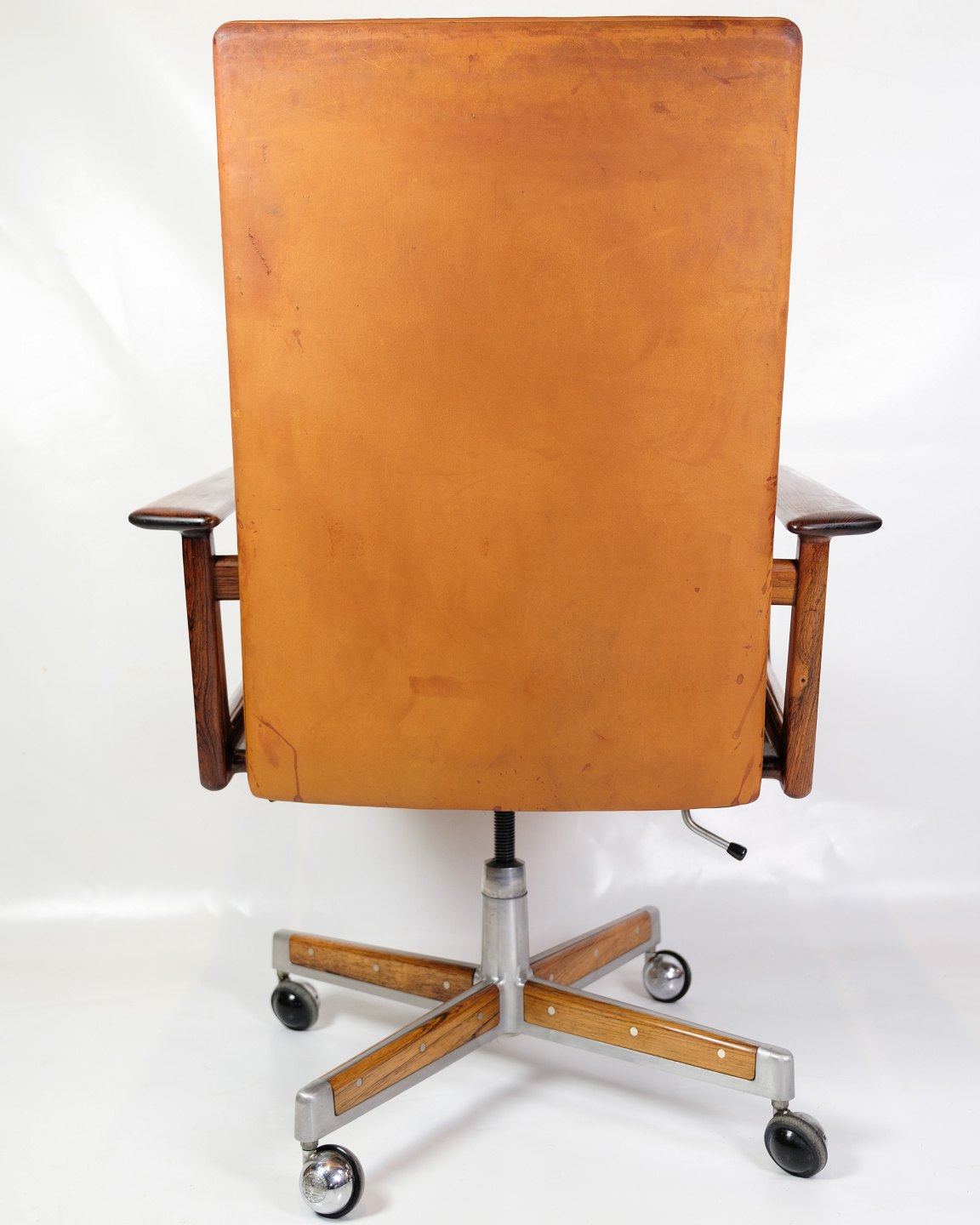 SoldOffice chair, Model 419 with a frame of rosewood, seat and back upholstered in cognac leather. And a five-star base of rosewood and metal, mounted on wheels. Designed by Arne Vodder and manufactured by Sibast Møbler from the 1960s. The office chair is in excellent condition.