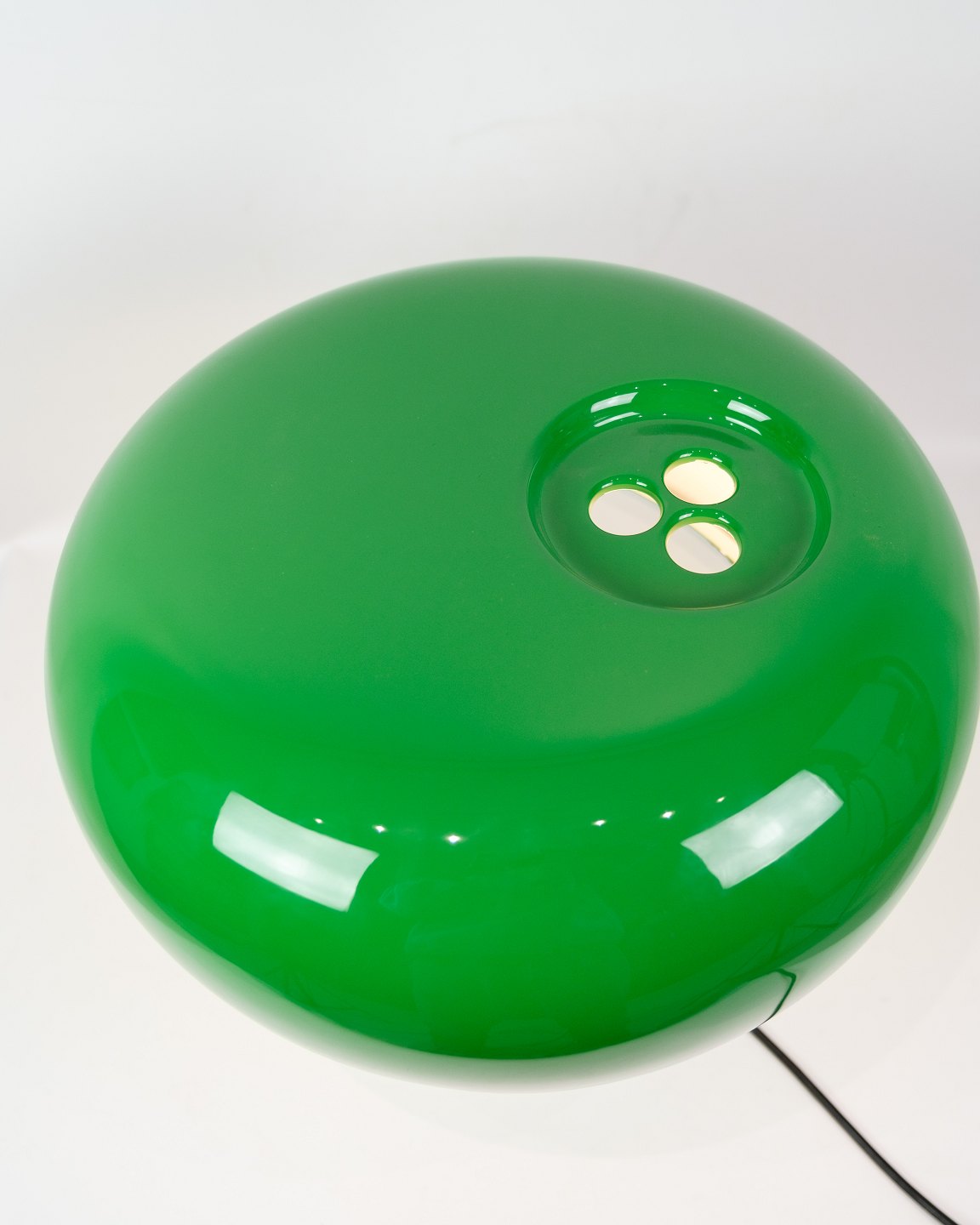 Bordlampe med grøn emaljeret metalreflektor og hvid Carraras marmorfod. lampen blev designet af Achille og Pier Giacomo Castiglioni i 1967. Lampen er fremstillet af Flos og lyset fra lampen skaber en hyggelig stemning.