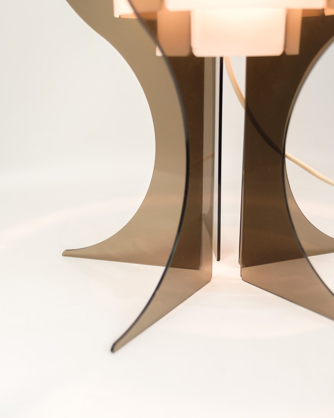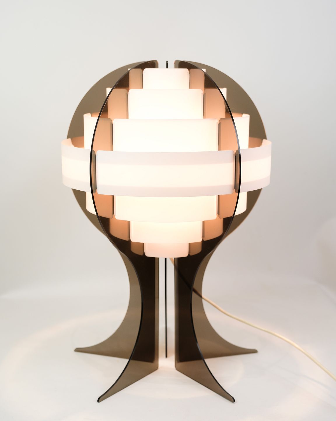 Smoked brown acrylic glass and white acrylic strips make this specially shaped Danish table lamp give off a very special and fantastic light.