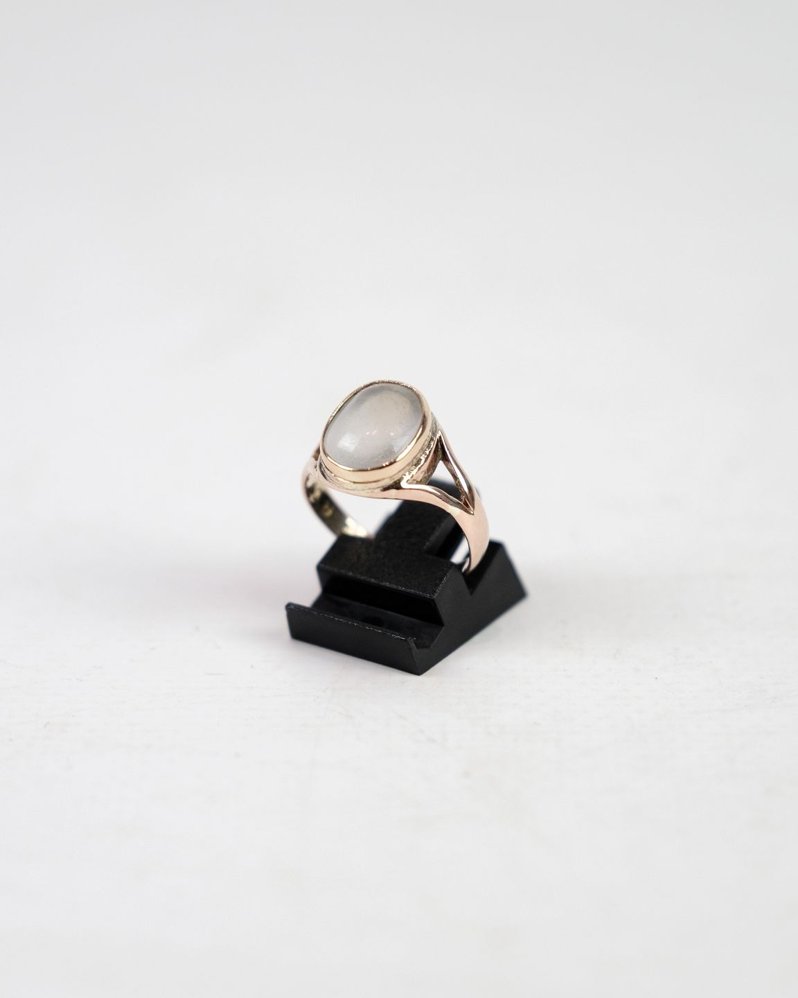 Guldring udsmykket med en stor flot oval månesten. Ringen er i 14 karat og er stemplet 585 og signatur B.S.