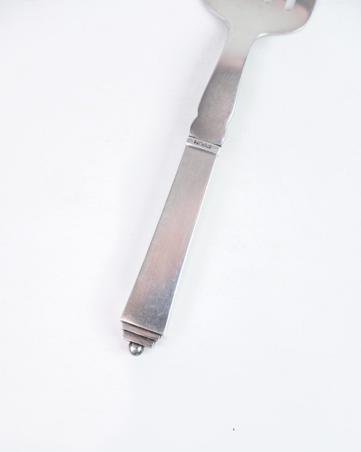 Sildegaflen i sterling sølv, kombineret med stål, model 216. Sildegaflen er en del af pyramideserien som blev designet af Harald Nielsen i 1926 og fremstillet af Georg Jensen. Pyramideserien er et unikt og flot design, der også afspejler Art Deco-stilen.