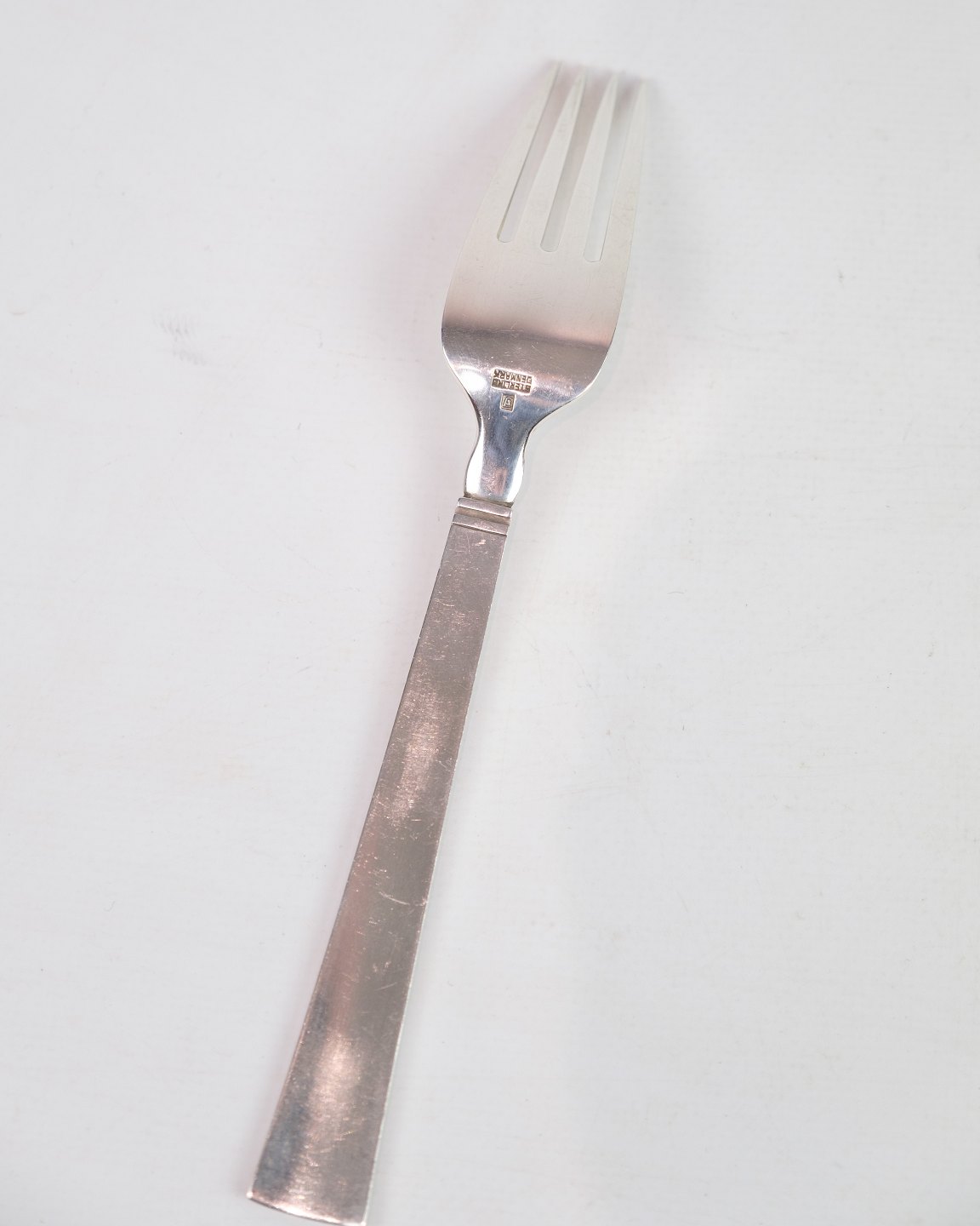 Denne spisegaffel er en del af Georg Jensens "Blok" bestikserie, designet af Just Andersen i 1934. Fremstillet i sterling sølv (925), er gaflen kendetegnet ved sit enkle og funktionelle design, typisk for skandinavisk modernisme. "Blok" serien er kendt for sine rene linjer og tidløse æstetik, hvilket gør den velegnet til både hverdagsbrug og formelle anledninger.