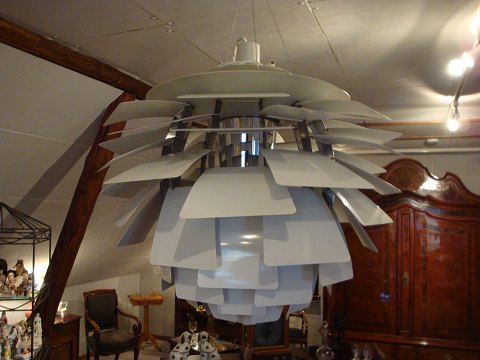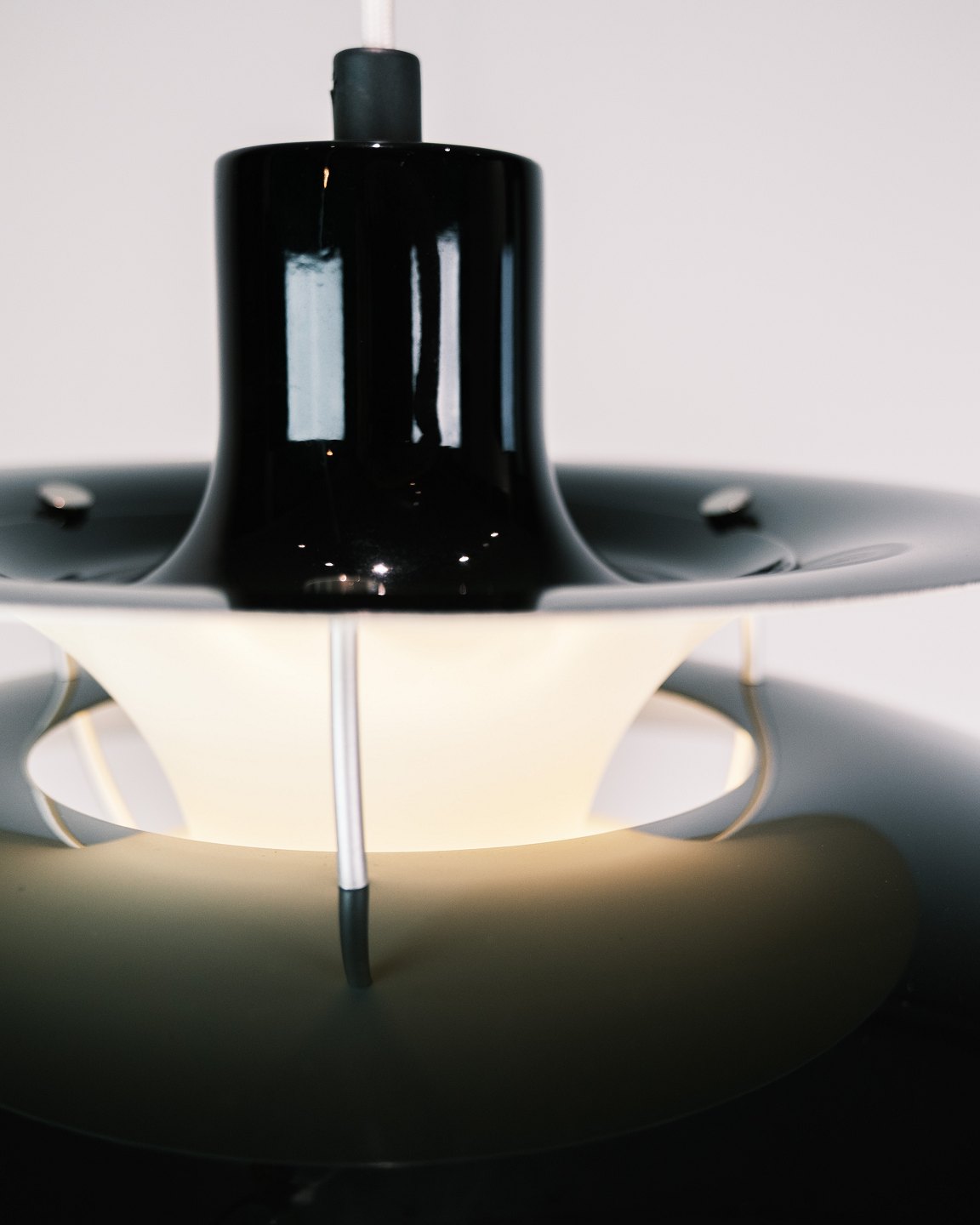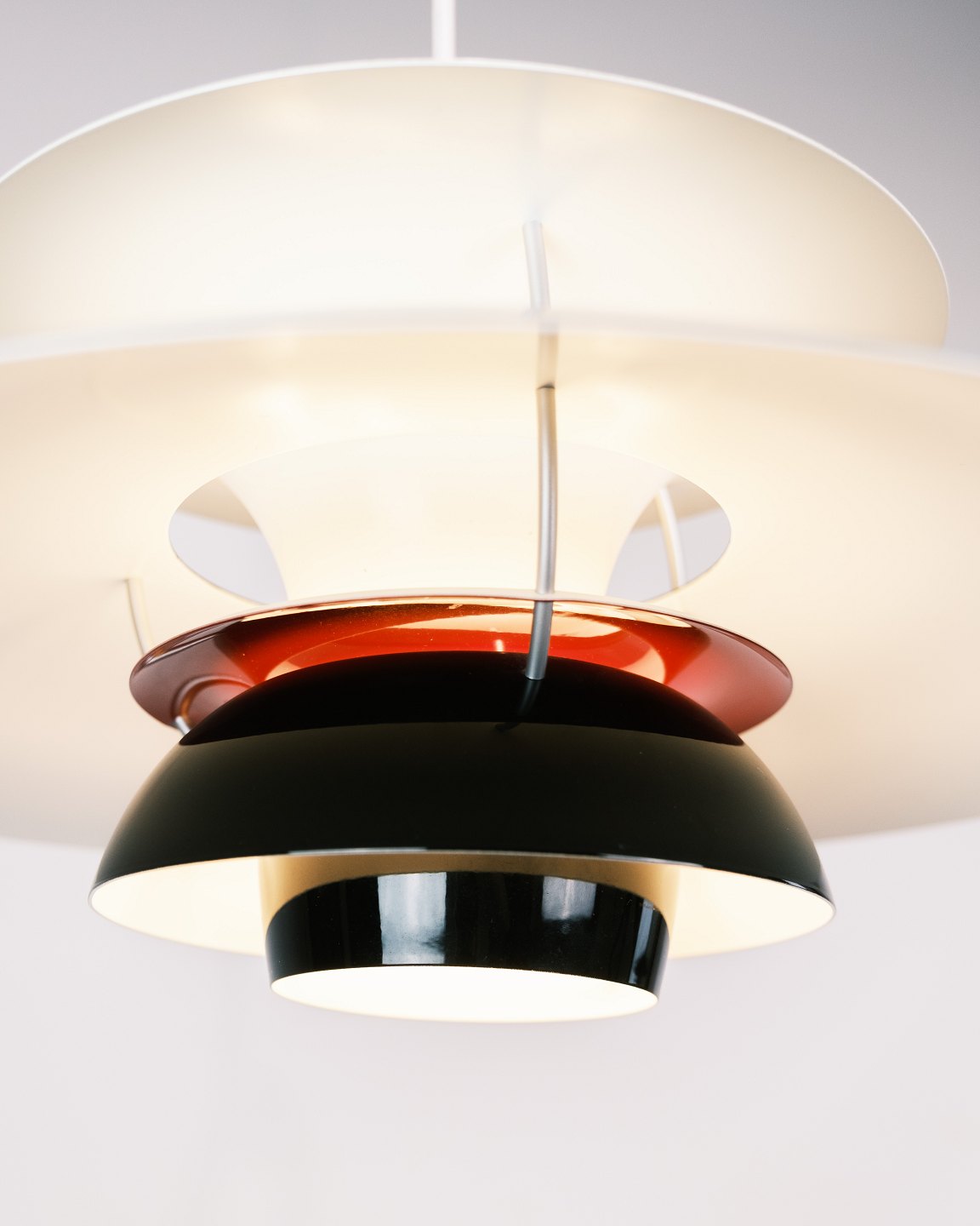 PH5 lamp designed by Poul Henningsen in 1958 and manufactured by Louis Poulsen. The lamp has lacquered metal shades in black, red and white, and is a newer model.