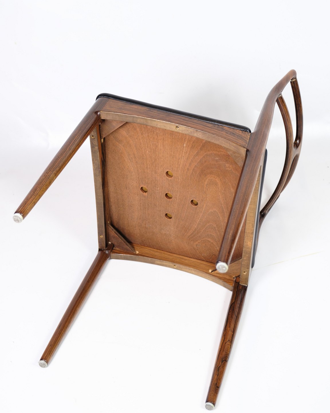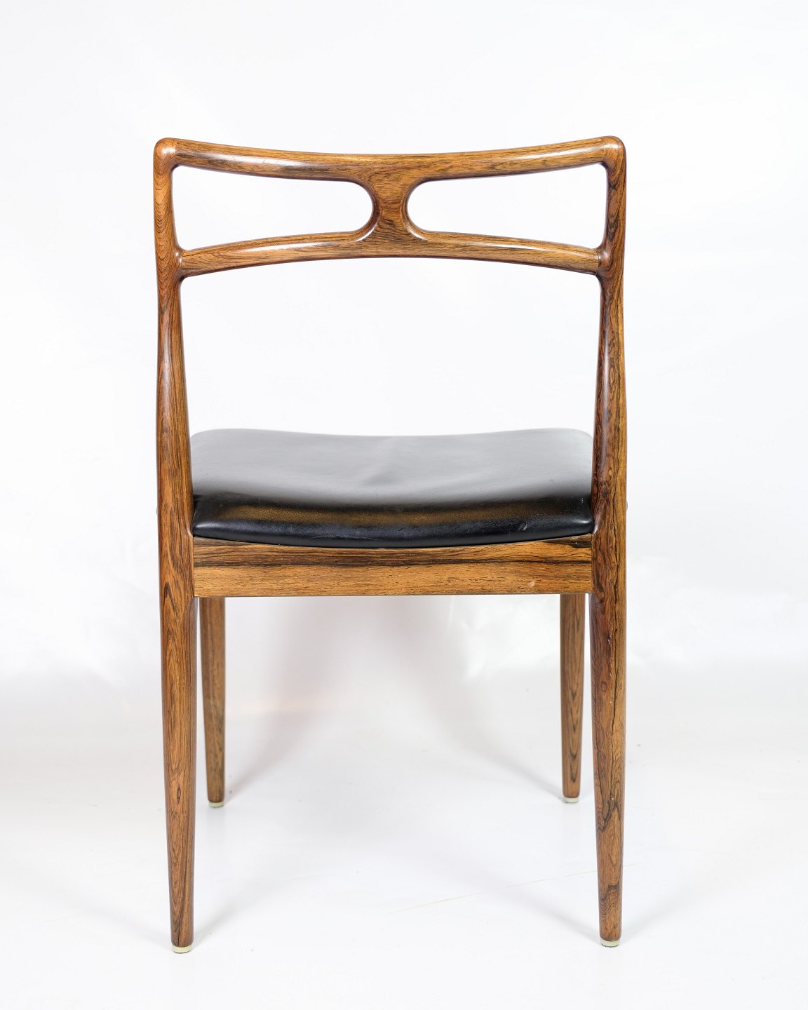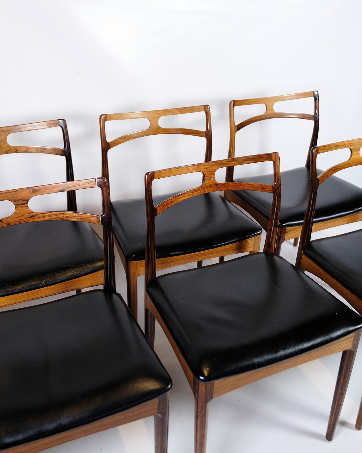Set of 6 dining chairs, model 94, designed by Johannes Andersen in the 1960s and manufactured by Christian Linneberg Møbelfabrik. The chairs are made of rosewood with beautiful grain patterns and have seats upholstered in black leather. The design of the chairs is characterized by their slender, round legs and the ribbon-shaped, slightly curved backrest.