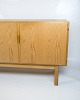 Skænk i lys eg fra 1960'erne, udført i dansk design. Skænken har tre låger, der åbner op til rummelige opbevaringsrum med hylder og tre udtræksskuffer, ideelle til opbevaring af mindre genstande. Det enkle og funktionelle design kombinerer rene linjer med kvalitetsmaterialer, hvilket gør skænken både praktisk og stilfuld.
