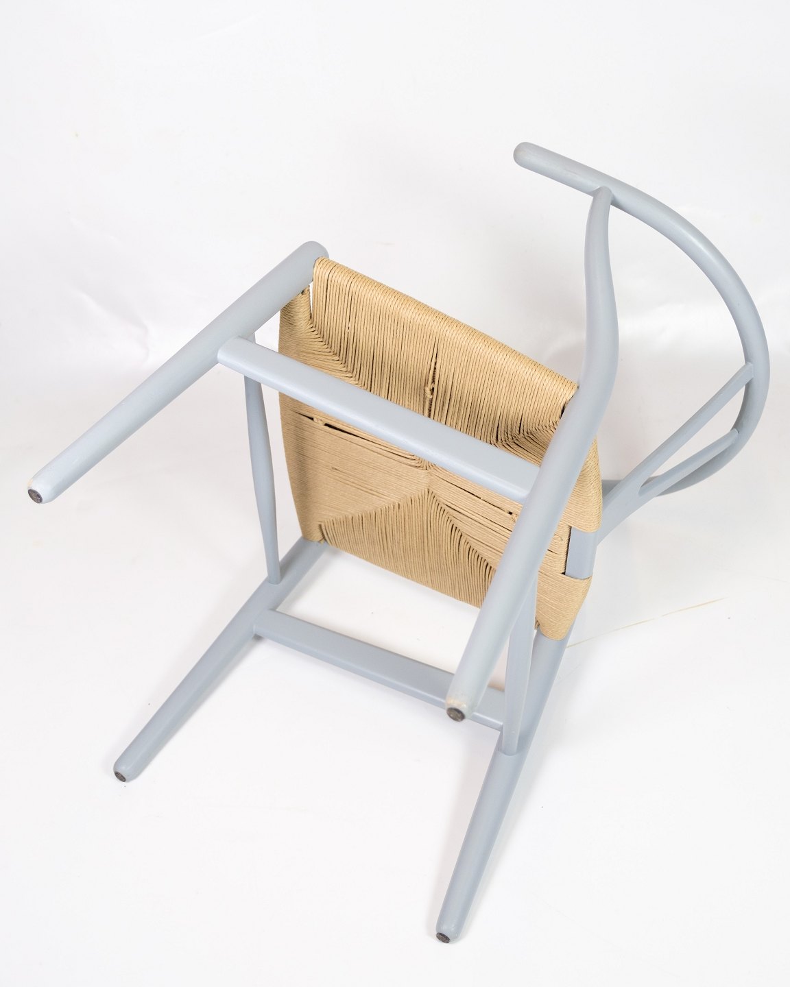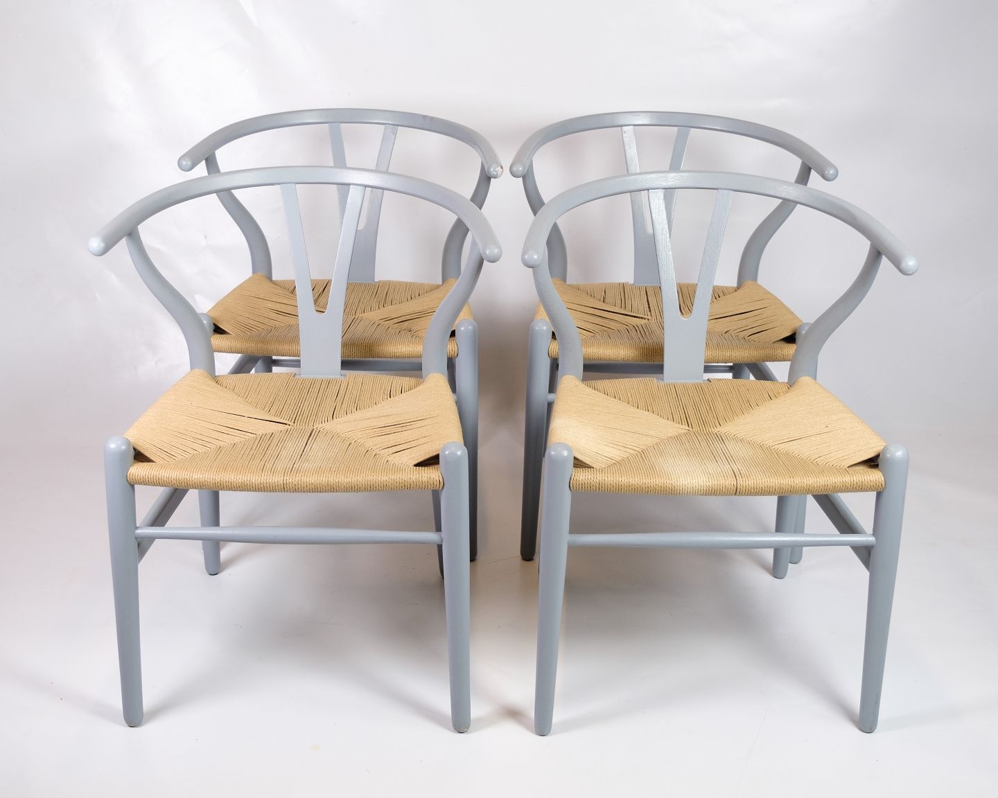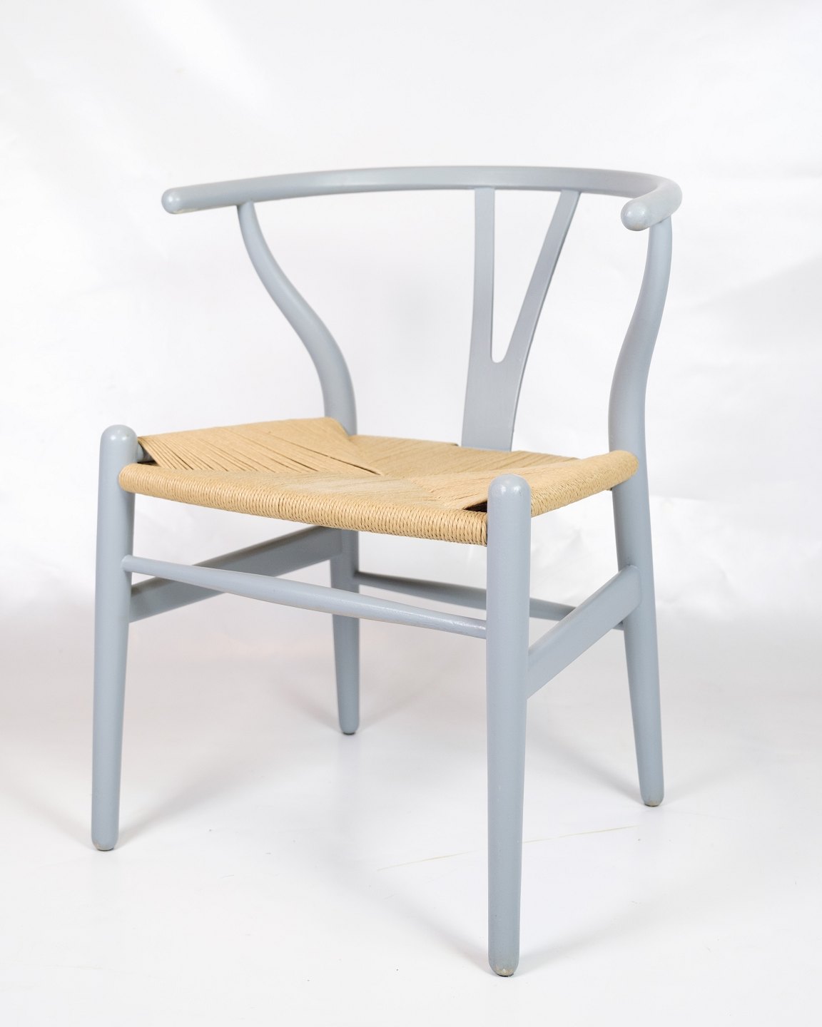 SolgtSæt af 4 Y-stole, model CH24, designet af Hans J. Wegner og produceret af Carl Hansen & Søn. Stolene er bemalet i en grå farve, der tilfører et moderne udtryk til det klassiske design. Y-stolen, også kendt som "Wishbone Chair", blev designet i 1949 og har været i produktion siden 1950.