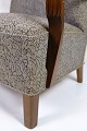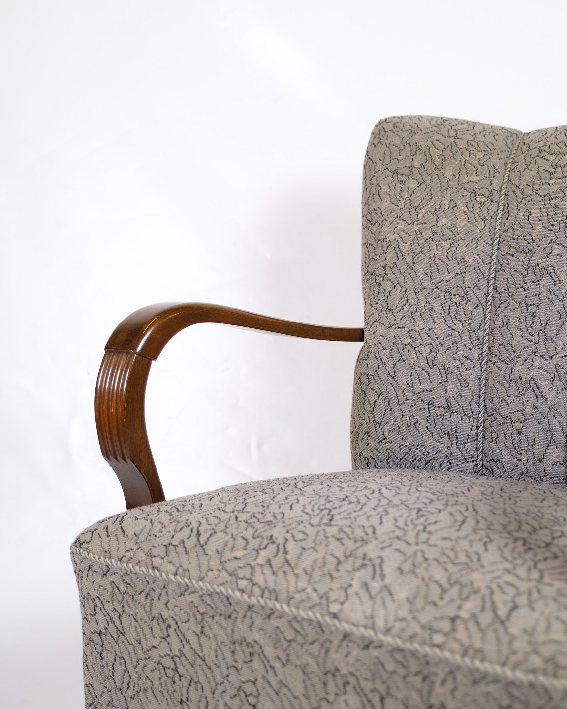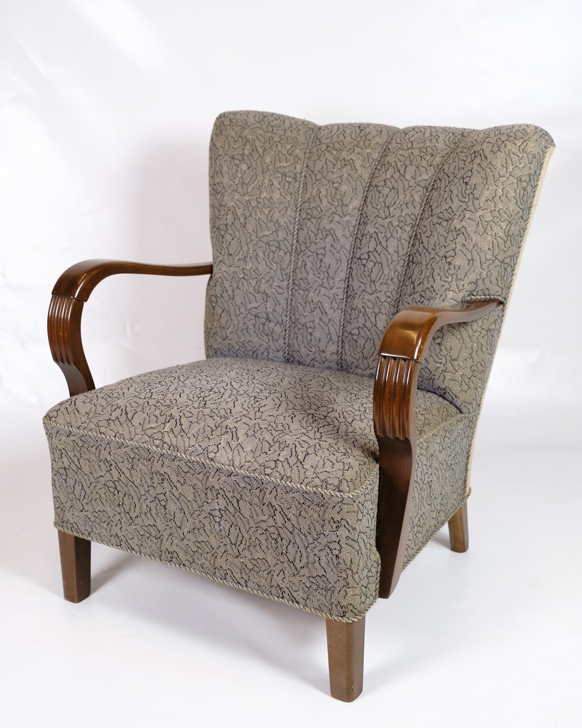 Sæt af 2 lænestole fra 1960'erne med stel og armlæn i poleret mørkt træ. Stolene har en høj, polstret ryg og brede armlæn, der giver god støtte. De er betrukket med blomstret stof og står på solide, lige træben. Et klassisk dansk design, der kombinerer træ og polstring i en funktionel og enkel stil.