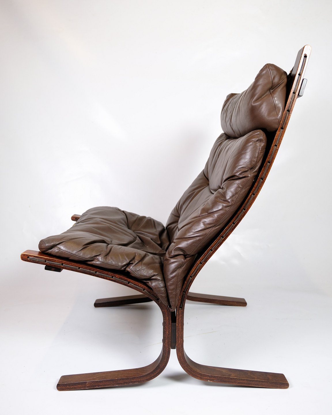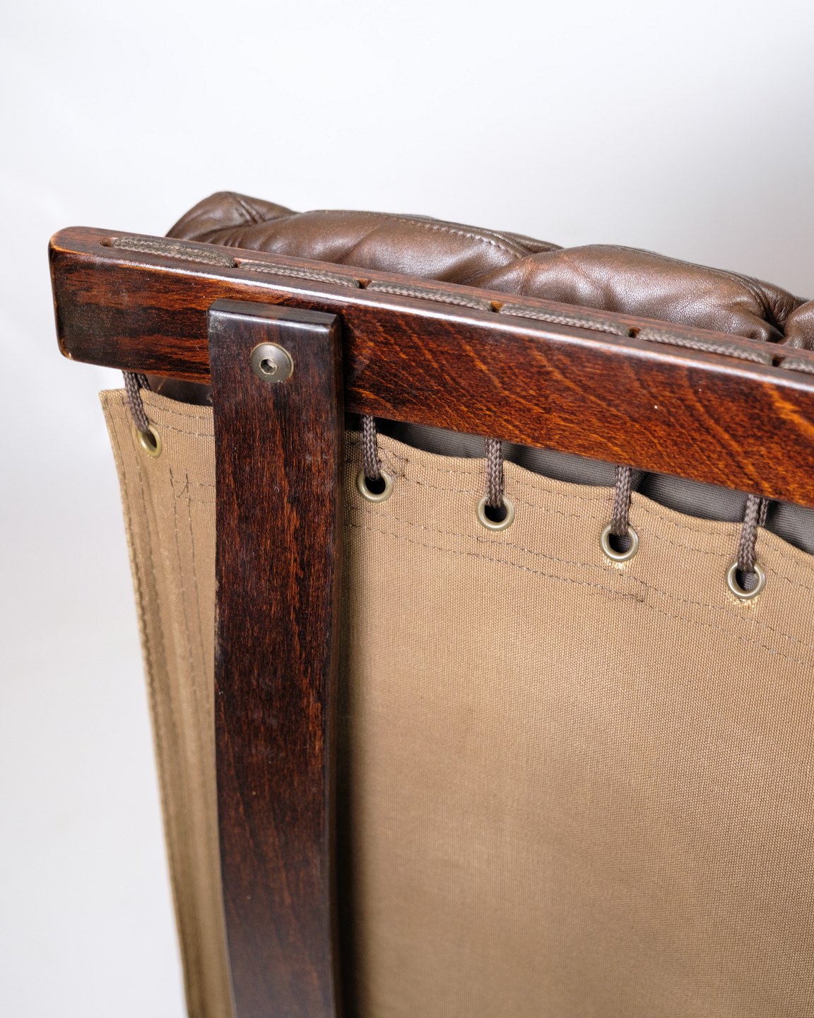 SolgtLænestolen "Siesta" er designet af den norske designer Ingemar Relling for Vestlandske Møbelfabrik i 1966. Stolen er udført med et stel i mahogni og polstret med brunt læder, der giver en behagelig og afslappet siddeoplevelse. Designet er enkelt og funktionelt med en skulpturel ramme, der kombinerer styrke og lethed.