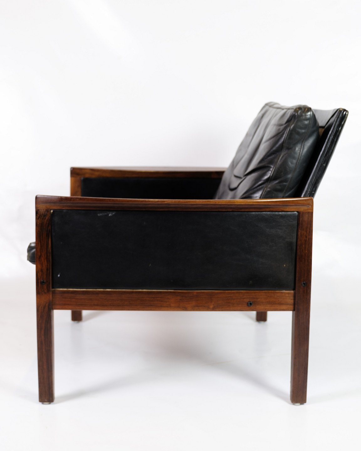 Dette sæt af 2 lænestole i palisander med sorte læderhynder er et pragteksempel på klassisk dansk design. Palisandertræet, med sin dybe farve og fine korn, giver stolen en unik og luksuriøs udstråling, mens det bløde, sorte læder sikrer en behagelig siddeoplevelse.