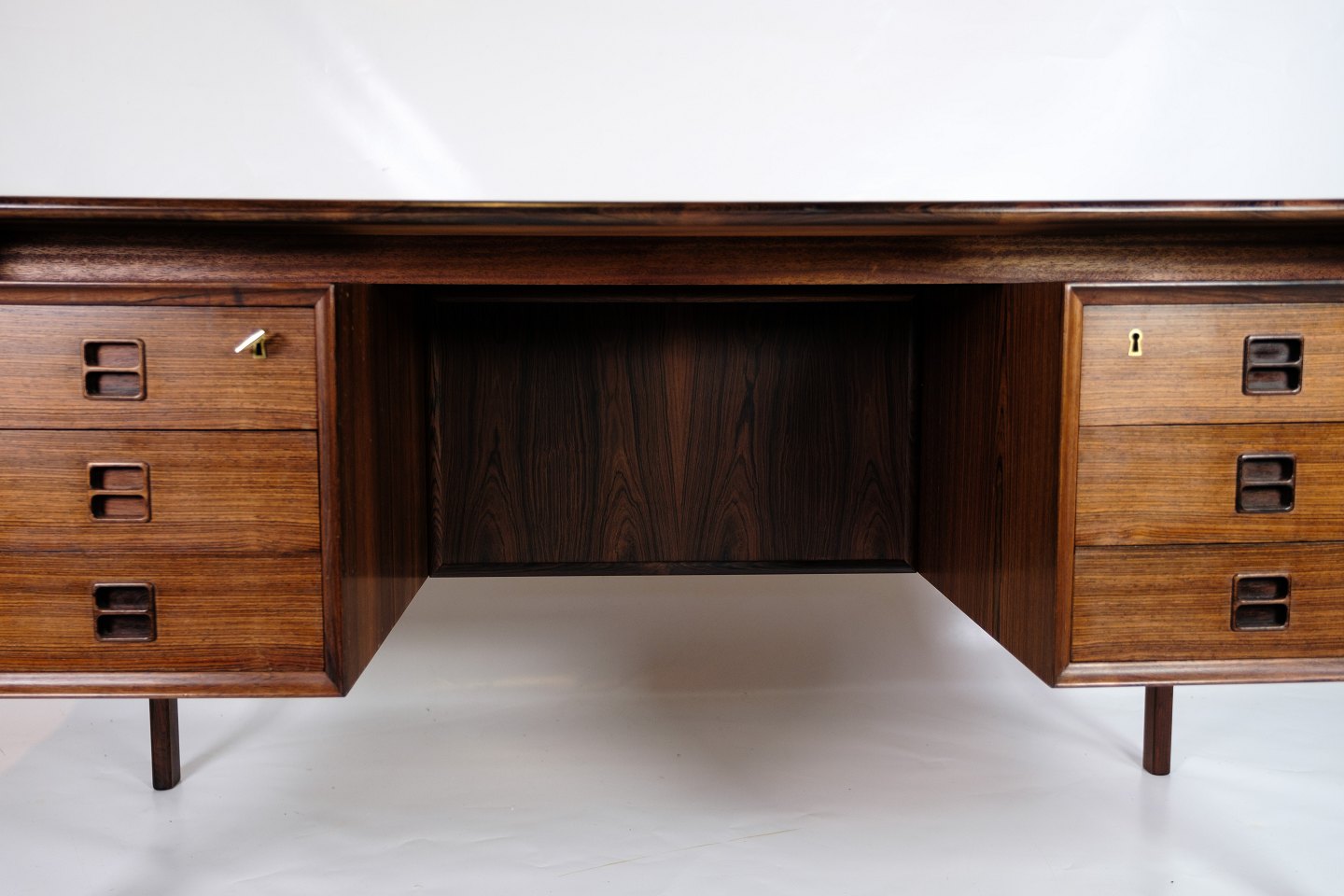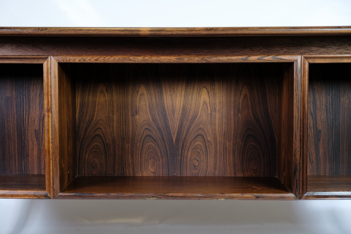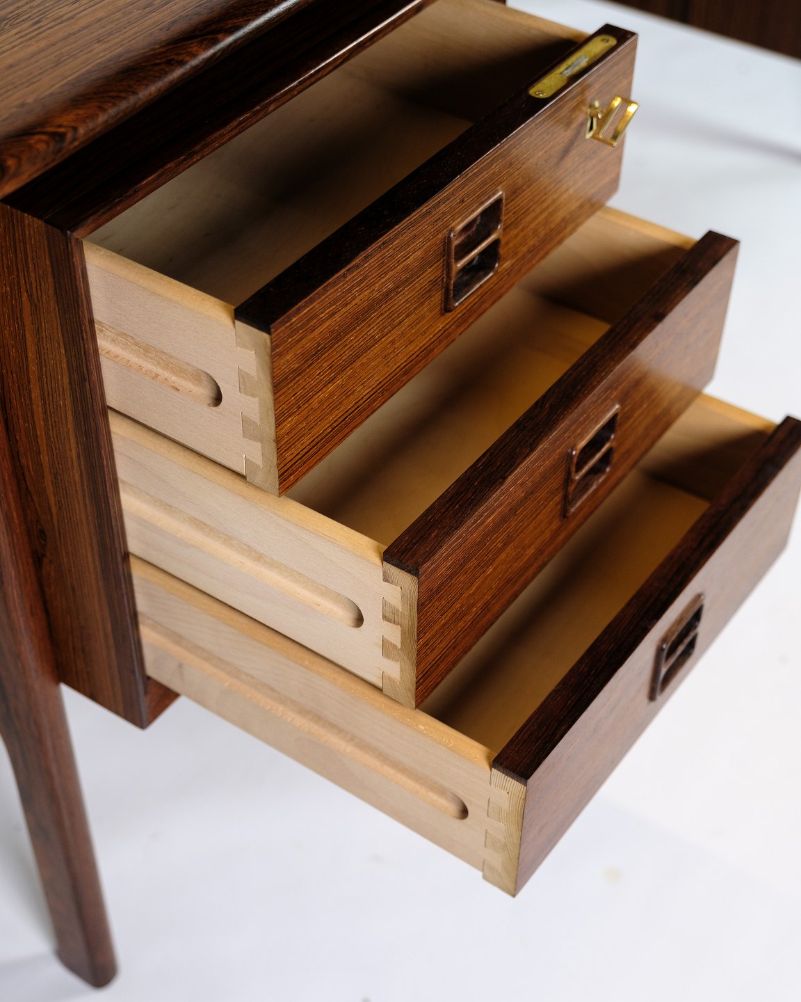 SolgtFritstående skrivebord designet af Erik Brouer og fremstillet af Brouer Møbelfabrik. Skrivebordet er udført i palisander og har 6 rummelige skuffer, der giver gode opbevaringsmuligheder. Det fritstående design betyder, at skrivebordet også er smukt fra bagsiden, hvilket gør det ideelt til placering midt i rummet.