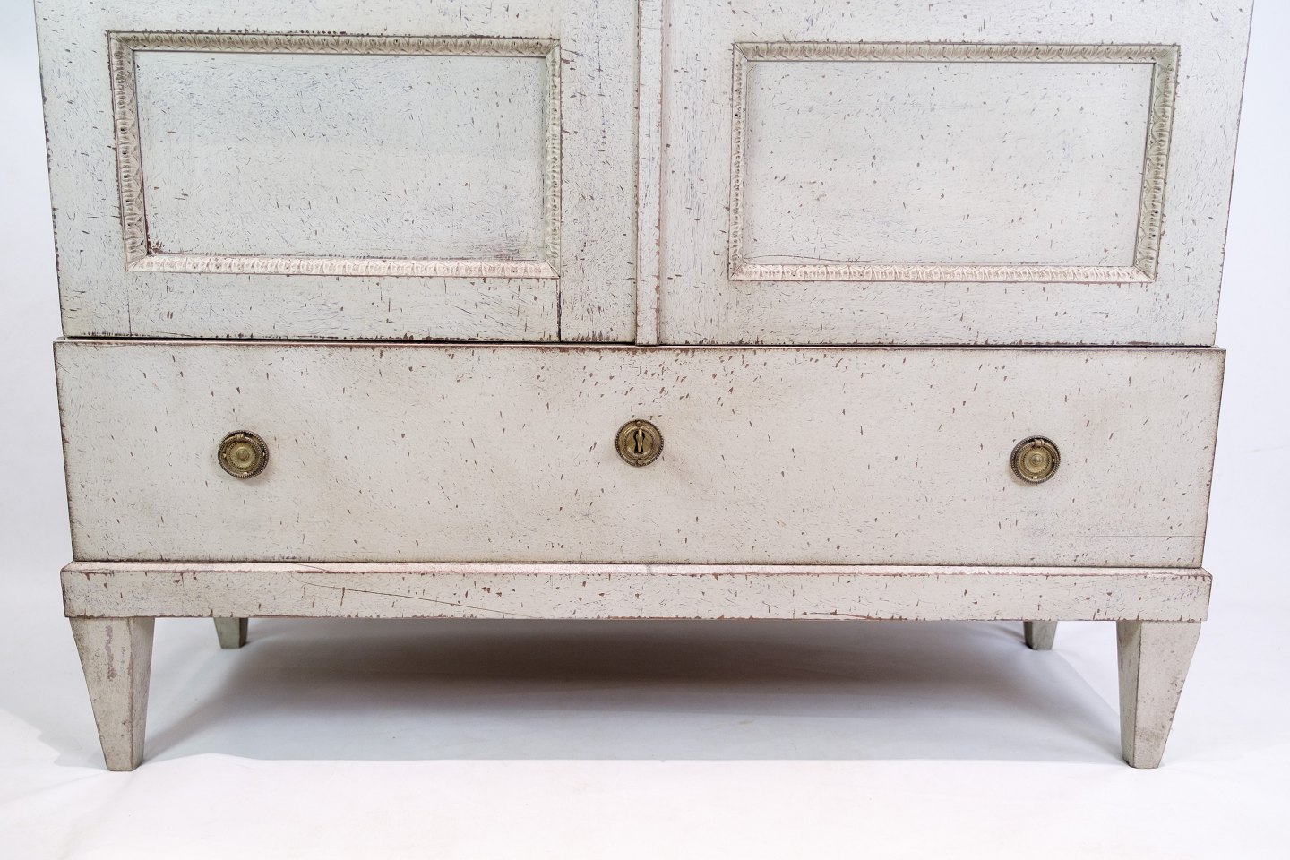 Glasskab med smuk gråmalet udsmykning fra den gustavianske periode år 1810. Skabet har en stor skuffe en bunden og 4 store indvendige hylder med meget opbevaringsplads. Skabet er udsmykket med messing håndtag og låse. Det er et meget enkelt og minimalistisk skab fra perioden med rene linjer og kanter.
