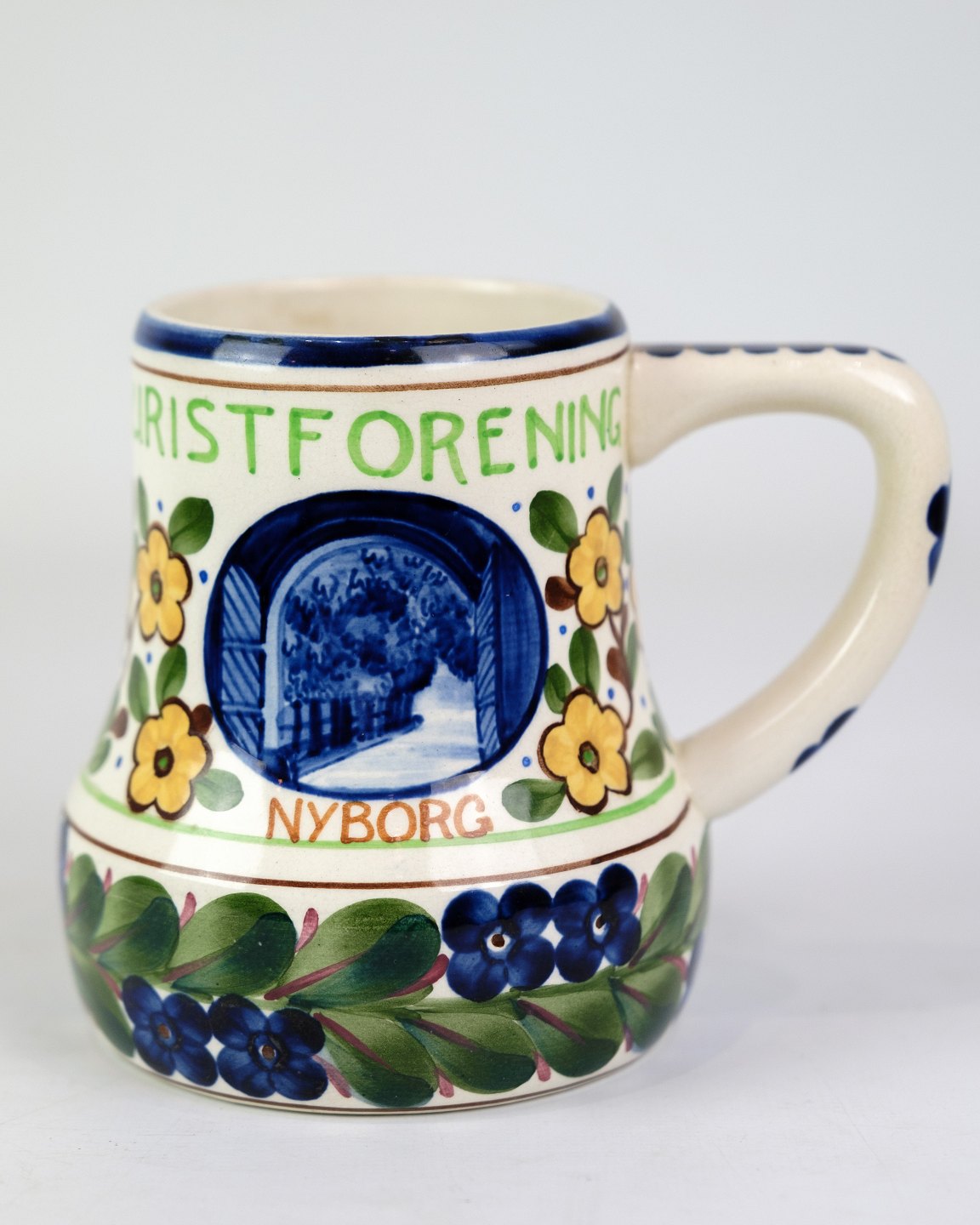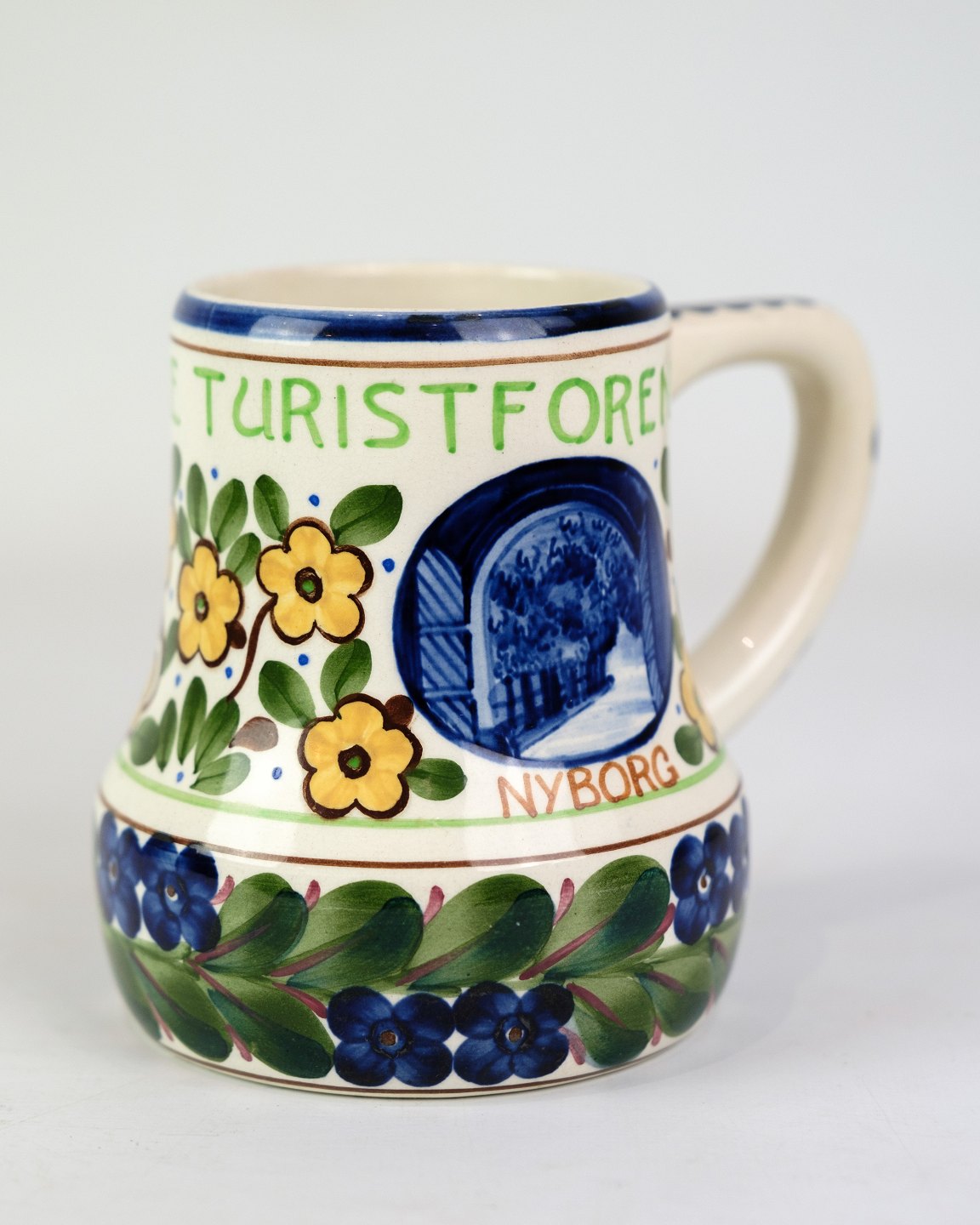 Dette krus, model 609/548, er fremstillet i fajance og designet i samarbejde med Den Danske Turistforening Nyborg. Kruset bærer et unikt og historisk præg, der afspejler Aluminia-fabrikkens tradition for kunstnerisk udsmykning og detaljerigdom.