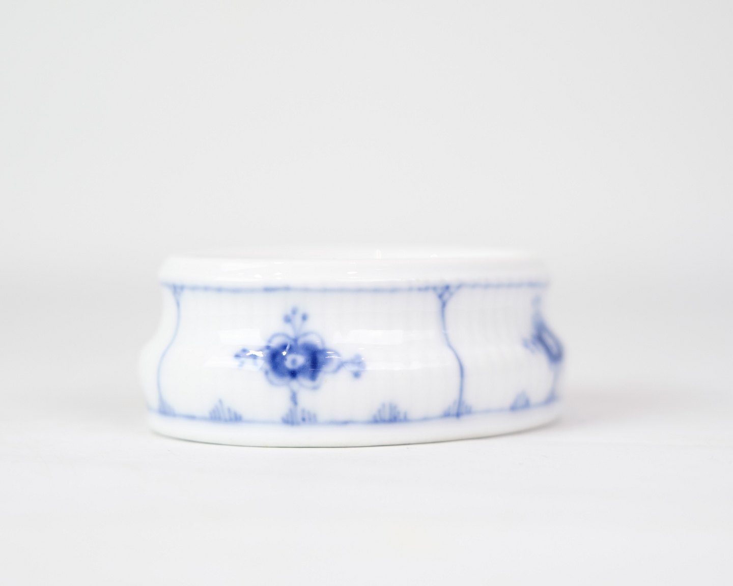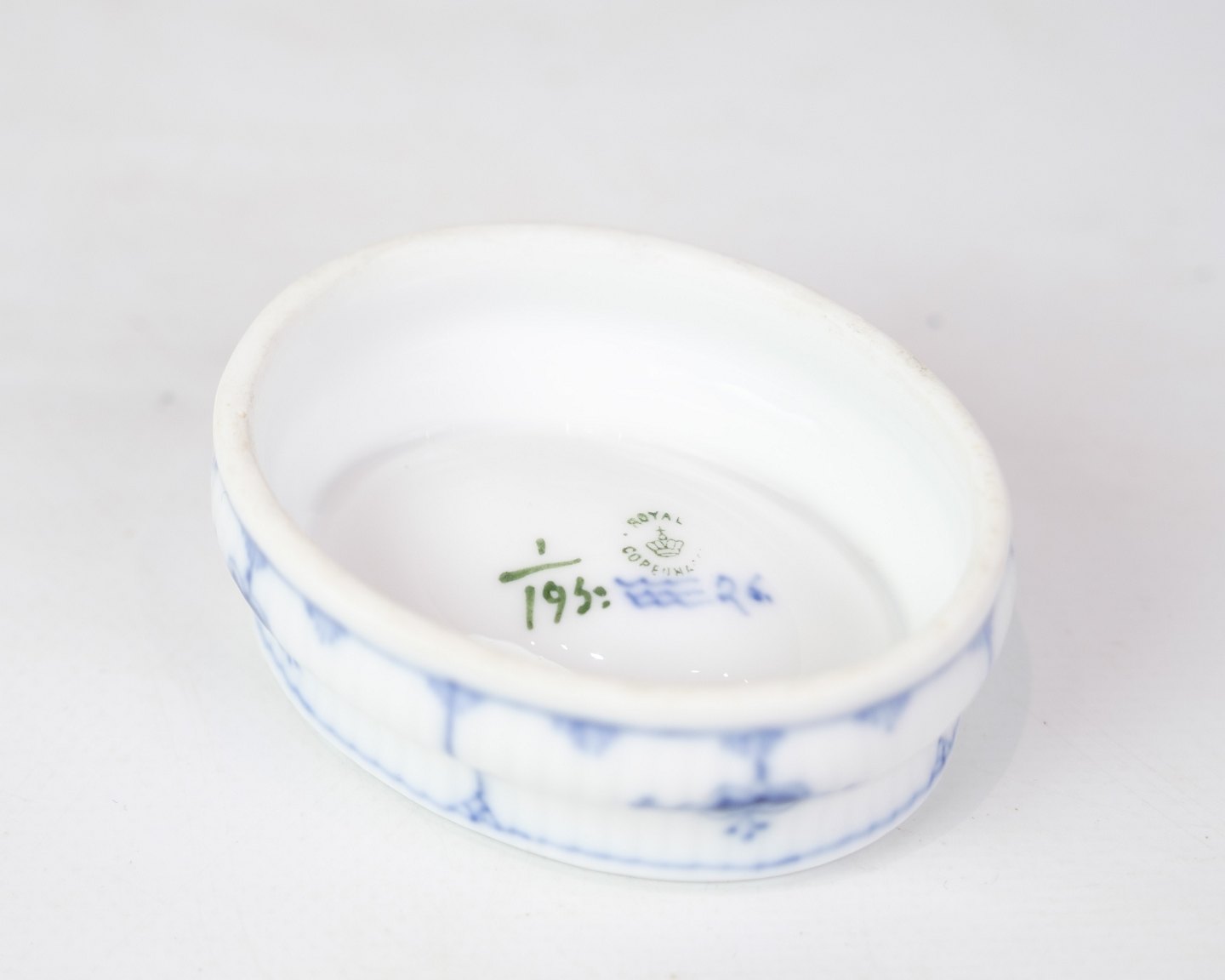 Oval salt cellar marked no. 1/195 from Royal Copenhagen. Fluted blue fluting design in hand-painted blue decoration.