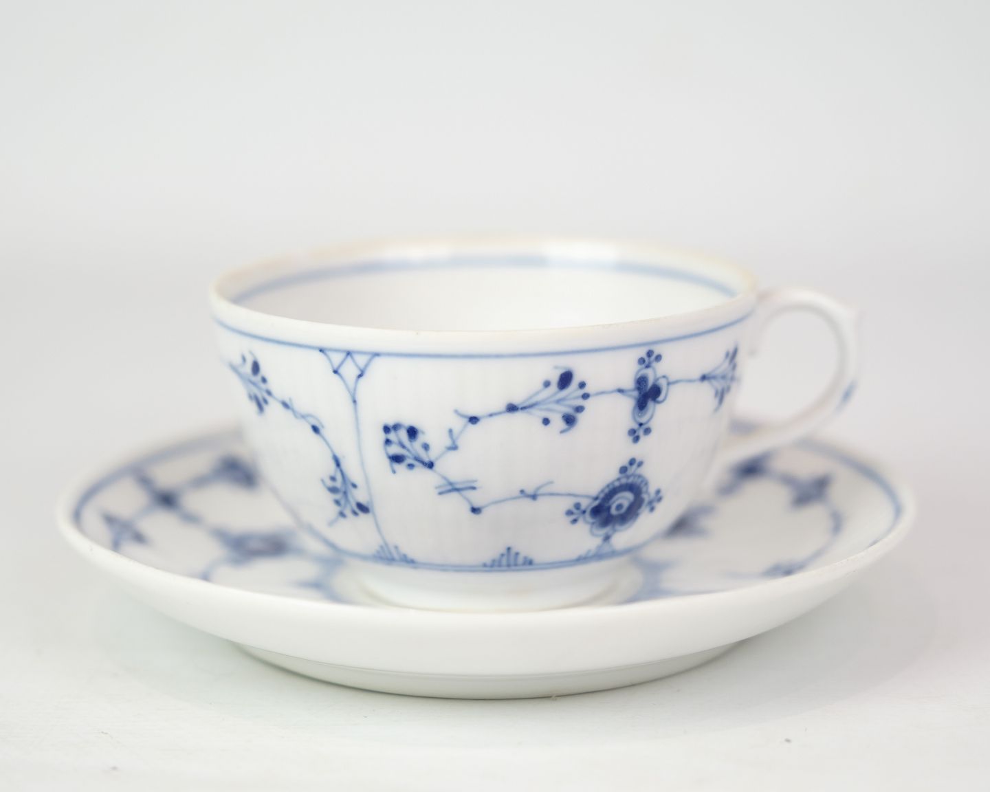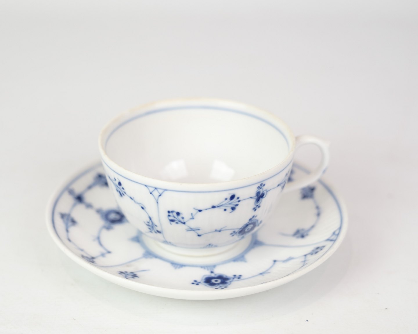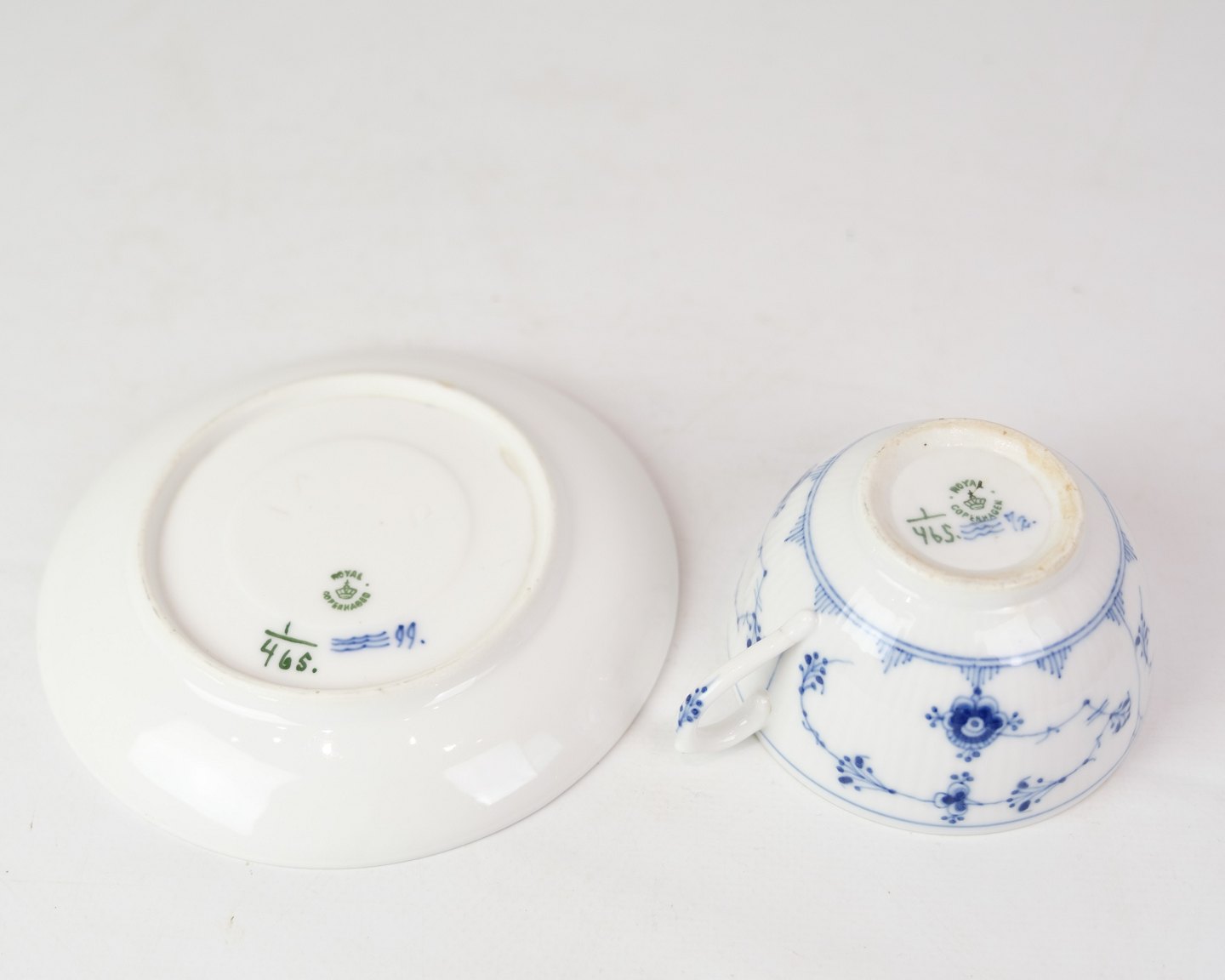 Tekop med underkop mærket 1/465 fra Royal Copenhagen. Fremstillet i porcelæn med klassisk musselmalet riflet design i håndmalet blå dekoration.