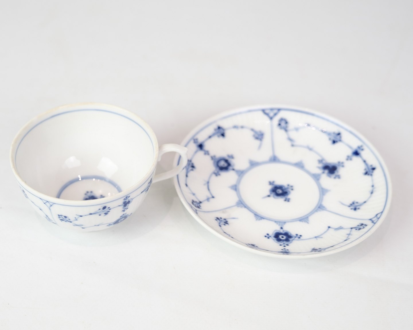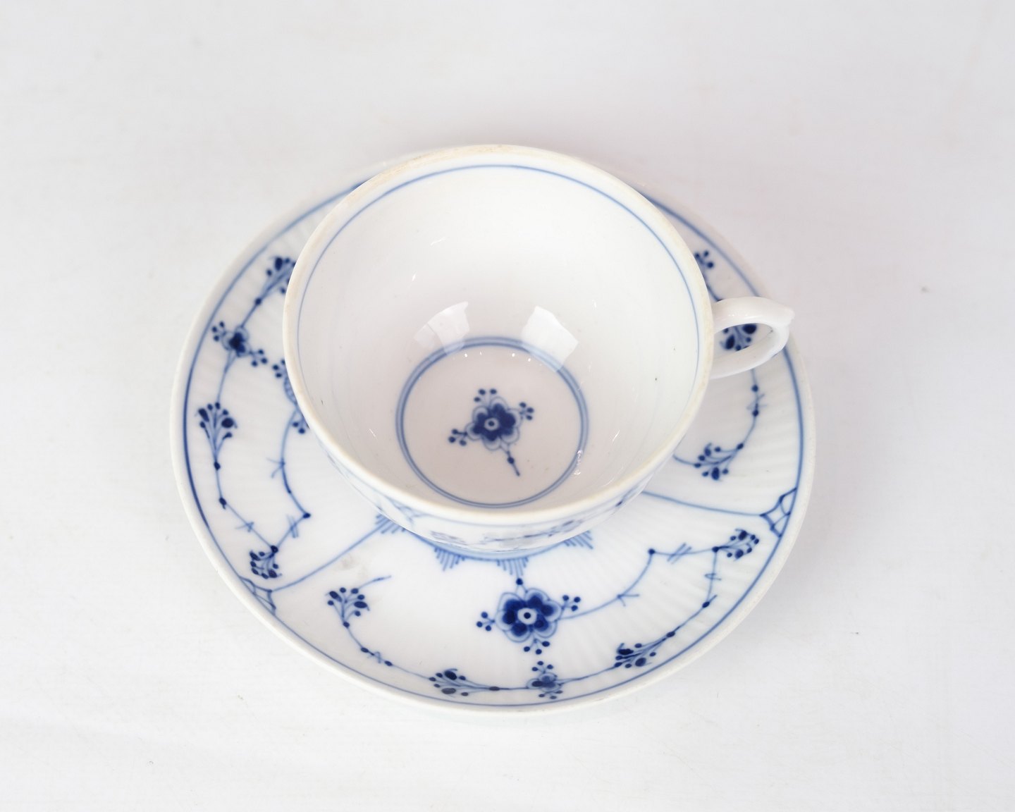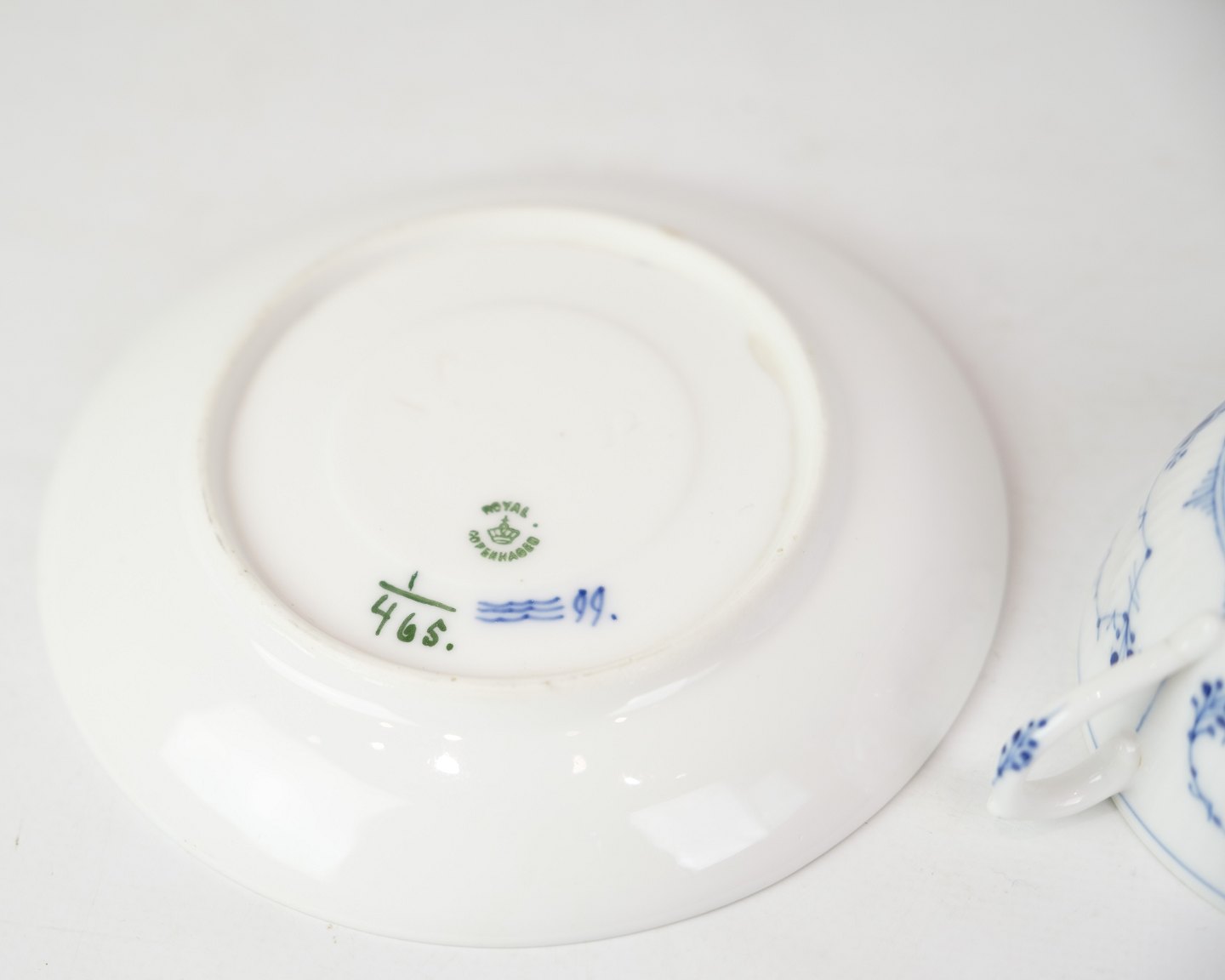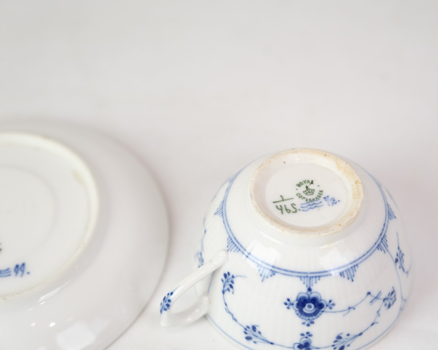 Tekop med underkop mærket 1/465 fra Royal Copenhagen. Fremstillet i porcelæn med klassisk musselmalet riflet design i håndmalet blå dekoration.