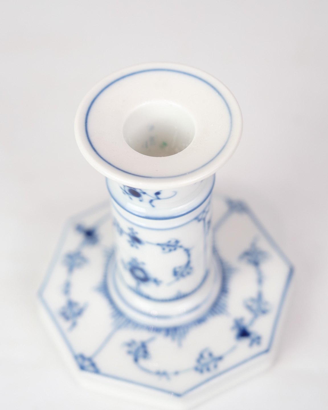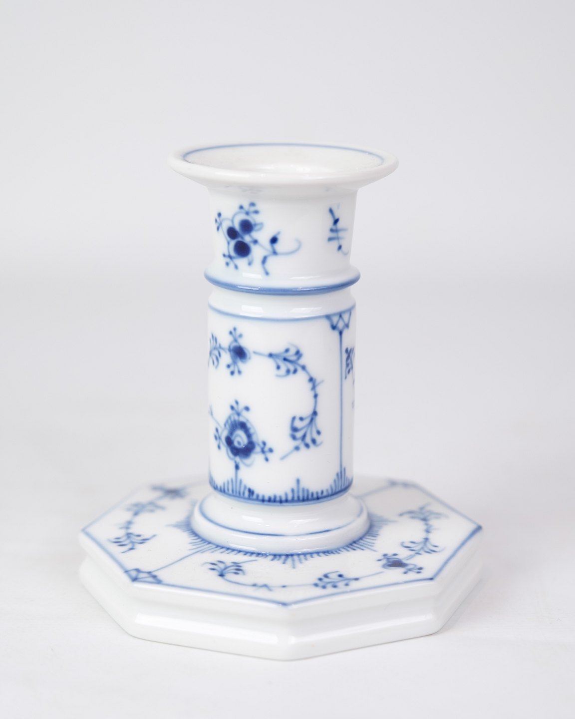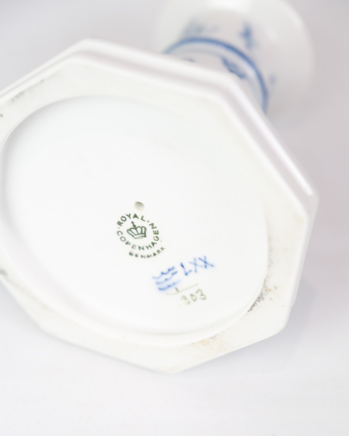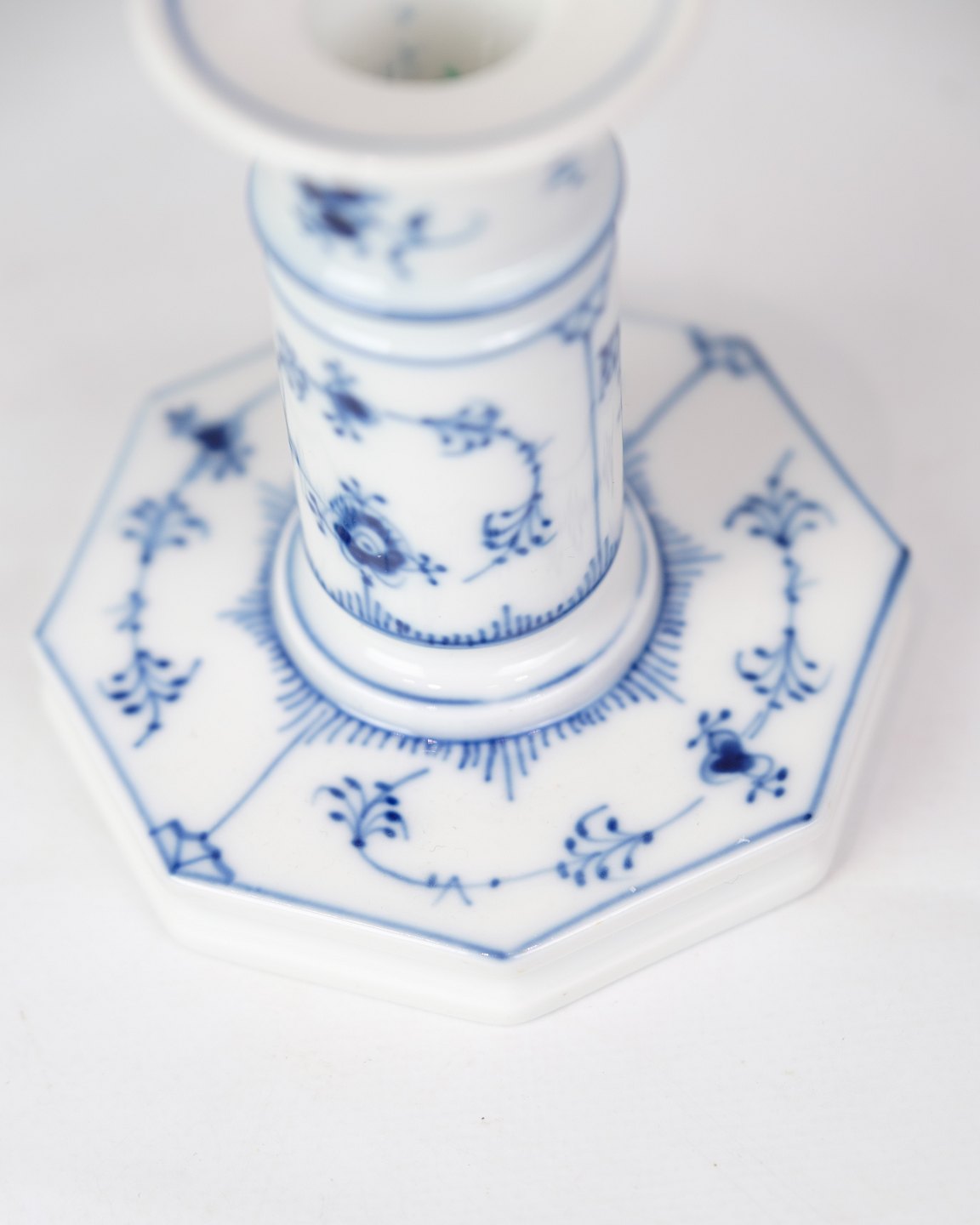 Sæt af 2 høje lysestager mærket med 1/303 fra Royal Copenhagen. Lysestagerne er lavet af porcelæn i musselmalet riflet design. De er håndmalet i blå dekoration.