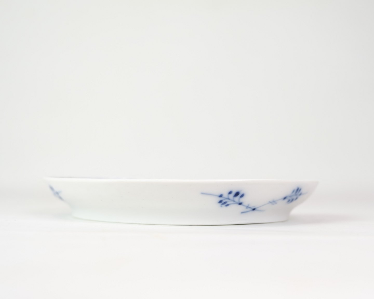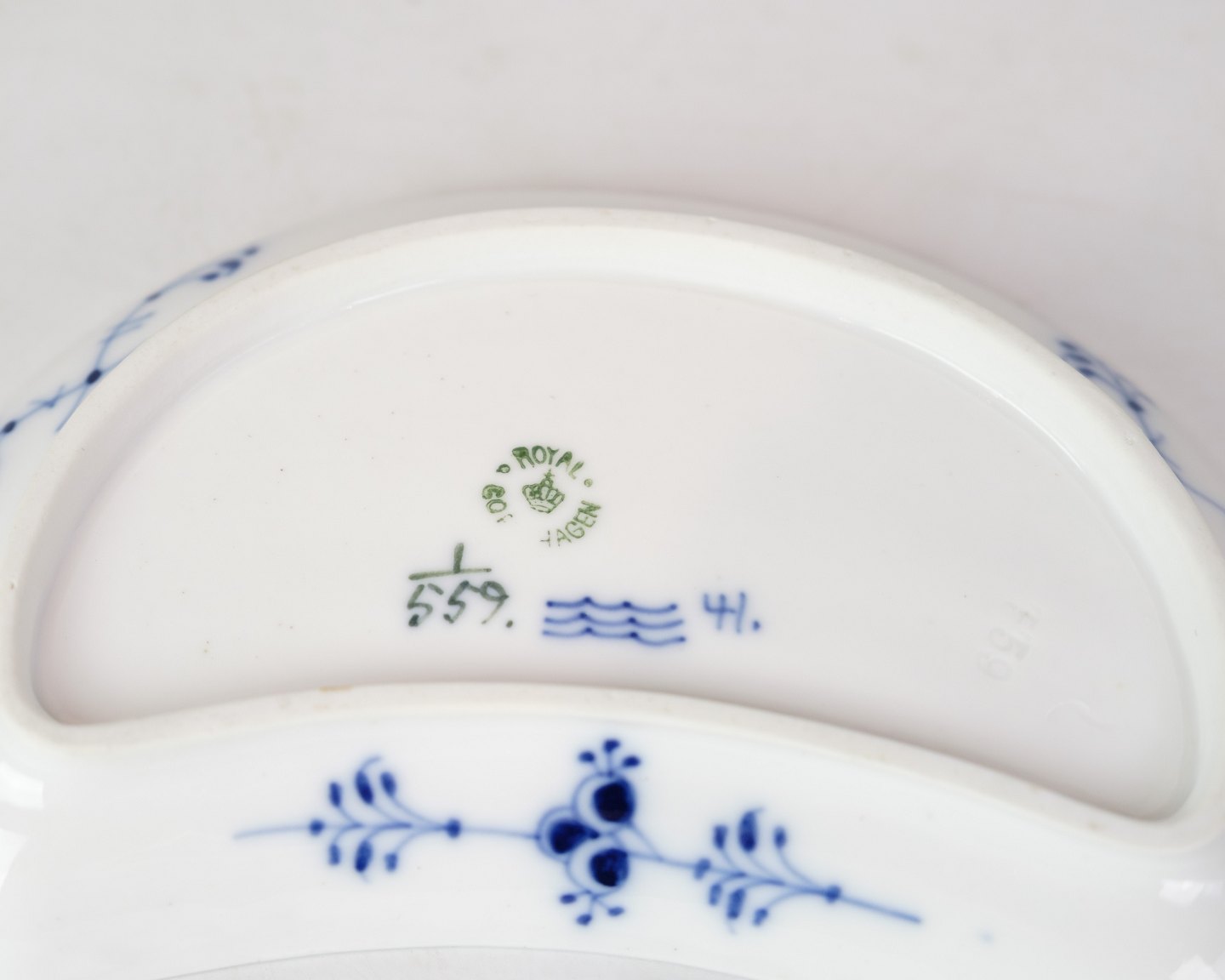 Half-moon dish marked 1/559 from Royal Copenhagen. Made of porcelain with blue-fluted half-lace design. The dish is hand-painted in blue decoration.