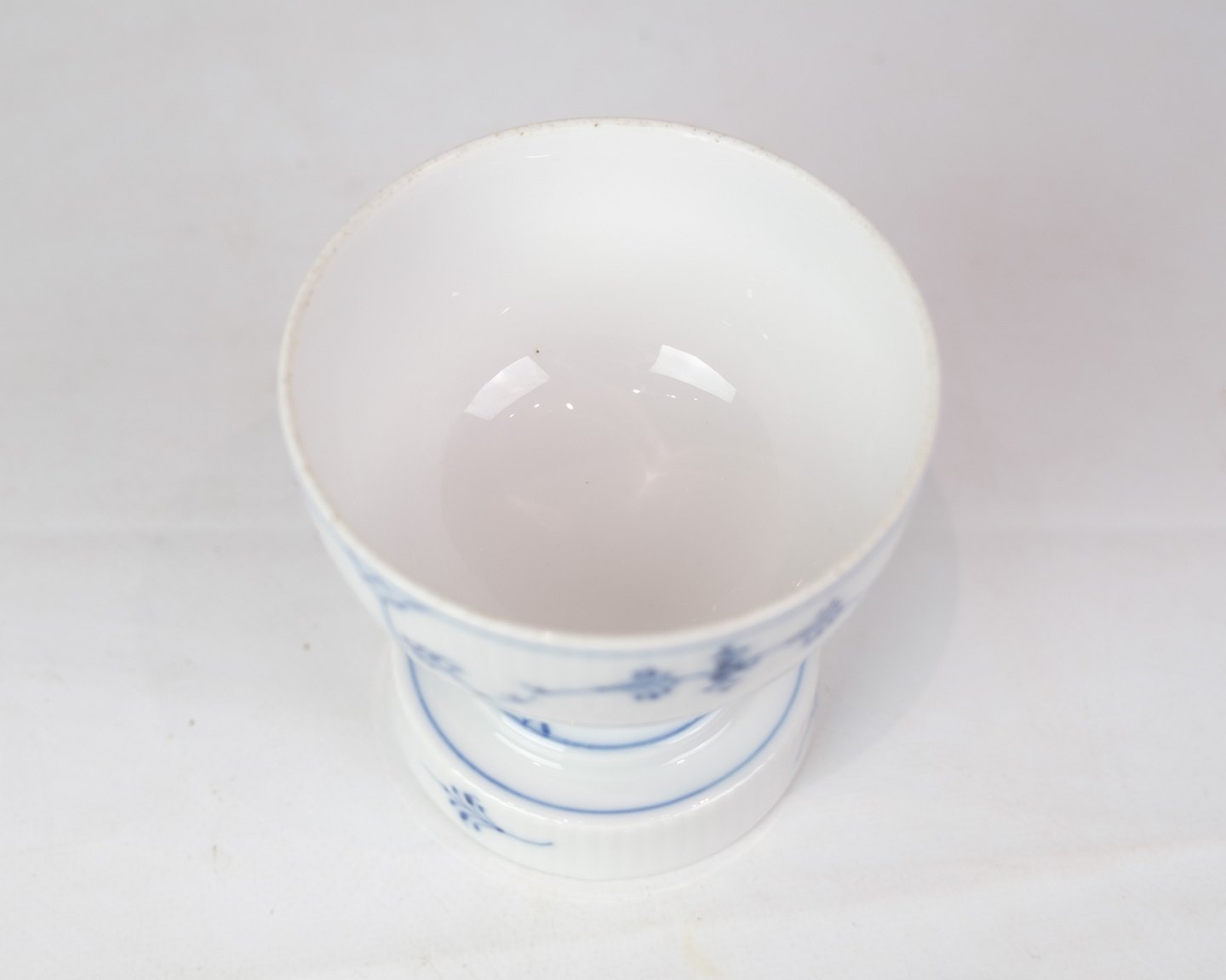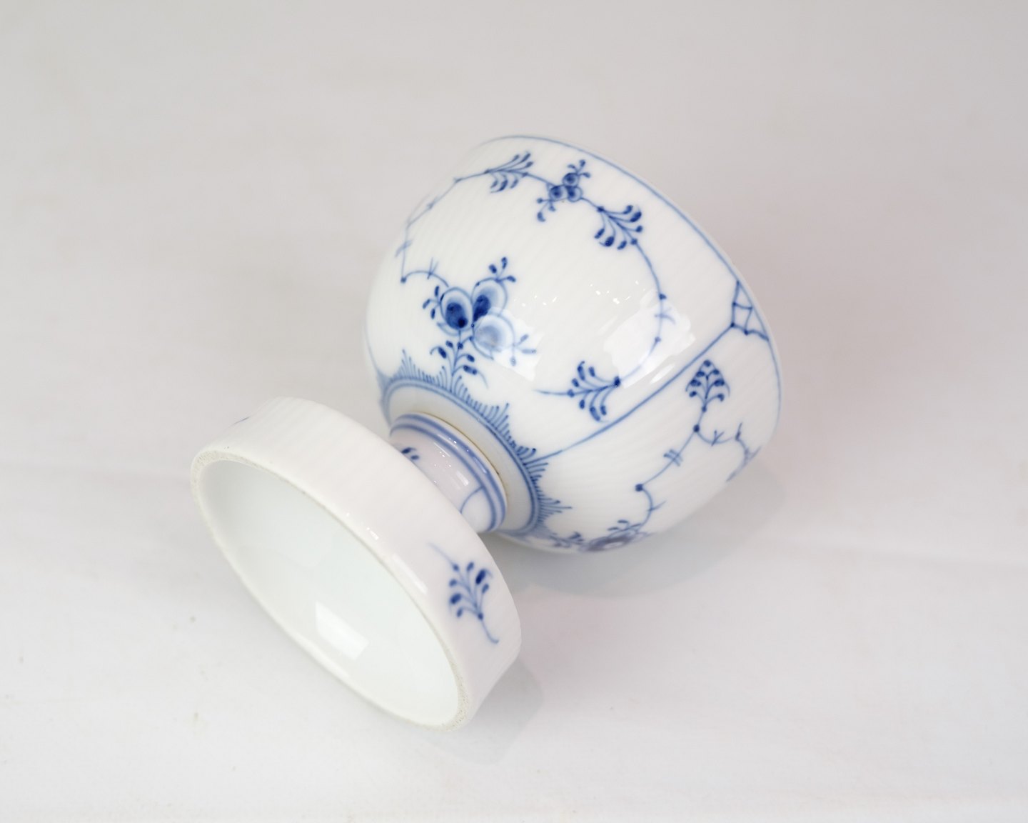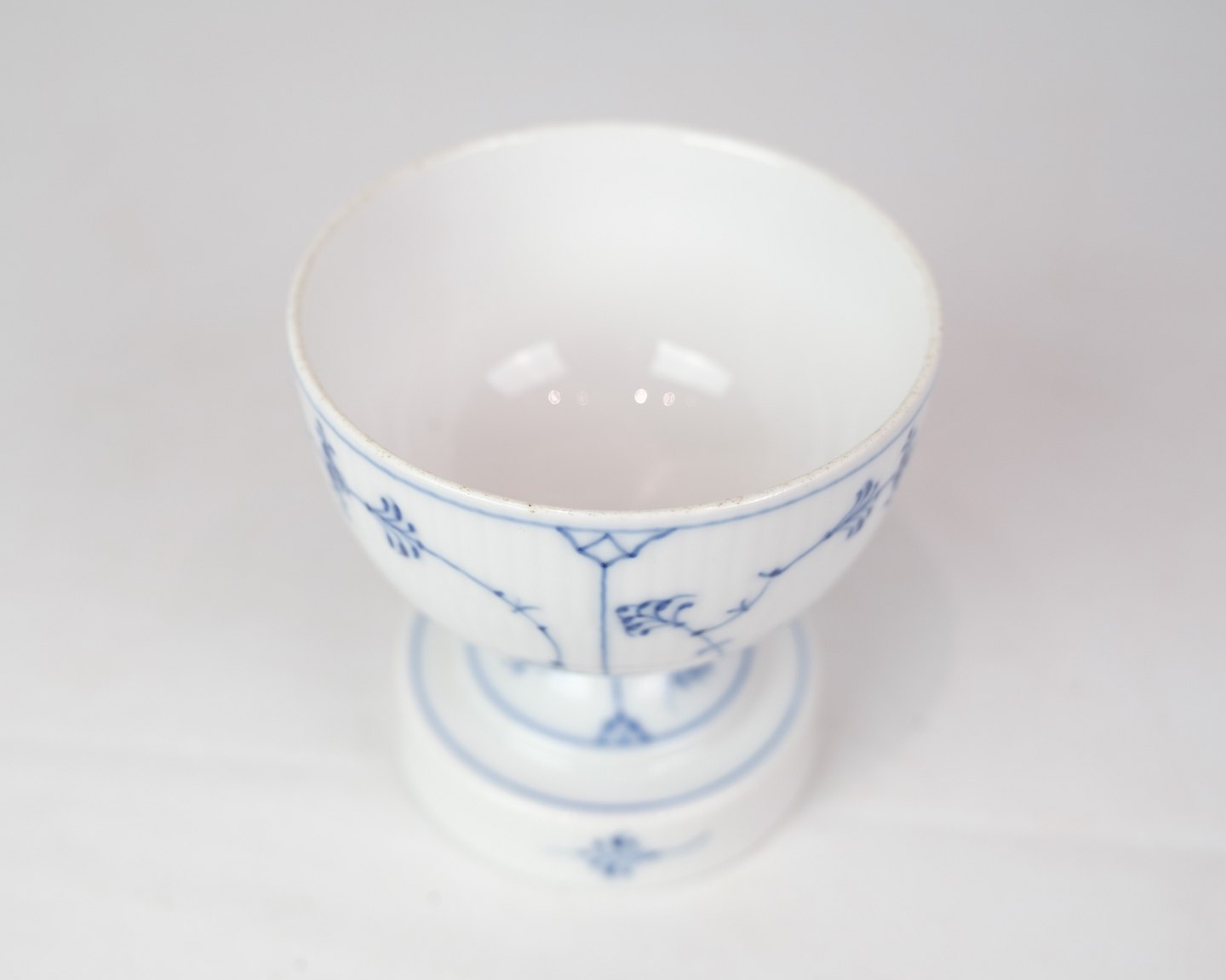 Small bowl on foot marked 1/2124 from Royal Copenhagen. Made of porcelain with classic blue fluting design. Hand painted in blue decoration.