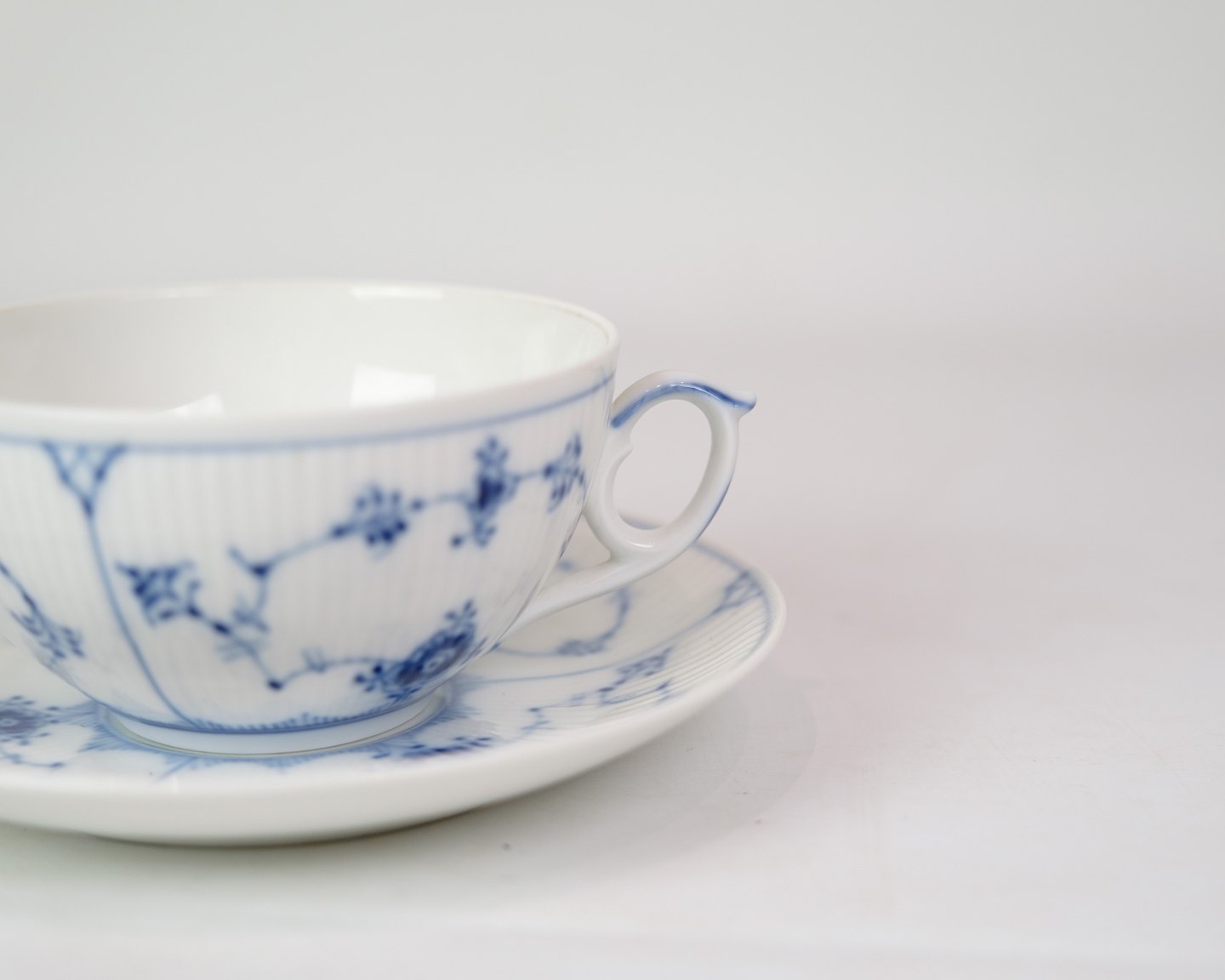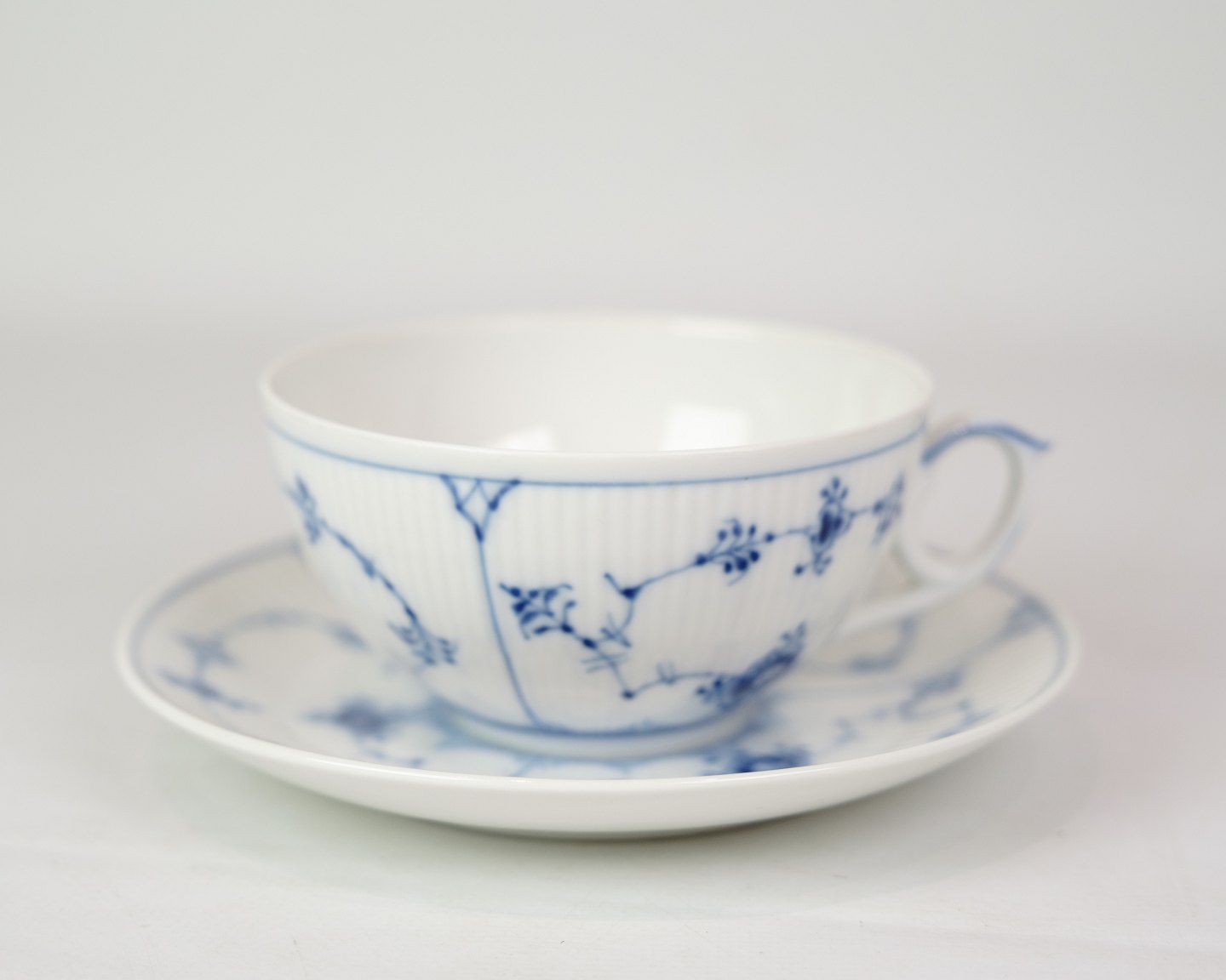 Stor tekop med tilhørende underkop mærket 1/315 fra Royal Copenhagen. Fremstillet i porcelæn med klassisk musselmalet riflet design.