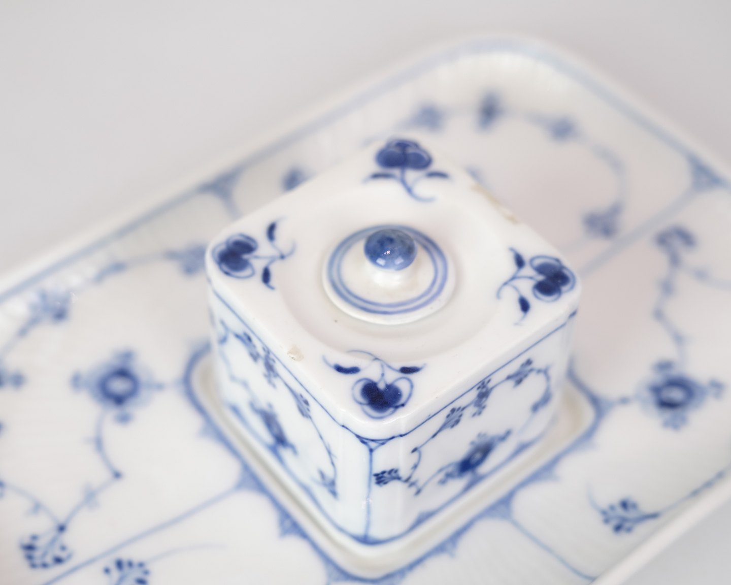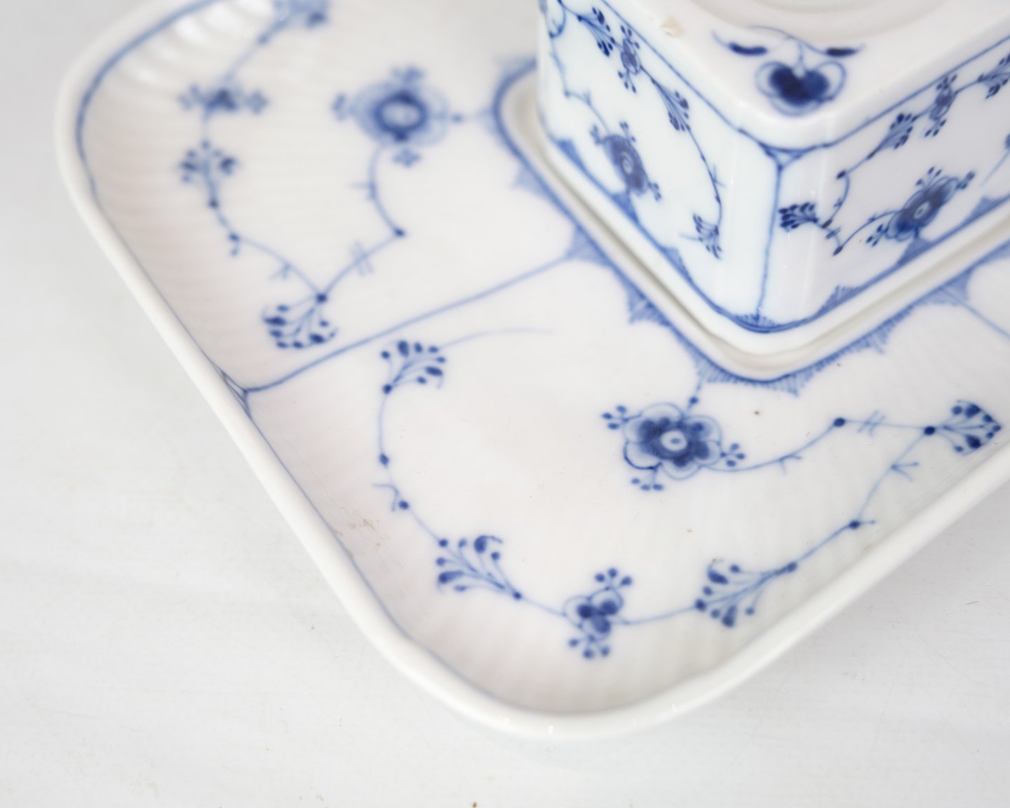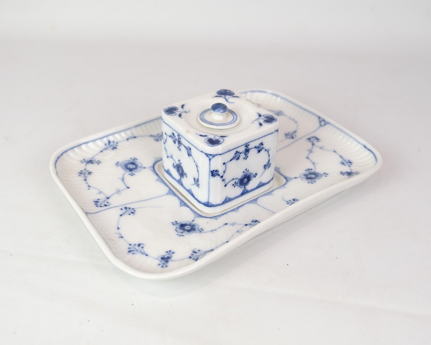RC writing set in the blue fluting pattern with model no. 128. With regard to the factory mark from the Royal Porcelain Factory, it appears that this item was manufactured between 1898 and 1923. Is in very good condition with accompanying lid.