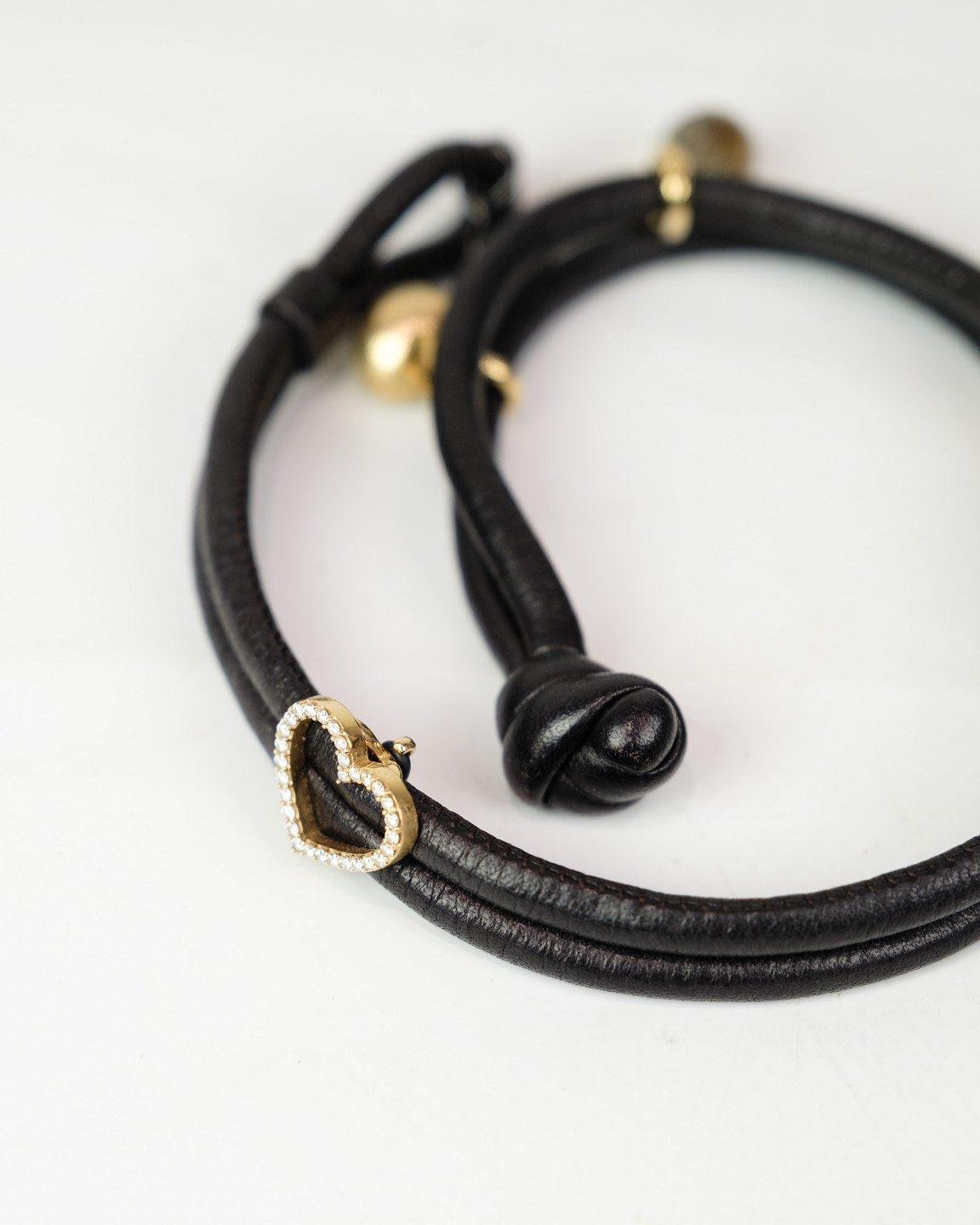 Please contact us for price informationLeather bracelet from Ole Lynggaard, decorated with four different charms. The bracelet features a Sweet Drop Heart in 18 carat gold with 30 brilliant-cut diamonds, a Sweet Drops Charm in 18 carat gold with 6 brilliant-cut diamonds, a matte heart charm in 18 carat gold and a classic Sweet Drop pendant.