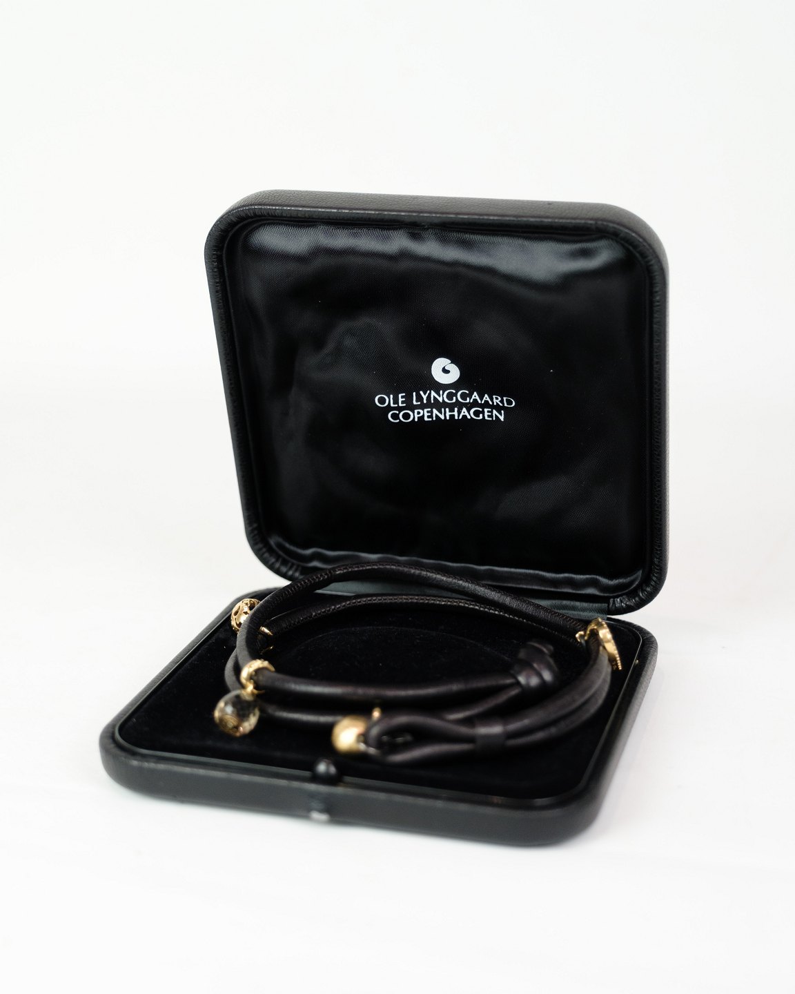 The piece of jewelry combines raw leather with precious materials and sparkling details, which is characteristic of Ole Lynggaard – a Danish jewelry brand founded in 1963, known for its nature-inspired design and exquisite craftsmanship.