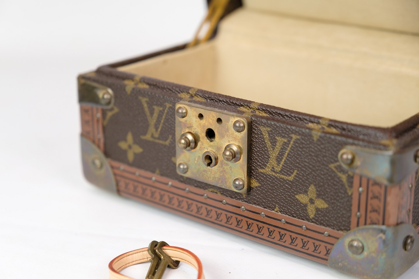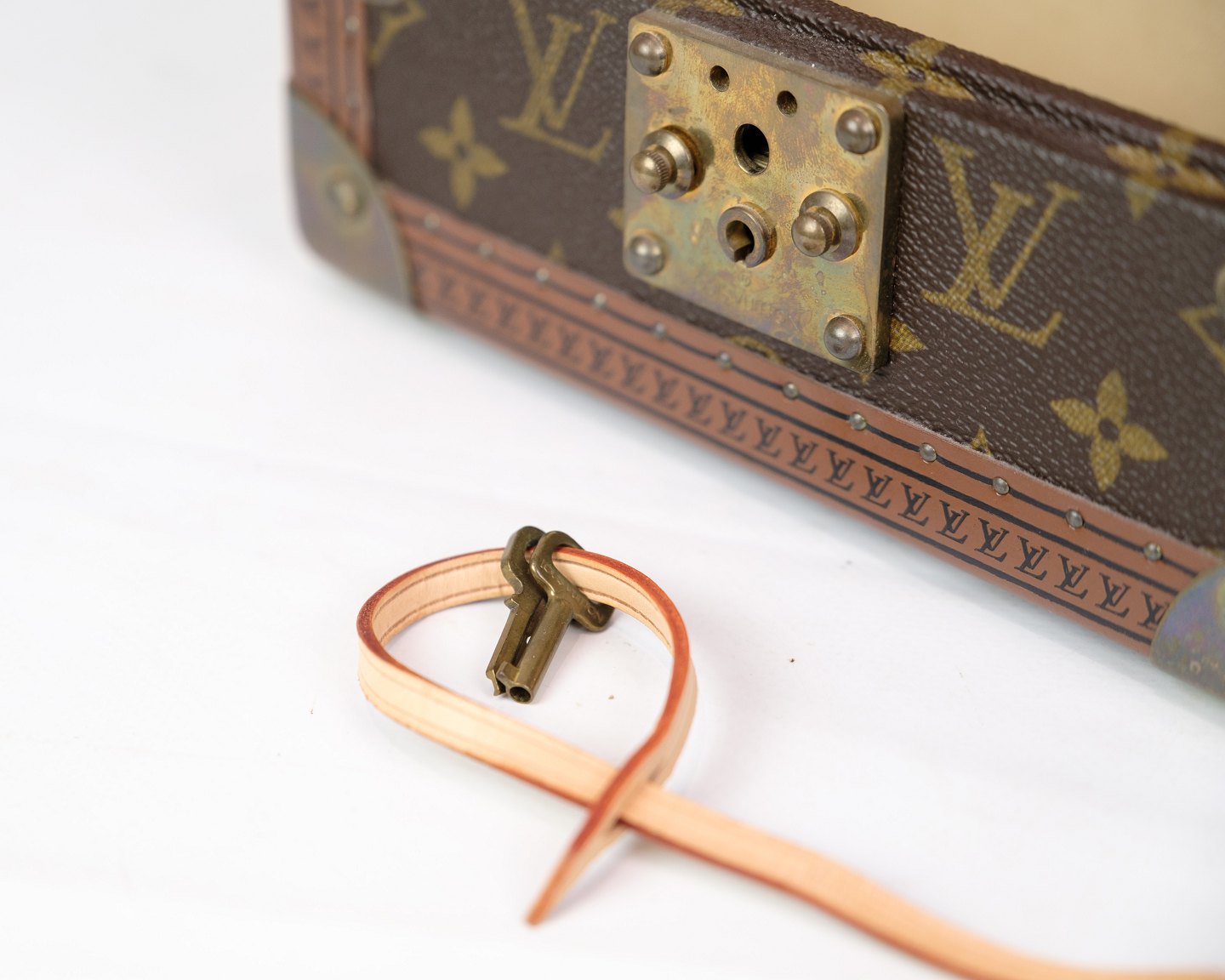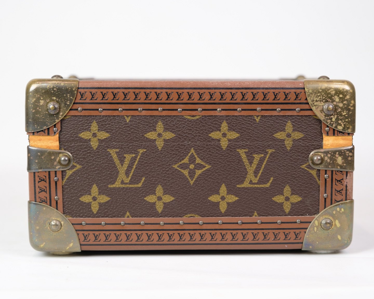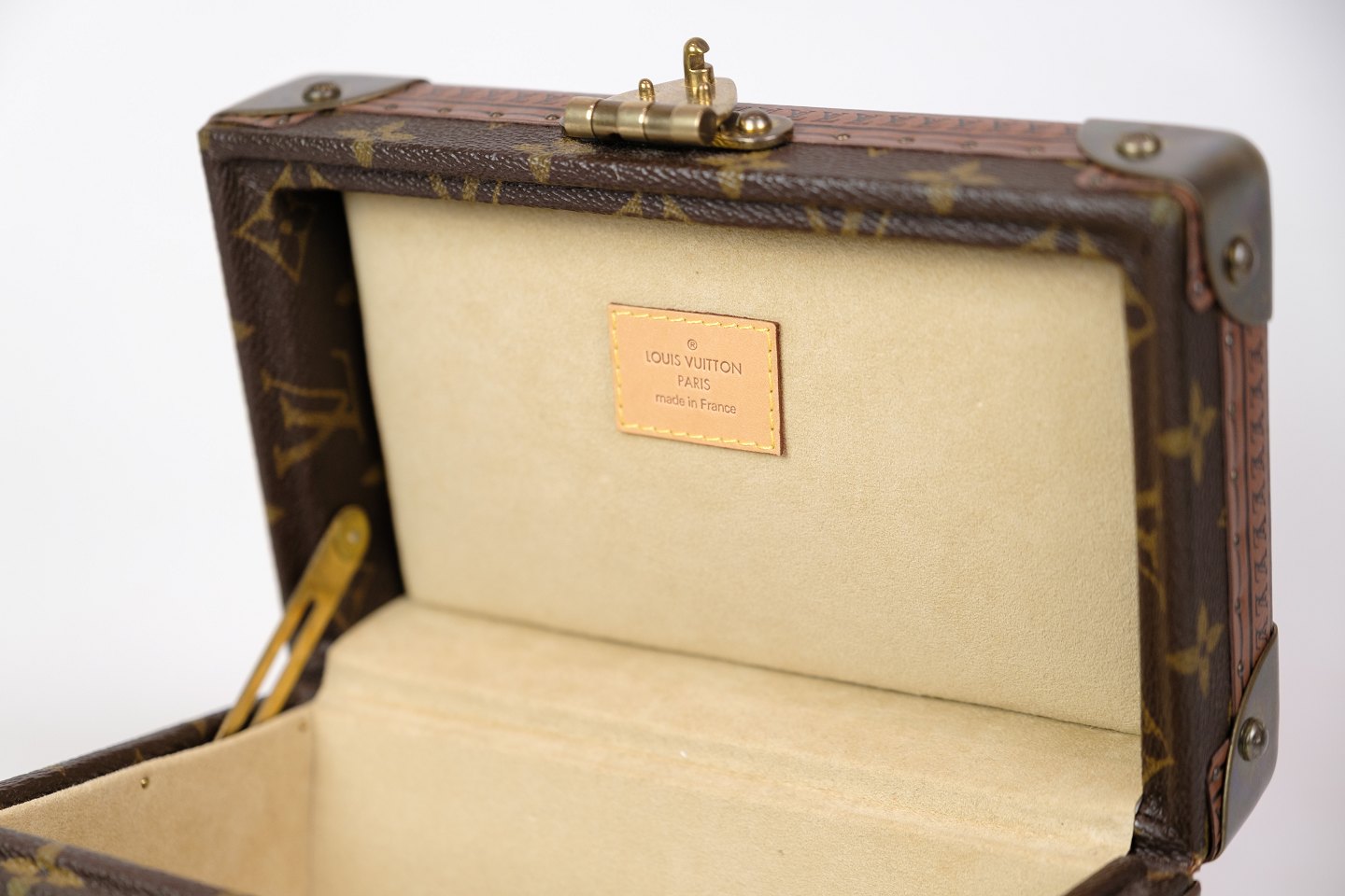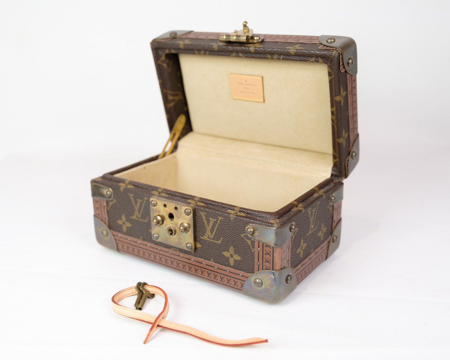 Louis Vuitton Coffret Trésor, kompakt skattekiste i klassisk monogram canvas med patineret messingbeslag og S-lås. Indvendigt beige for. Fremstillet i Frankrig.