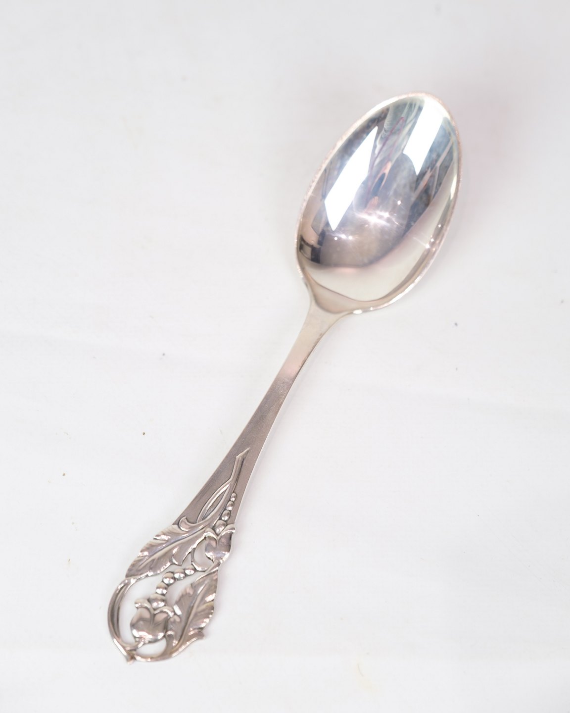 Hand-forged silver spoon with the stamp of C. BH and made of three-tower silver. The handle is decorated with elegant leaf and flower ornamentation
