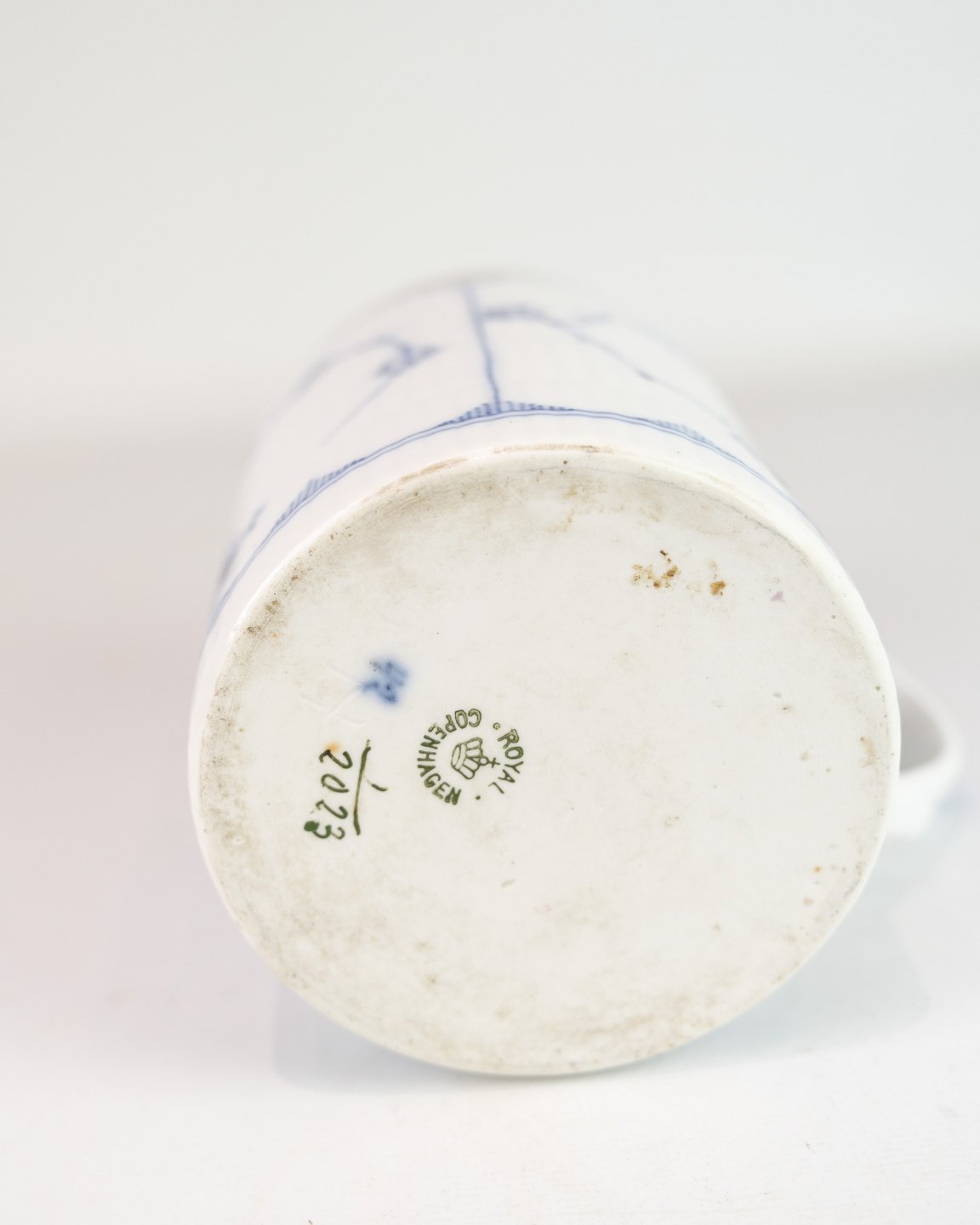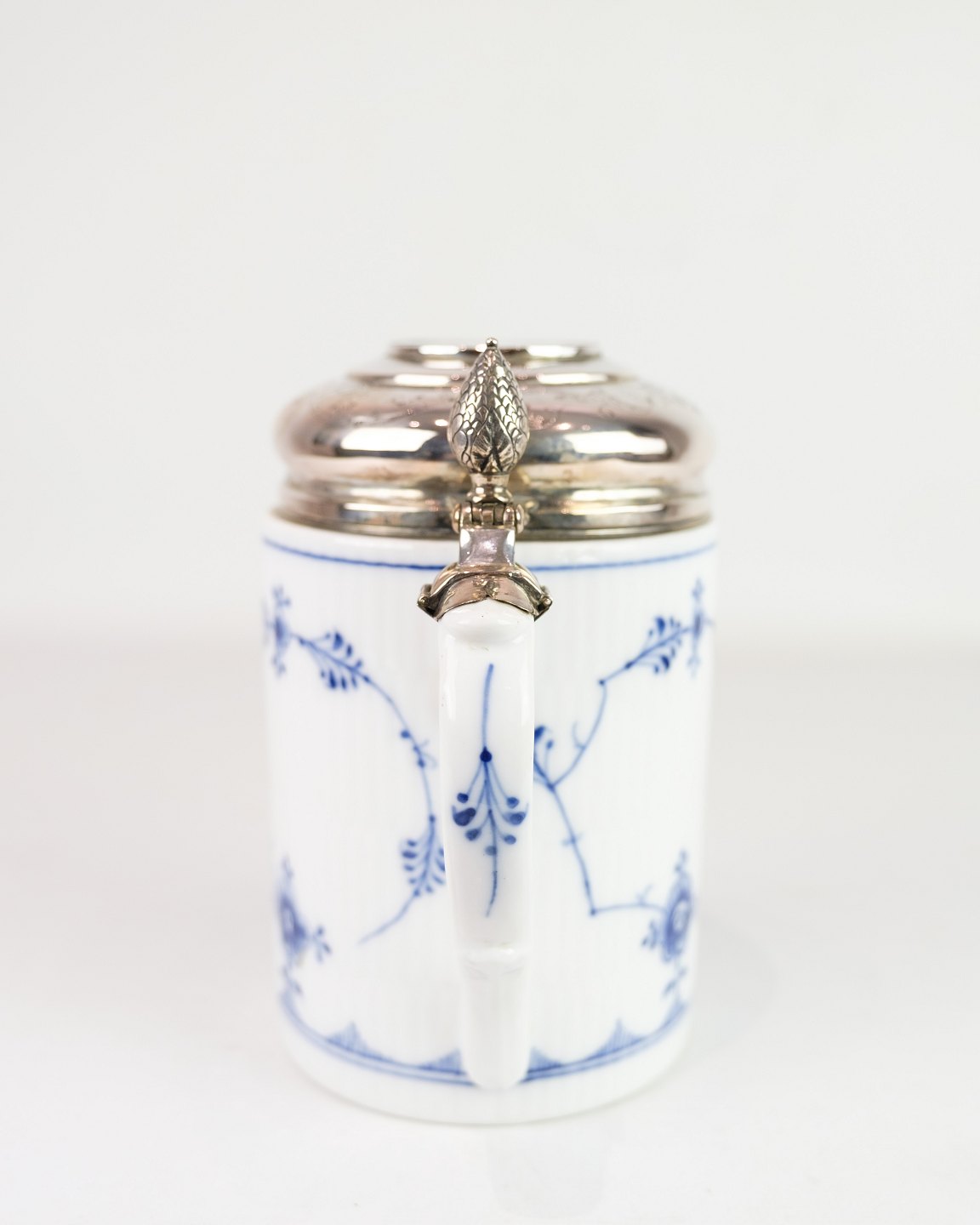 Lidded mug model 1/2023 from Royal Copenhagen, made of porcelain with classic blue fluting fluted decoration and baroque lid in silver. An elegant combination of Danish porcelain art and silversmithing.