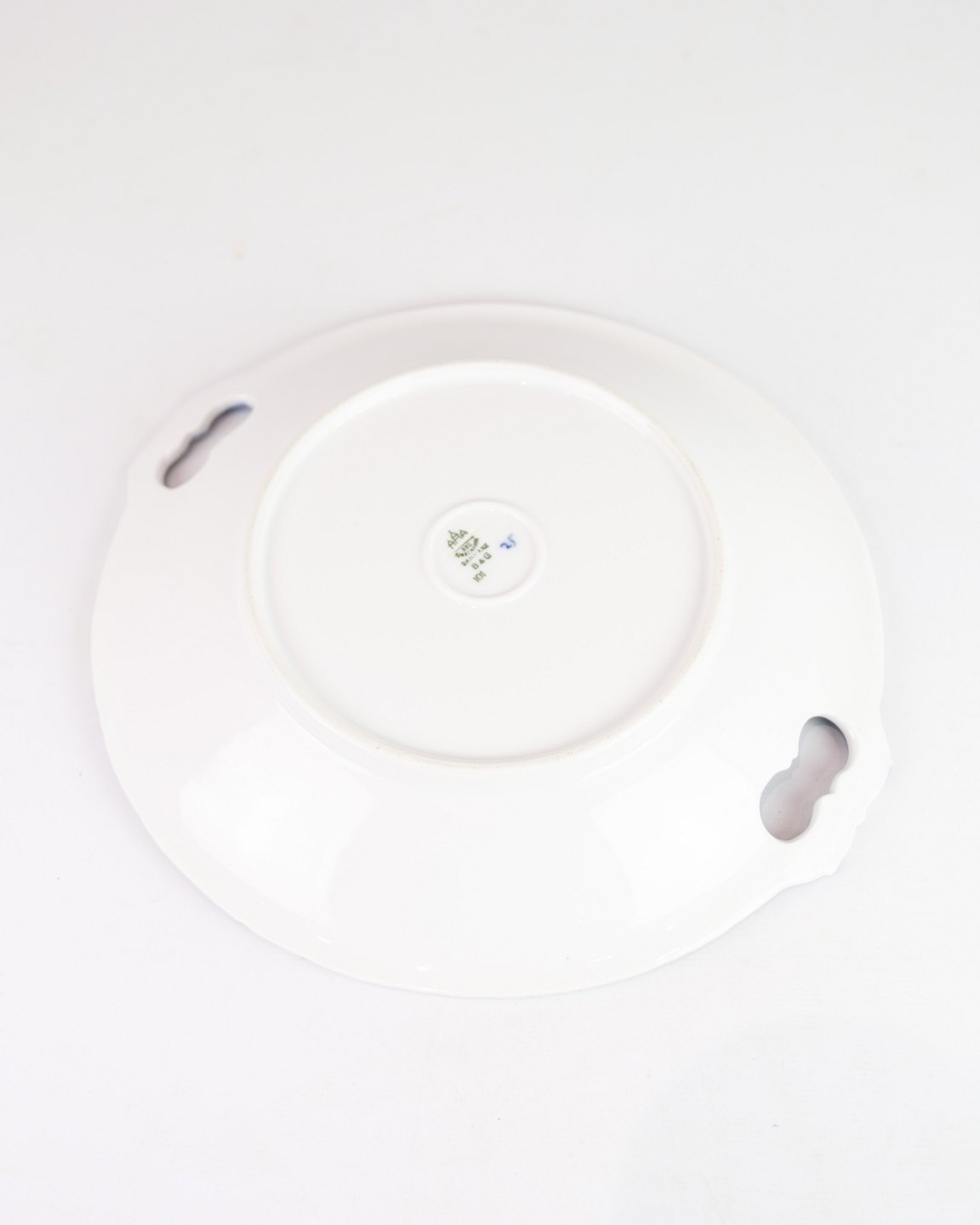 Rundt kagefad med hanke, model nr. 101, Designet af Frederik August Hallin fra Bing & Grøndahl. Dekoreret med Sommerfugl-motiv. Porcelæn med trykt stempel under bunden. Egnet til servering eller samling.
