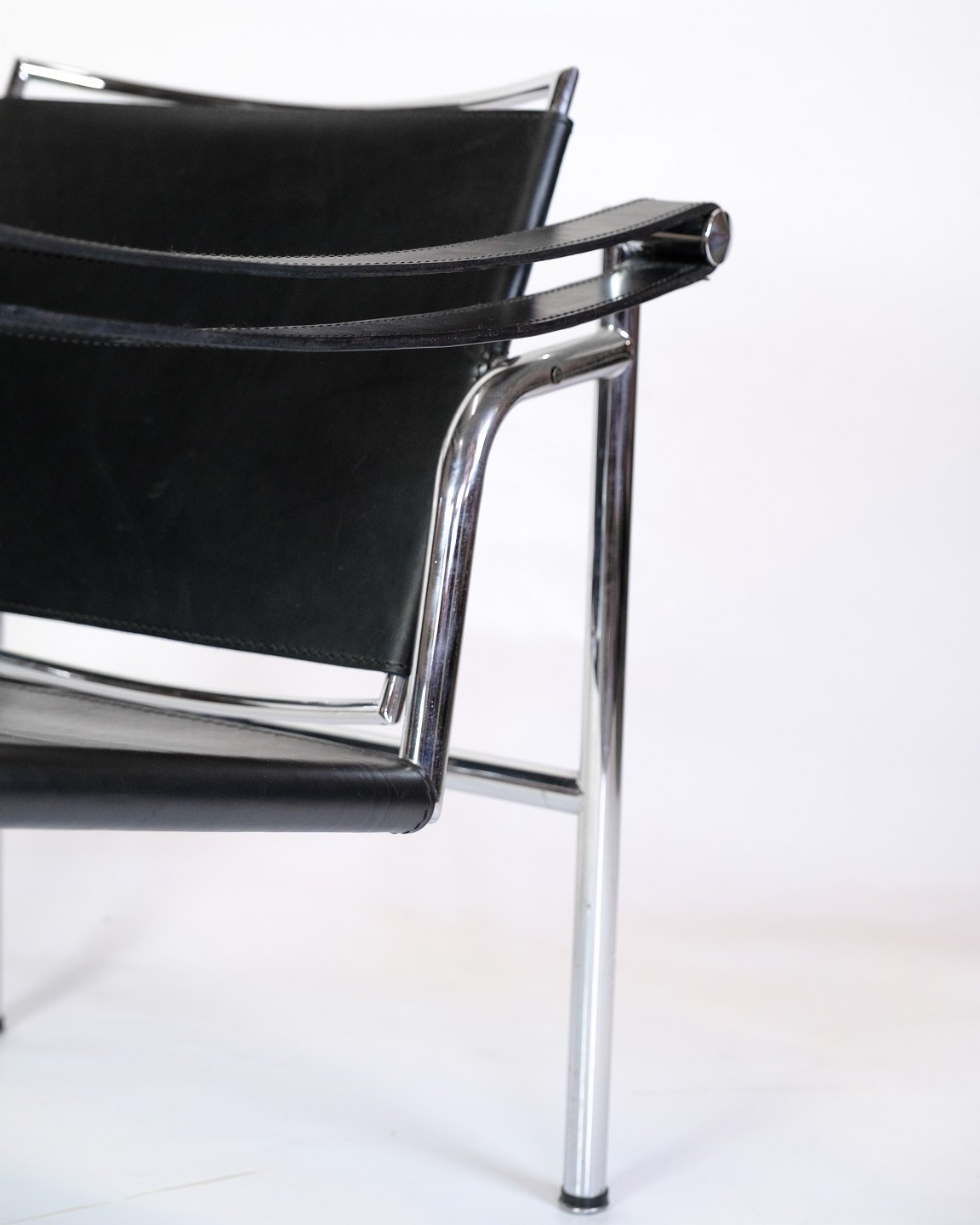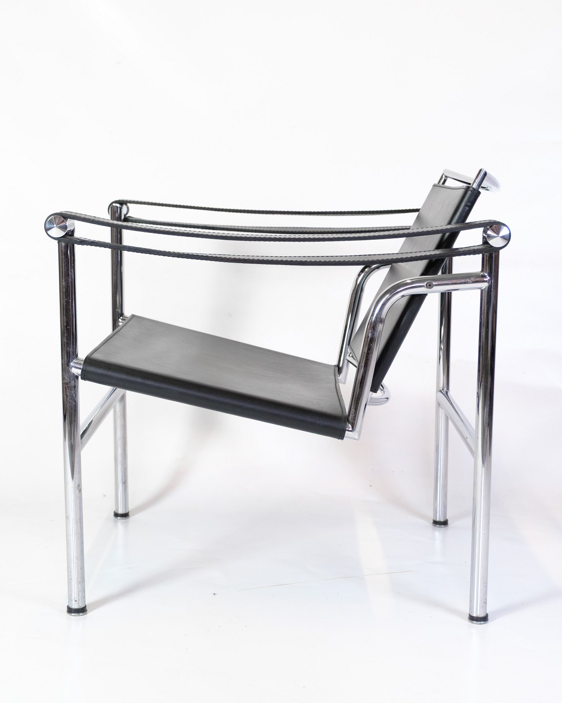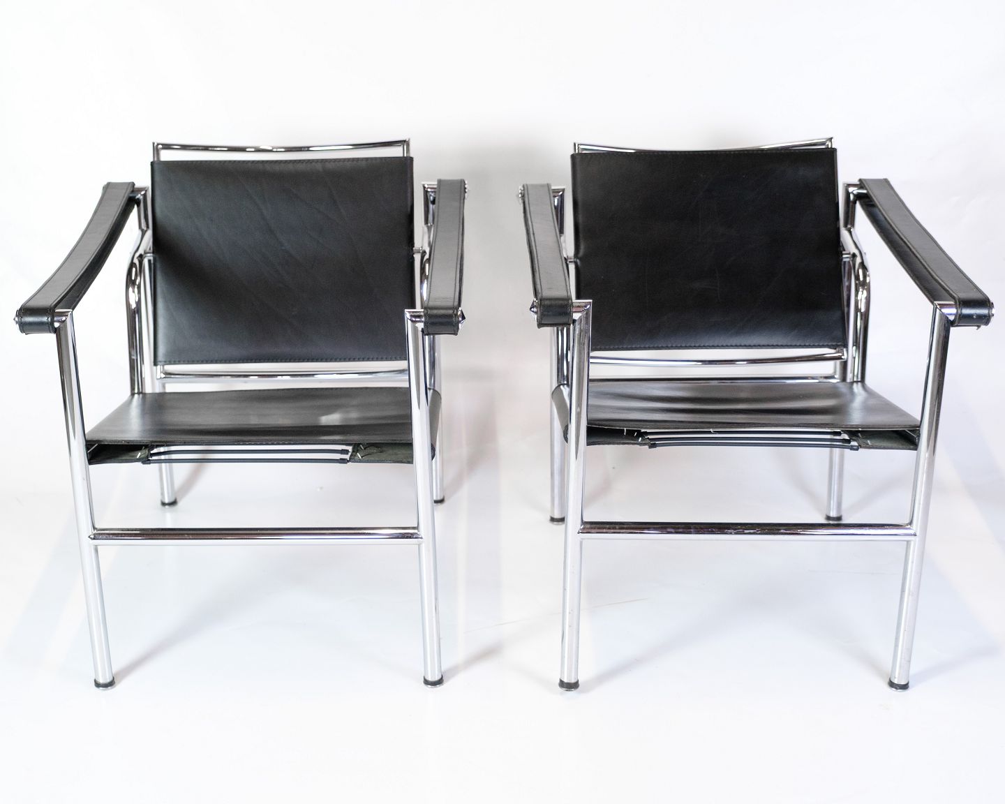 SolgtEt par klassiske lænestole i sort kernelæder med stel af krom. Model LC1 er designet i 1928 af Le Corbusier. Stolens ryglæn er justerbart. De står i meget flot stand i både krom og læder.