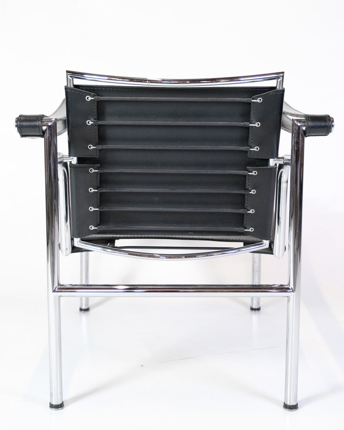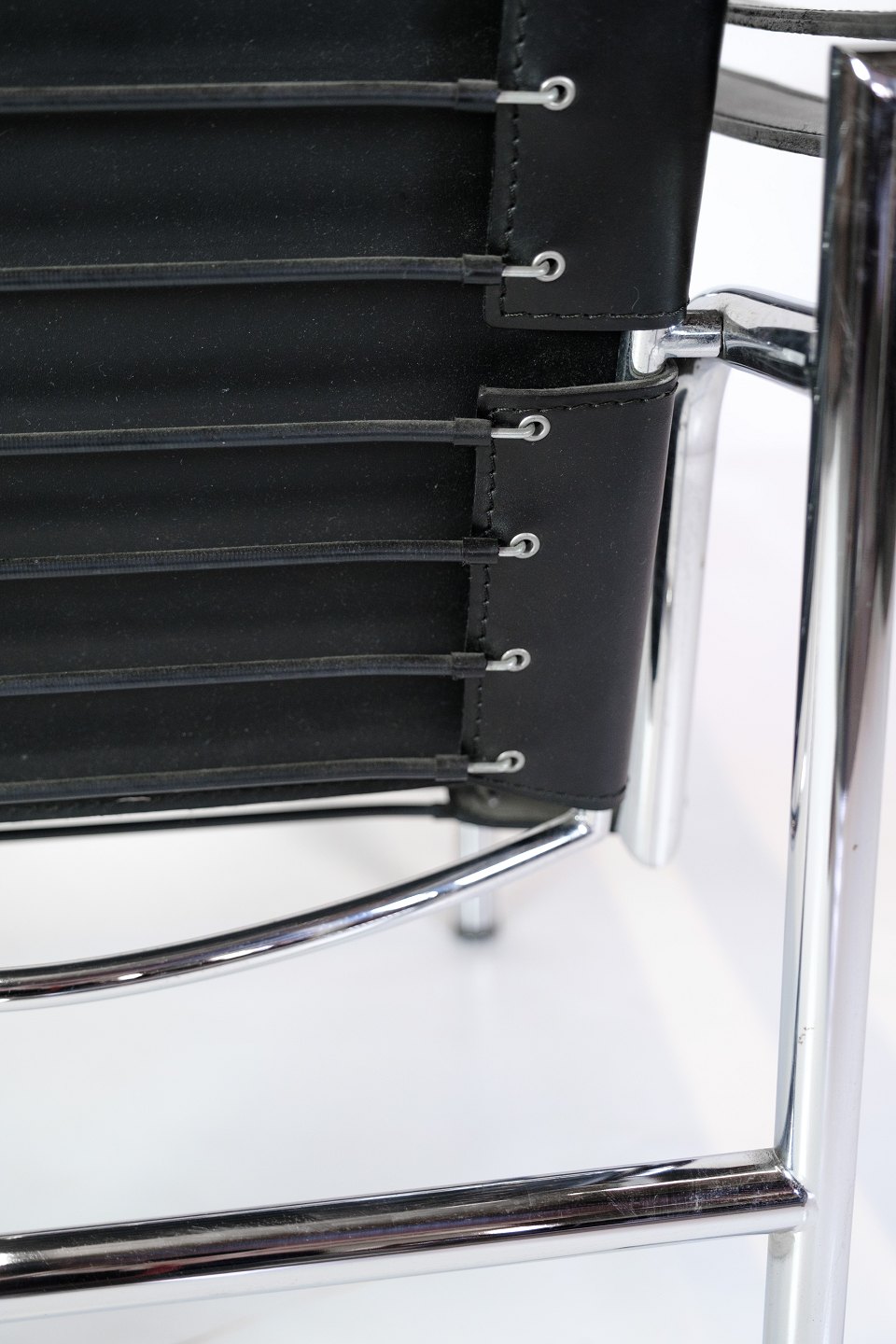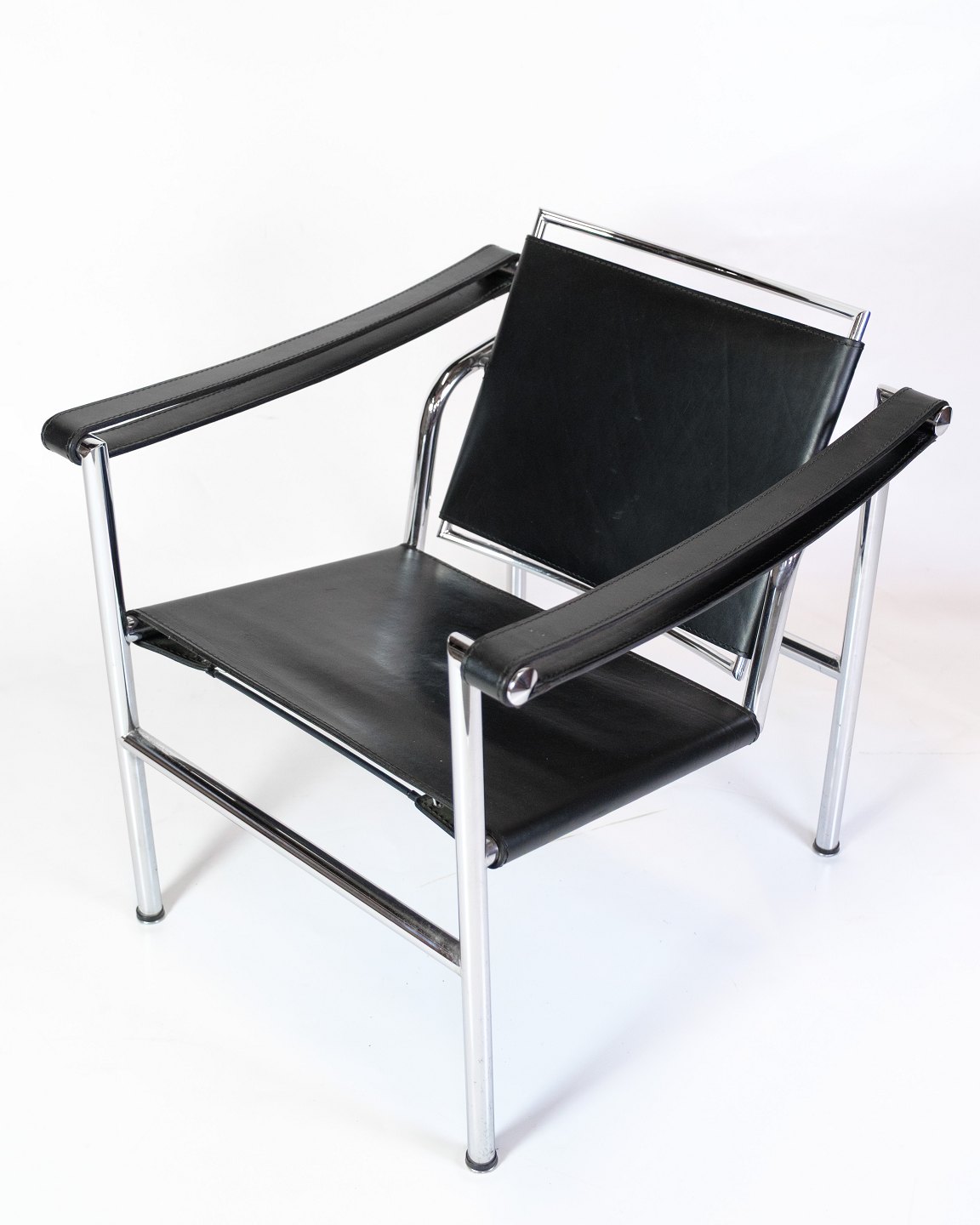 SolgtEt par klassiske lænestole i sort kernelæder med stel af krom. Model LC1 er designet i 1928 af Le Corbusier. Stolens ryglæn er justerbart. De står i meget flot stand i både krom og læder.