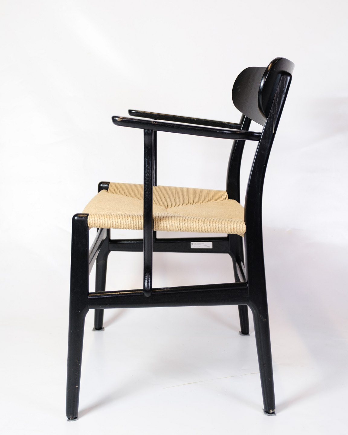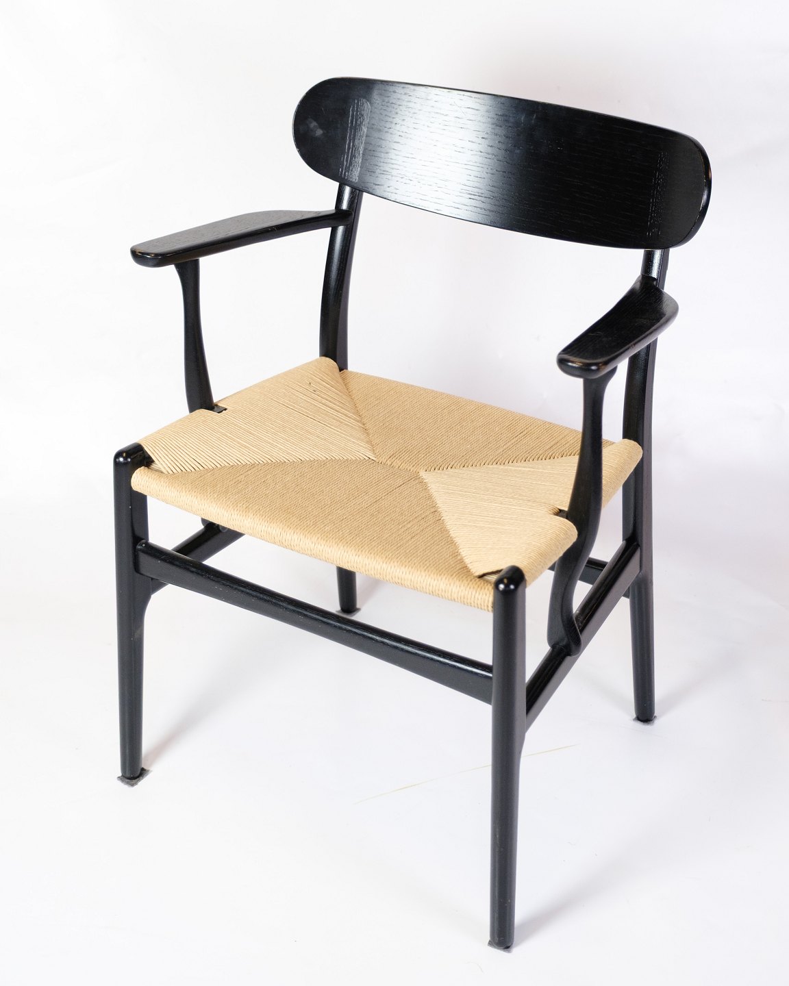 SoldArmchair with arms, model name CH26 made of black oak with light paper yarn made by Carl Hansen & Son. The CH26 chair is a design by Hans J. Wegner from the 1950s and is actually one of the more complicated to produce based on the curved shapes. During the release of the chair, which was also Wegner's debut Collection in their collaboration, Wegner lived with the family behind Carl Hansen & Son to follow the process. Very few copies were sold at the time due to the price, which was driven by the complex production. Today, newer machines have been used to make the chair, which has become one of Wegner's classics.