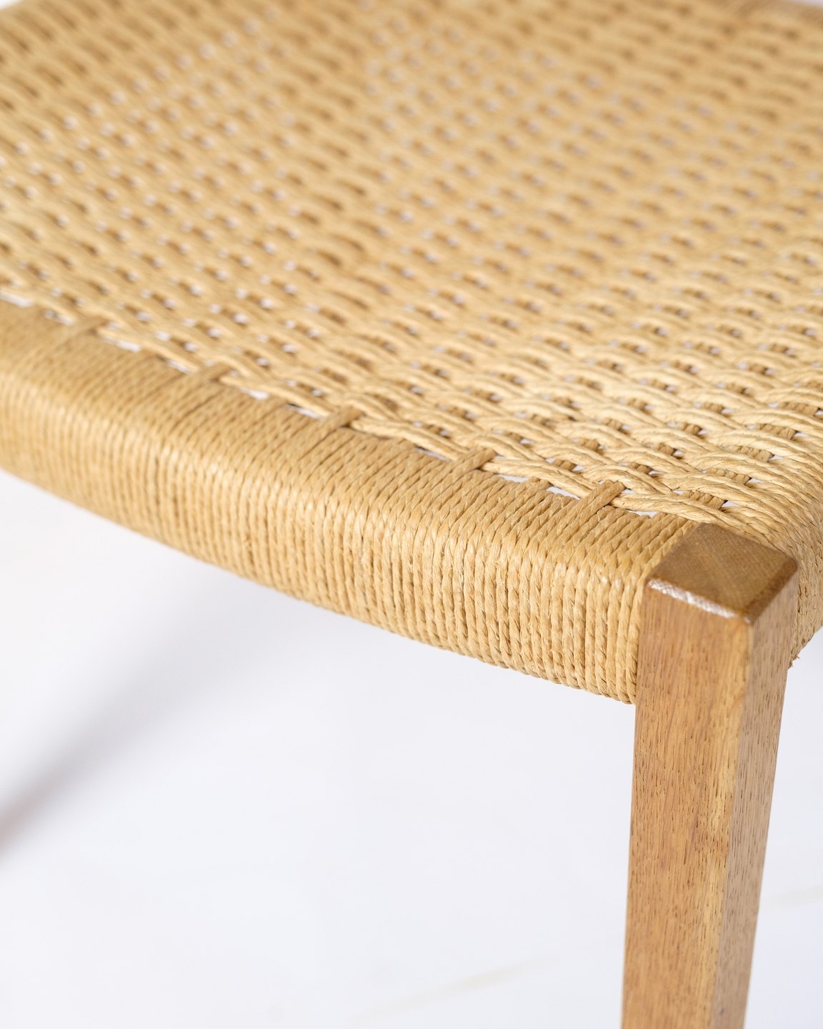 Set of five dining chairs, model 401, designed by Jørgen Henrik Møller for JL Møllers Møbelfabrik in the 1960s. Made of solid oak with hand-woven flat wicker seats. Classic Danish furniture design with a focus on quality and craftsmanship. The chairs are in very good condition.
