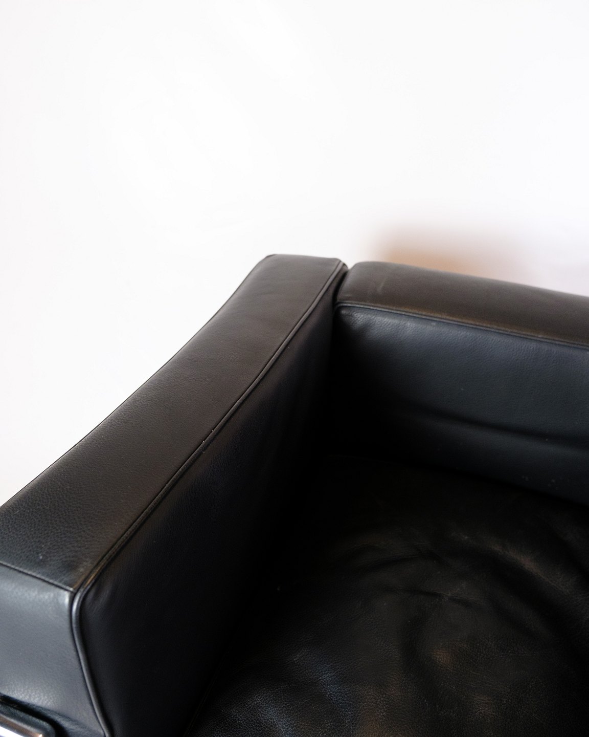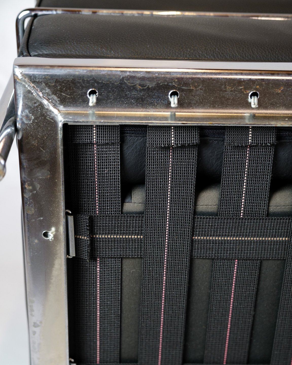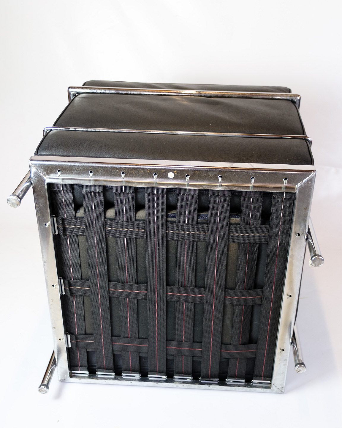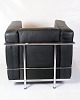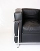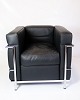 Le Corbusier LC2 lænestol, designet i 1928 af Le Corbusier, Pierre Jeanneret og Charlotte Perriand, produceret af Cassina. Stolen har en ramme i forkromet stålrør og polstring i sort læder.