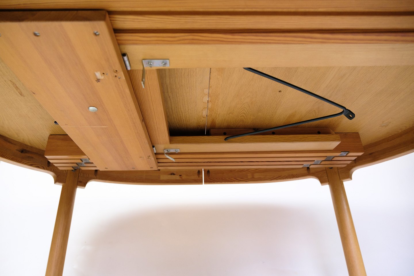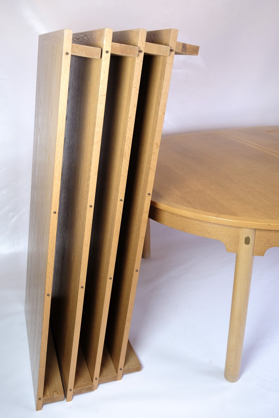 SoldOval dining table with extension from the "Øresundsserien", model 140, designed by Børge Mogensen and produced by Karl Andersson & Söner in the 1950s. The table is made of oak with solid oak legs mounted with brass fittings. It comes with four extension leaves and support legs for extra stability when fully extended.