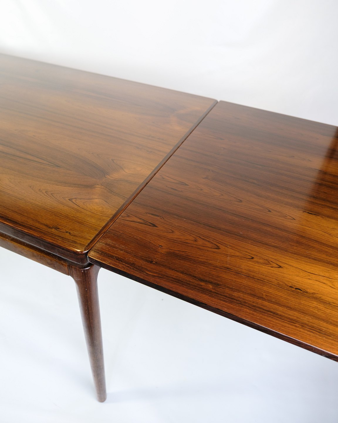 Spisebord med udtræk i palisander, designet af Johannes Andersen og produceret af Chr. Linnebergs Møbelfabrik i 1960’erne. Bordet har integreret udtræk skjult i sargen for et elegant og sammenhængende udtryk. Johannes Andersen (1903–1991) er kendt for sit organiske formsprog og brug af ædle materialer. Et klassisk eksempel på dansk mid-century design.