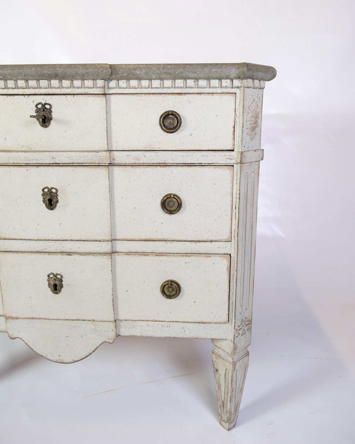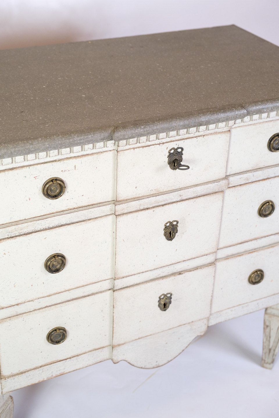 Gustavian chest of drawers from the 1840s with three drawers, painted grey in a classic style. Top made of marbled wood, giving an elegant expression. Swedish origin with period carvings and details. An authentic piece of furniture with both function and decorative value.