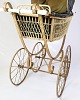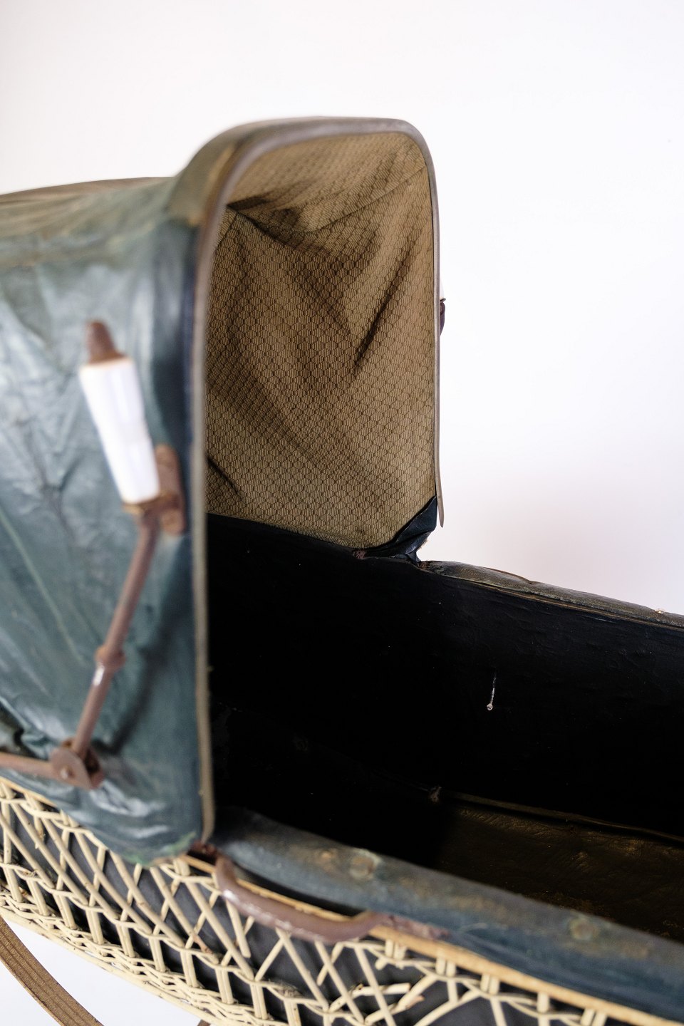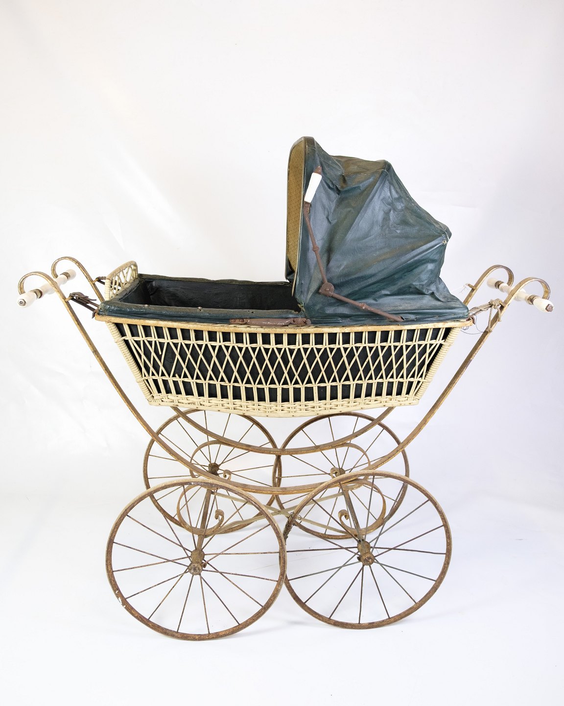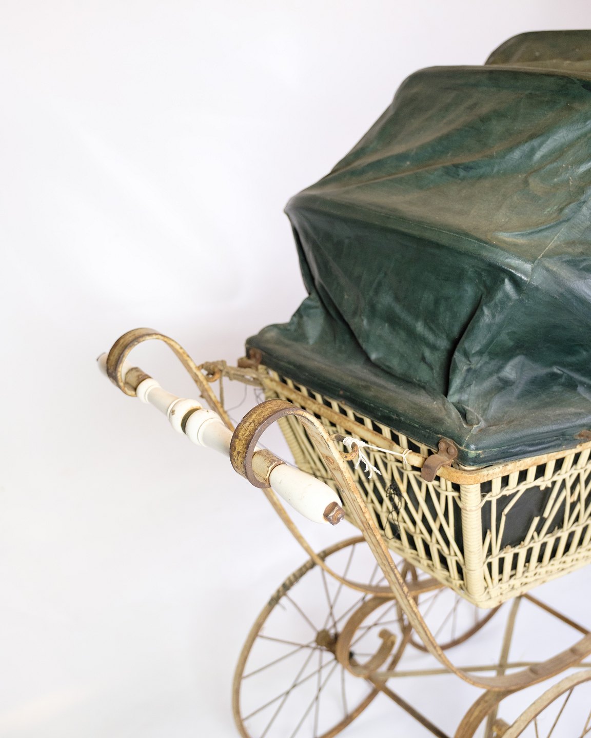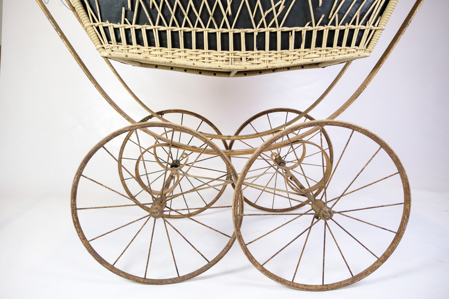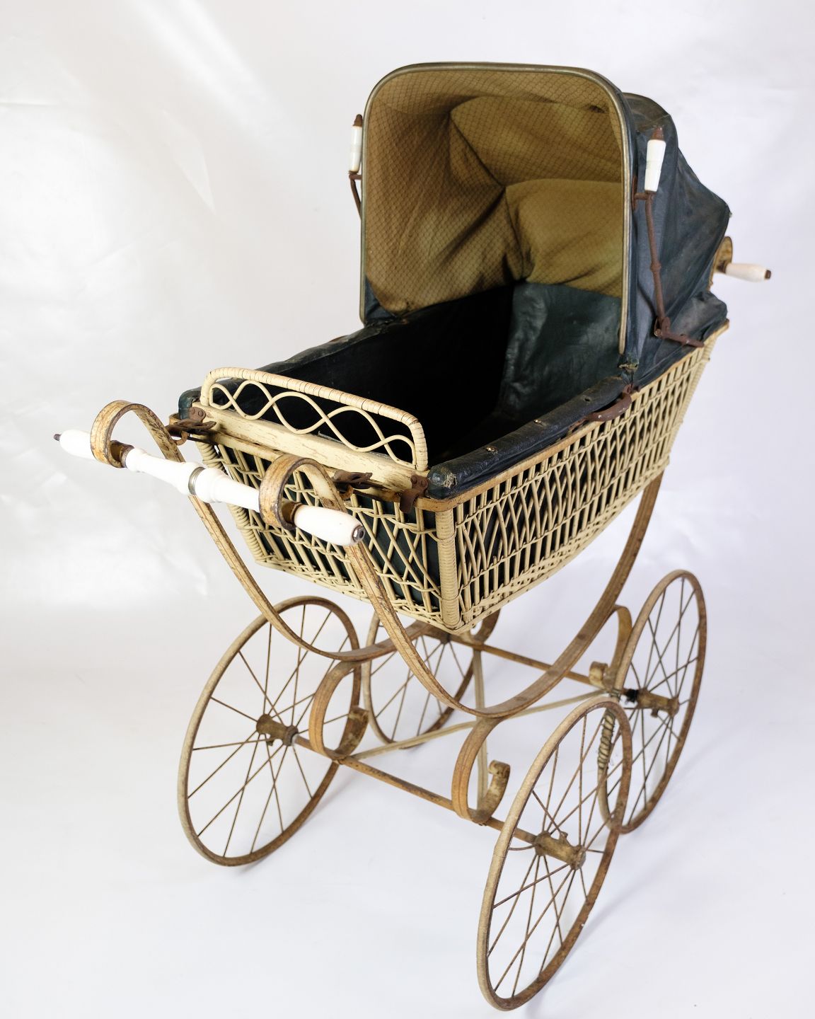Antik barnevogn fra omkring år 1900 med flettet kurv og original kaleche. Vognen står på et smukt buet metalstel med store egerhjul og hvide håndtag. Klassisk og dekorativ barnevogn, ideel som samlerobjekt eller vintage indretning.