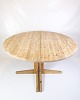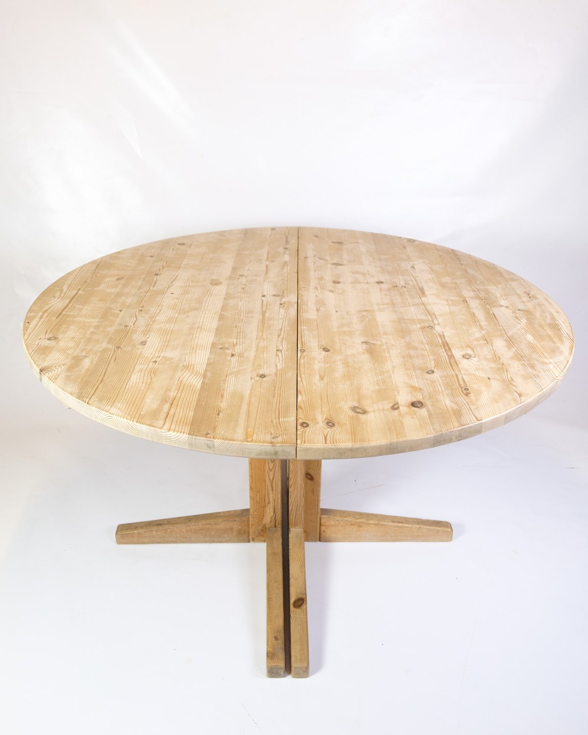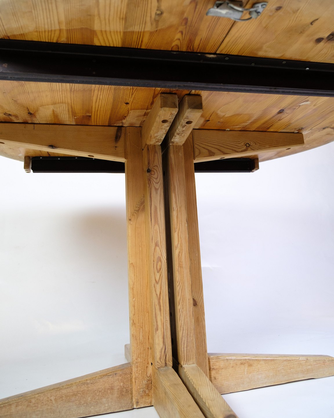 SoldRound dining table with extension in solid pine from the 1970s. Made with a three-legged frame and natural surface. The table comes with two extension leaves that provide extra space as needed. A solid and functional table with classic 70s design.
