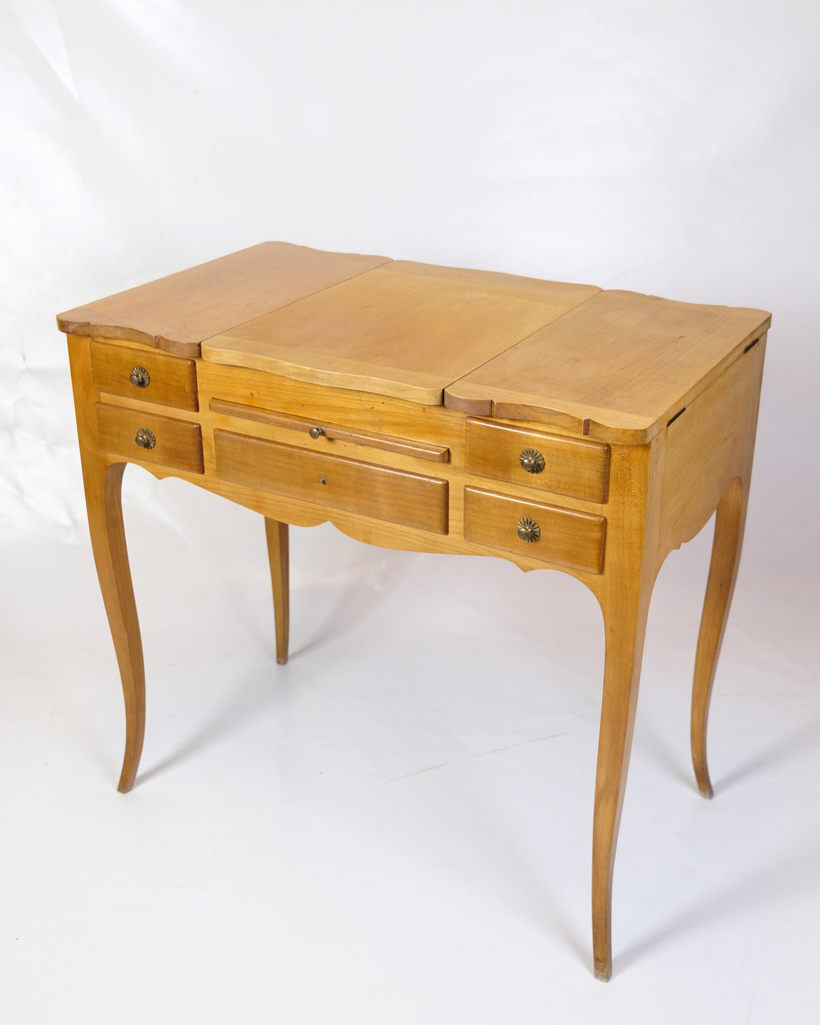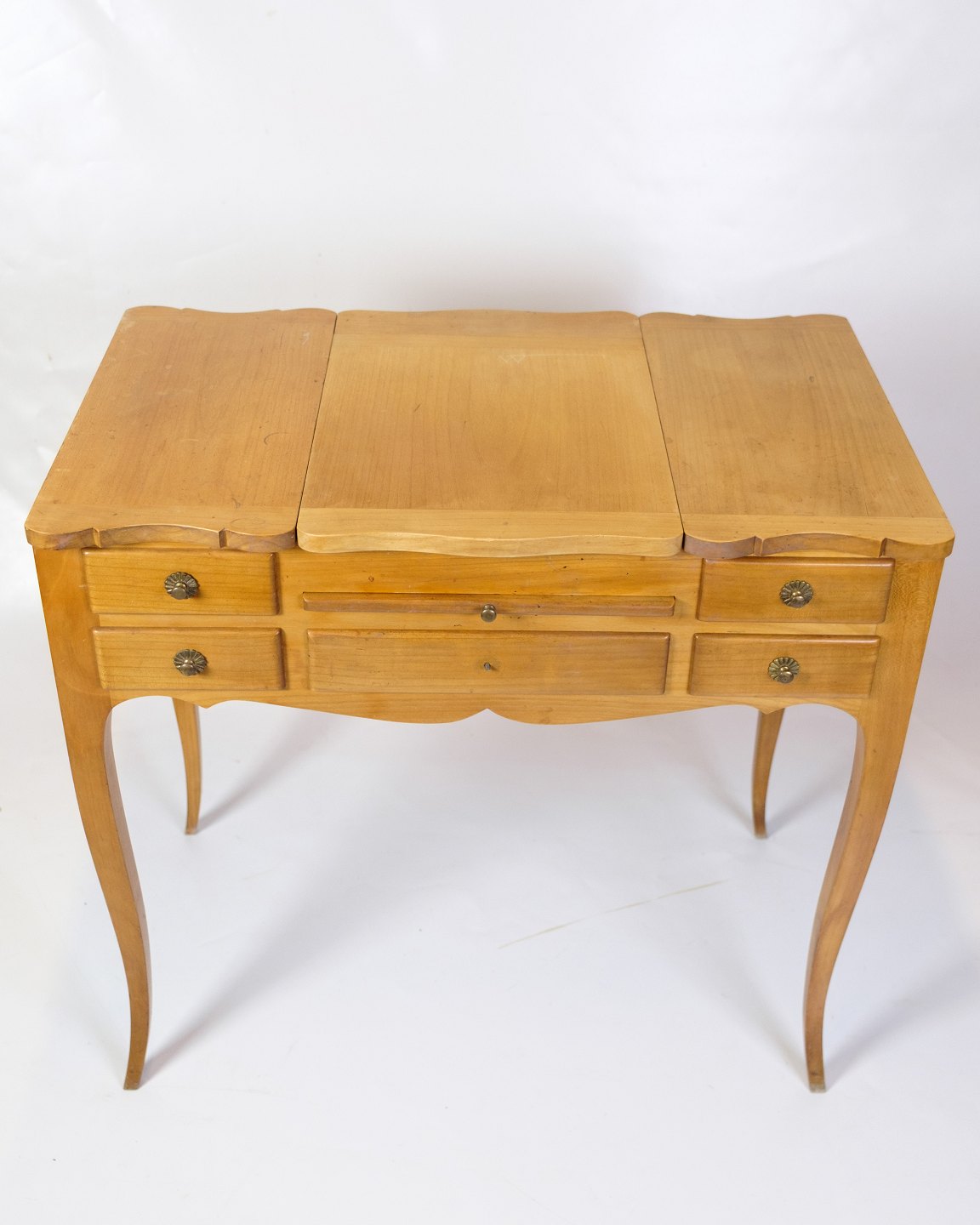 Dressing table with built-in drawers and mirror, made of light mahogany and designed in the Louis XV style from the 1920s. The table has curved legs, decorative carvings and classic details that characterize the period. An elegant and functional dressing table.