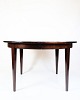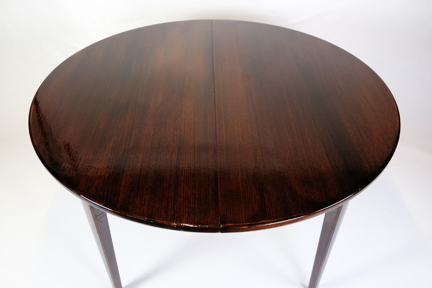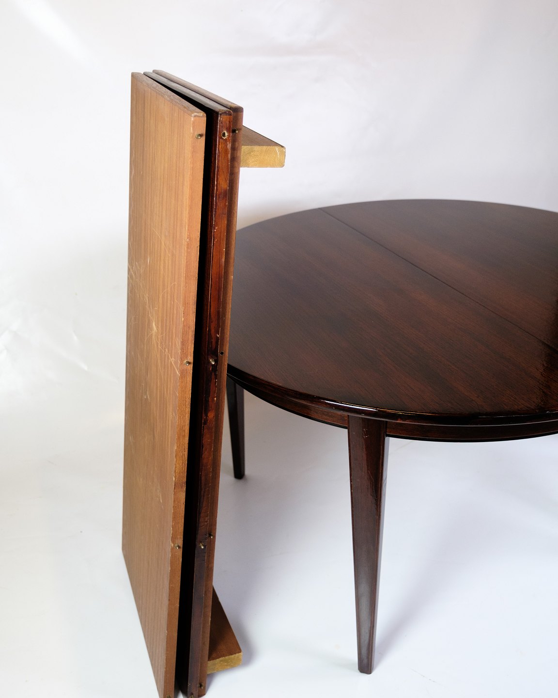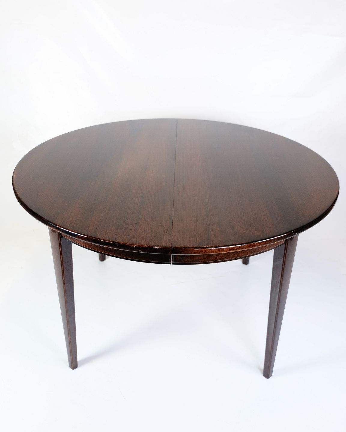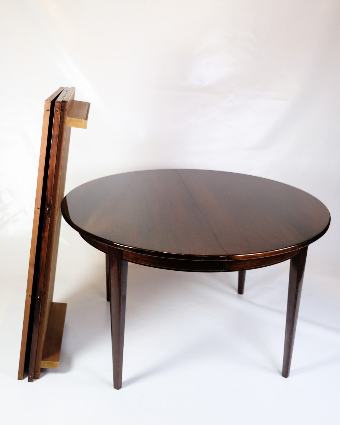 Round dining table, model 55, designed by Omann Junior in the 1960s. Made of mahogany with classic Danish design and focus on solid craftsmanship. The table comes with three extension leaves, which allows for flexible expansion, perfect for both everyday use and larger gatherings.