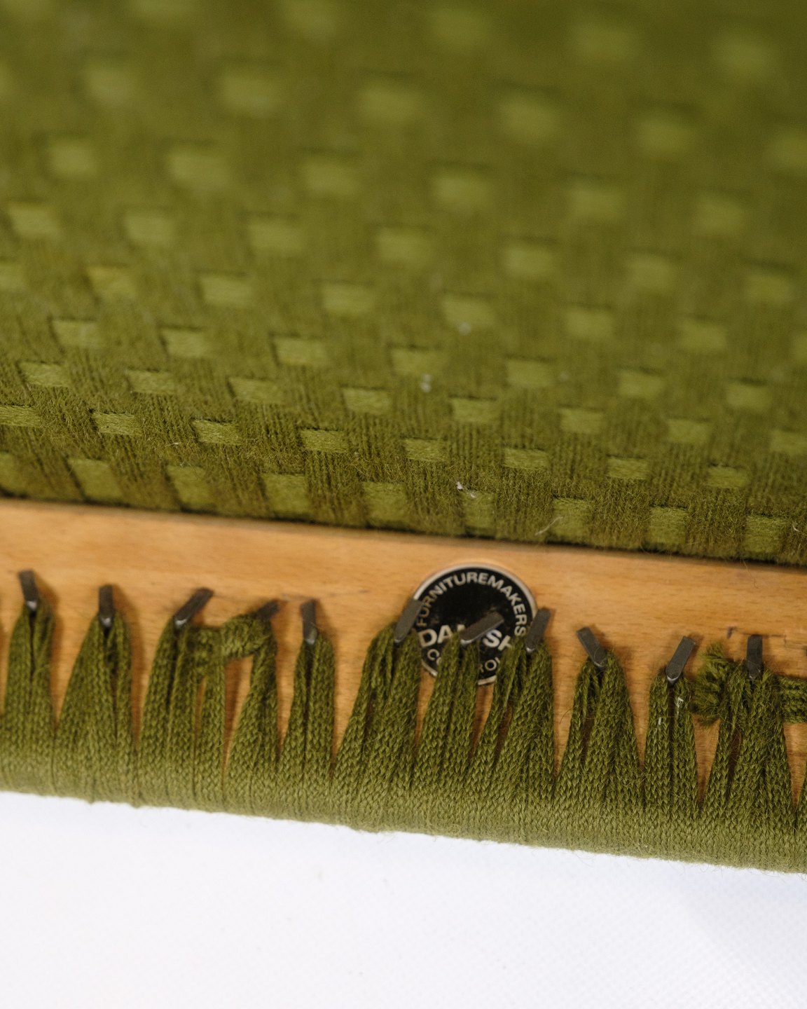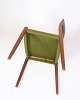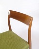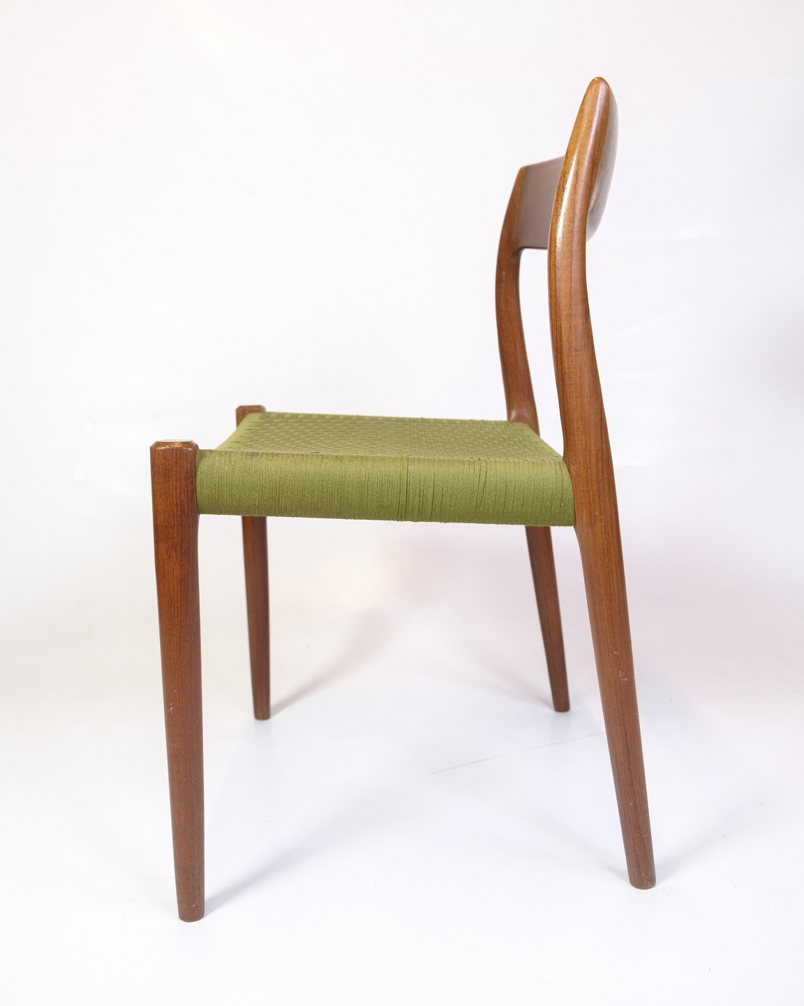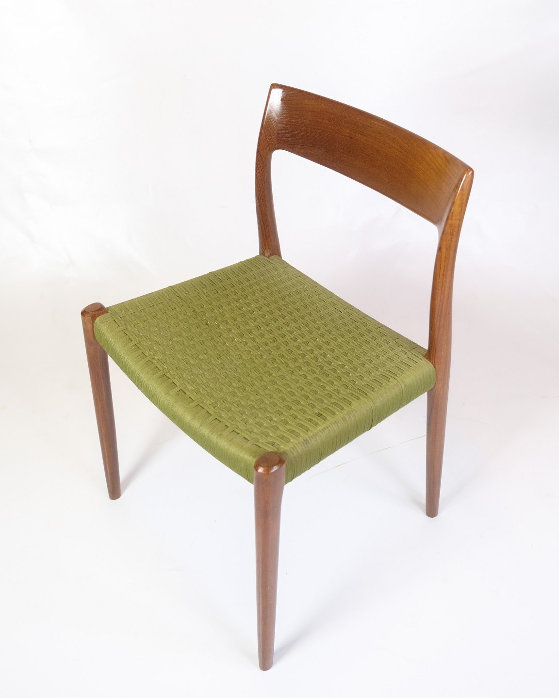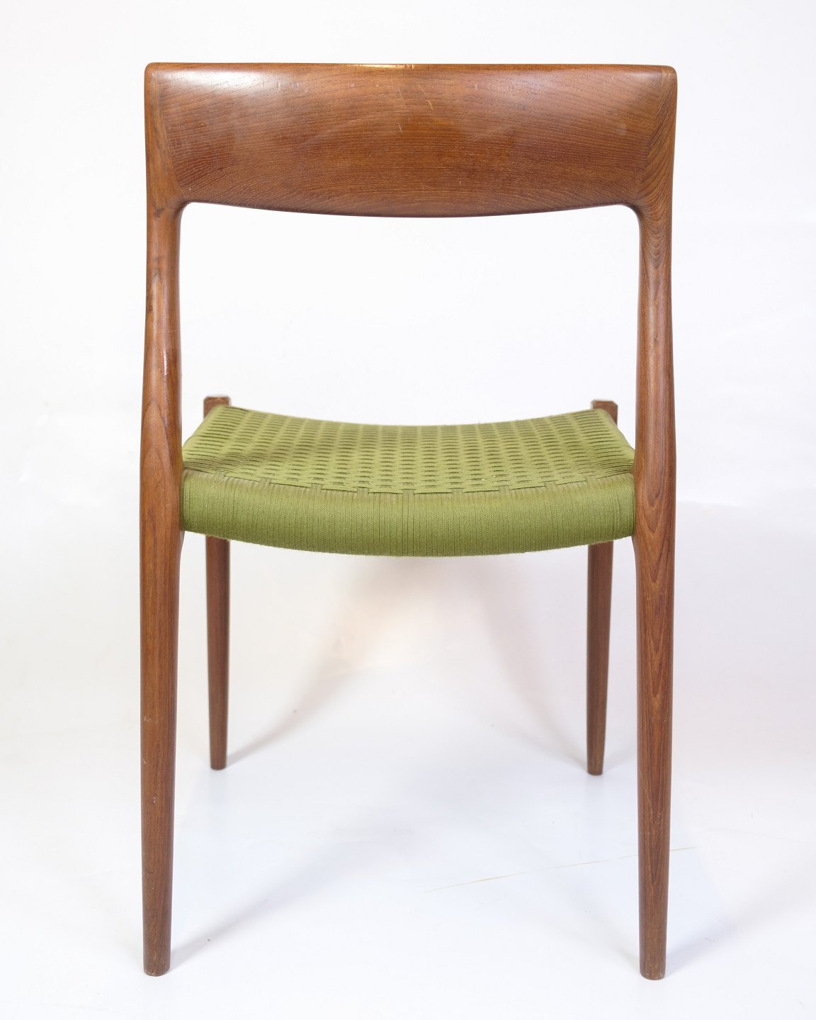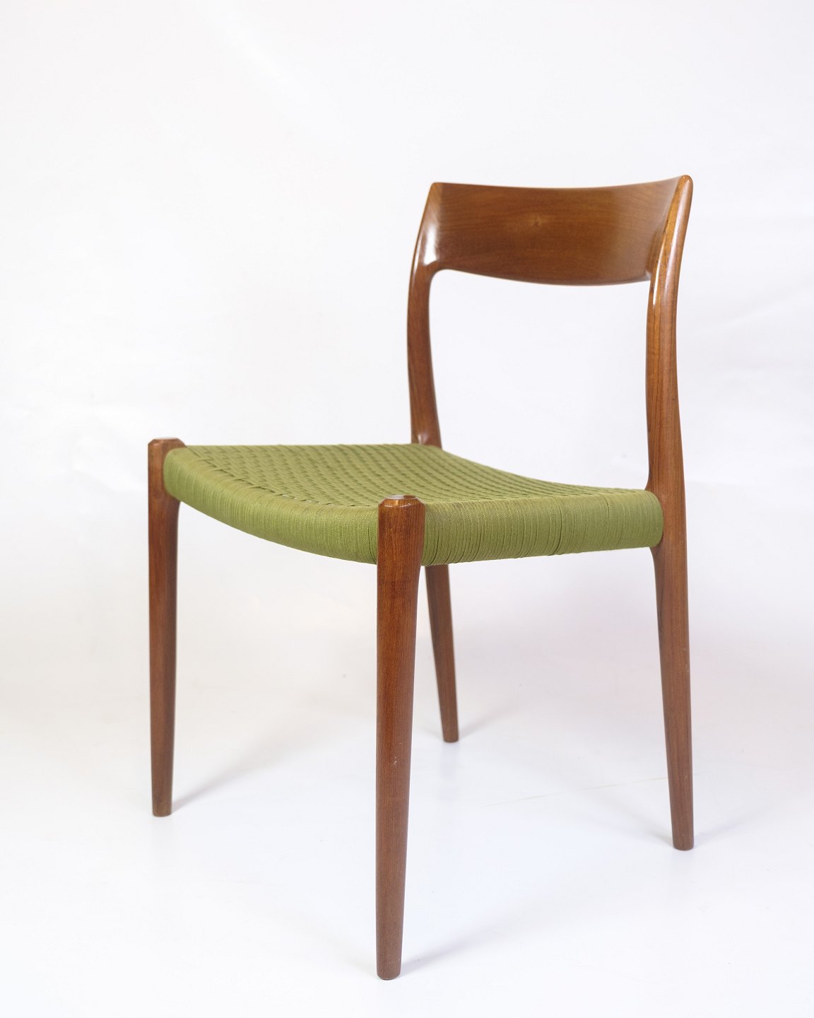 Six dining chairs designed by Niels O. Møller in the 1960s. Model 77 is made of teak with seats in green paper wicker. The chair's simple lines and curved backrest provide good seating comfort and a clear design language that has made Møller's design a permanent part of Danish furniture history. A solid choice for both classic and modern interiors.