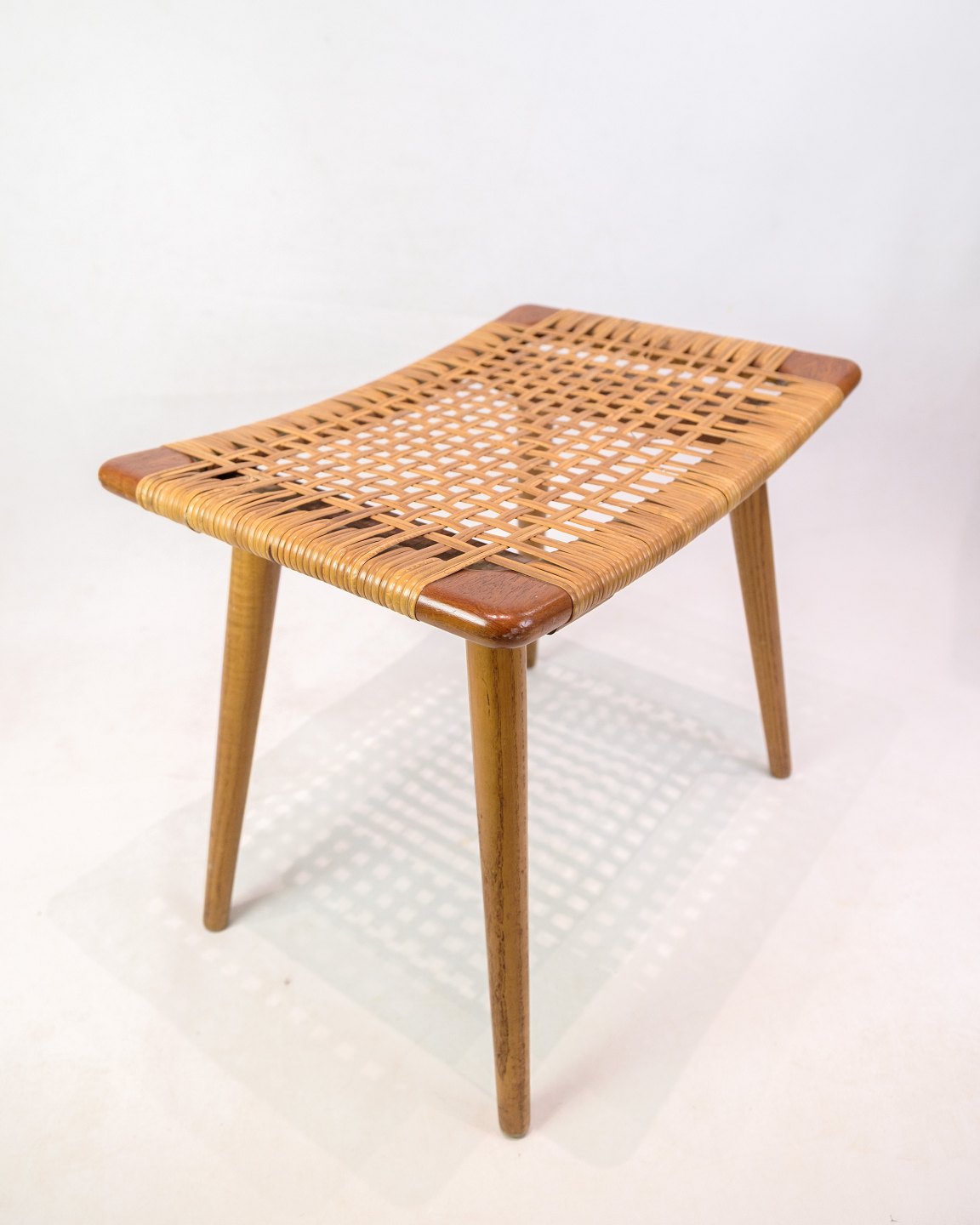 A classic Danish design stool from the 1960s with a frame made of teak and a seat in sage wicker. The stool is in beautiful used condition with original seat.