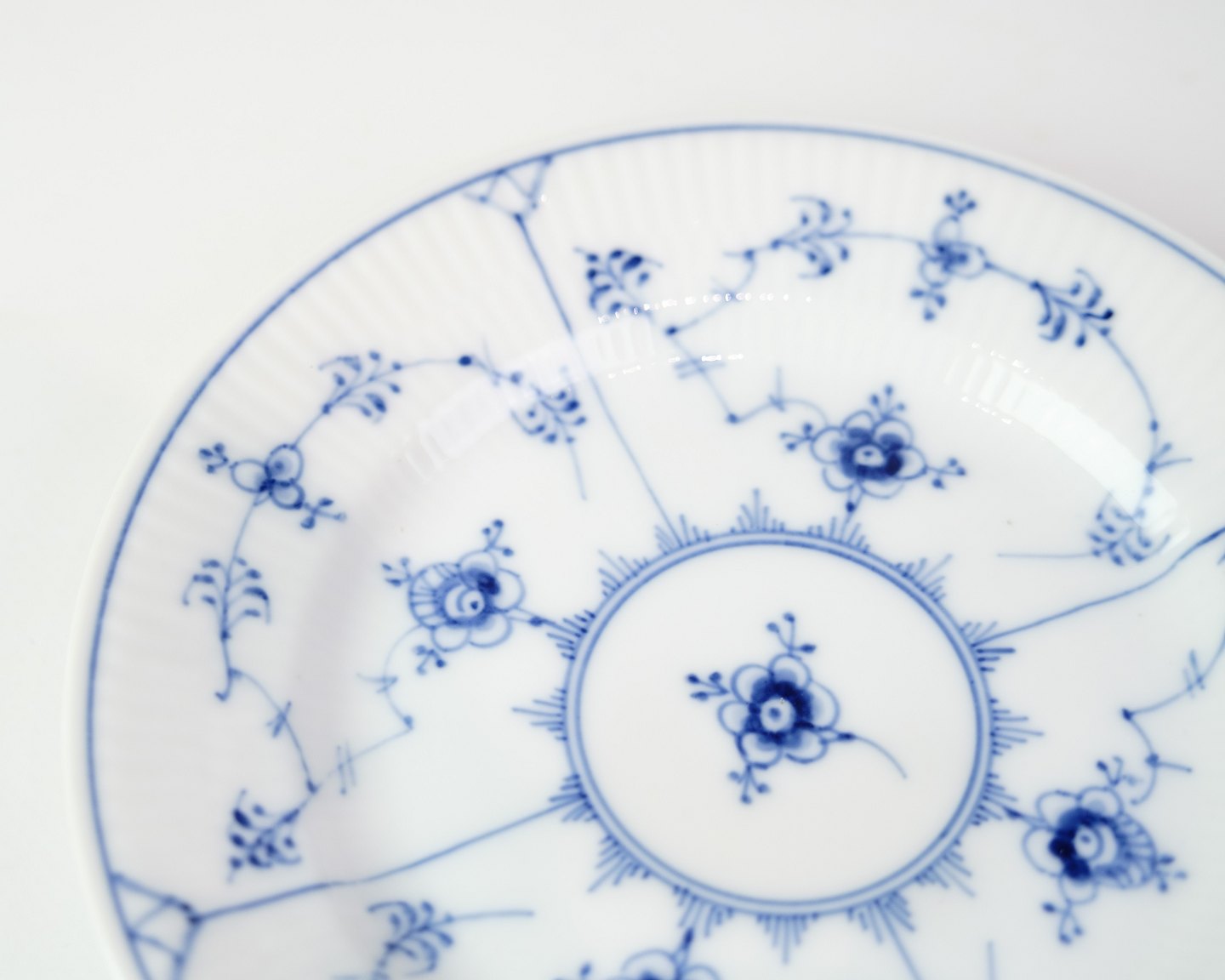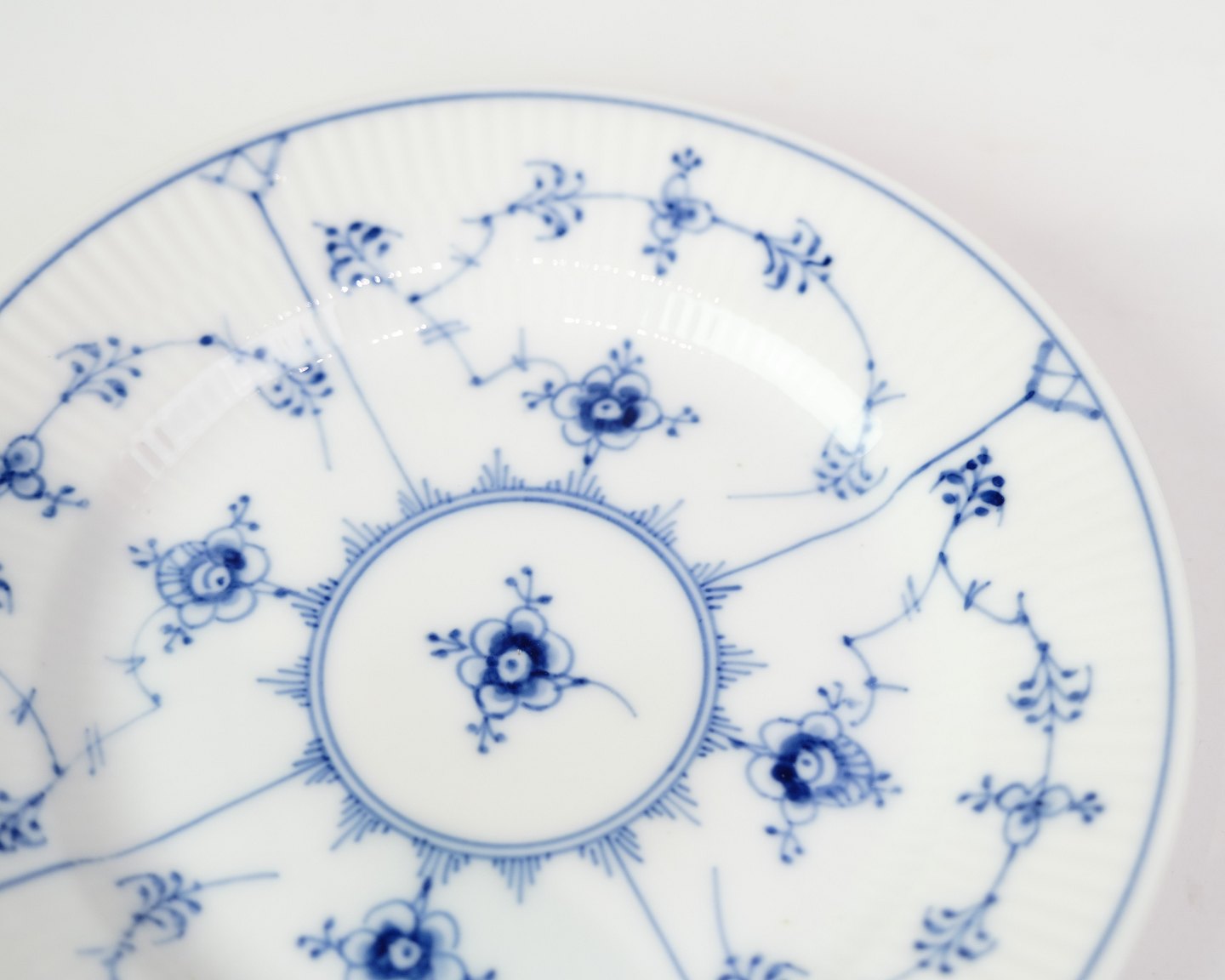 Kagetallerken fra Royal Copenhagen i musselmalede riflet mønster. Model No. 1/181 og er håndmalet i koboltblå på hvidt porcelæn med de berømte riflede detaljer. En fin størrelse til servering af kage, dessert eller småretter